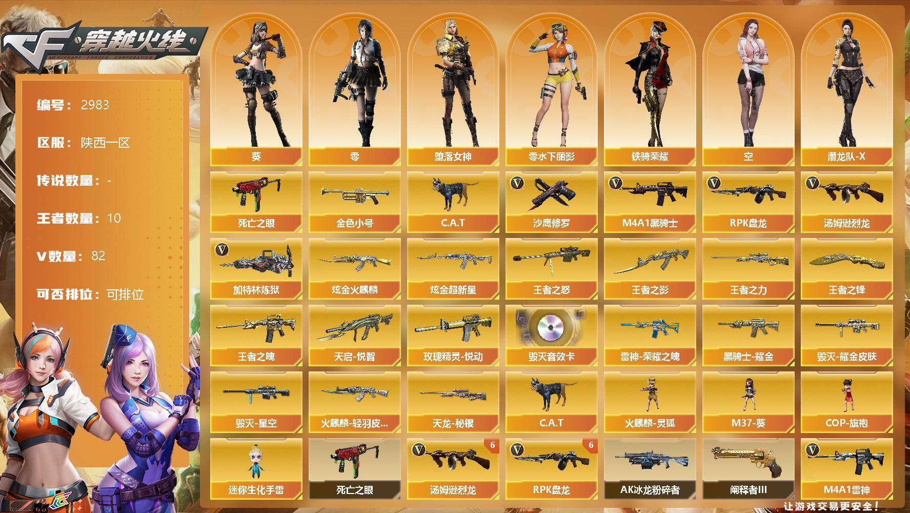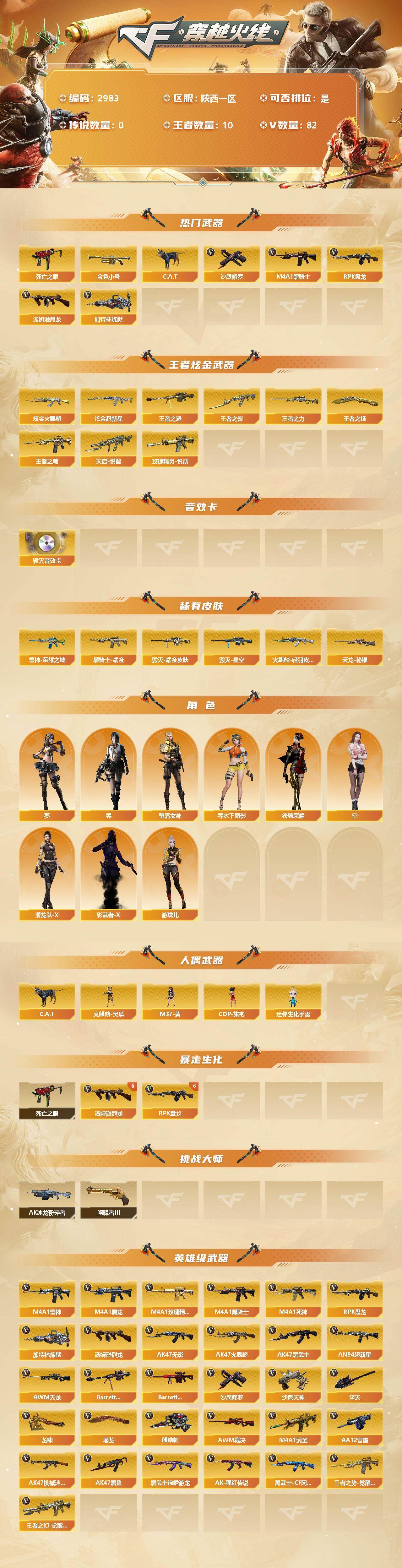 [13336906]陕西一区-82V-10王者-2炫金 【热门武器】:死亡之眼*3,金色小号,C.A.T*2,M4A1-黑骑士*2,汤姆逊-烈龙*7,RPK-盘龙*6,加特林-炼狱,沙鹰-修罗*5 【王者炫金武器】:天启-悦智,玫瑰精灵-悦动,王者之影,王者之魄,王者之怒,王者之力,王者之锋,炫金火麒麟,炫金超新星 【音效卡】:Barrett-毁灭音效卡 【皮肤】:雷神-暗月,雷神-荣耀之魄,火麒麟-轻羽皮肤,毁灭耀金皮肤,毁灭-星空,黑骑士耀金皮肤,战神-流金岁月皮肤,天龙-秘银 【角色】:零,葵,堕落女神,空,零-水下丽影,潜龙队-X,铁骑荣耀,影武者-X,游珑儿 【人偶武器】:火麒麟-灵狐,M37-葵,COP-旗袍,C.A.T*2,迷你生化手雷 【暴走生化】:死亡之眼*3 【挑战大师】:AK47-冰龙粉碎者,阐释者III 【英雄级武器】:AK47-火麒麟*2,M4A1-黑龙,M4A1-雷神*2,M4A1-黑骑士*2,AK47-无影*2,M4A1-死神,AK47-黑武士*2,AN94-超新星,M4A1-武圣,AK47-机械迷城*5,AK47-黑鲨,黑武士-锦绣游龙,M4A1-玫瑰精灵,王者之势-觉醒版,王者之幻-觉醒版,AK-47-猩红传说,黑武士-CF网剧冠军,AWM-天龙,Barrett-毁灭*9,Barrett-极光,AWM-裁决*2,RPK-盘龙*6,加特林-炼狱,汤姆逊-烈龙*7,AA-12-雷霆*2,沙鹰-修罗*5,沙鹰-天神*3,屠龙*10,龙啸,擎天*2,麒麟刺*3 【道具】:战舰背包,炫彩背包,超级背包,变异宝贝,夺命之镰,防化服,金色流光-枪王排位,枪王排位28赛季金色流光,防弹头盔*2,防弹衣*2,C4工具钳,手雷包 【特殊枪械】:2黑骑士,6烈龙,6盘龙,1炼狱