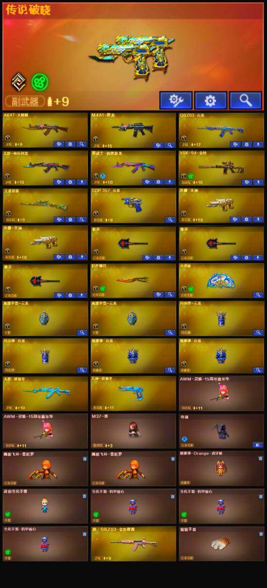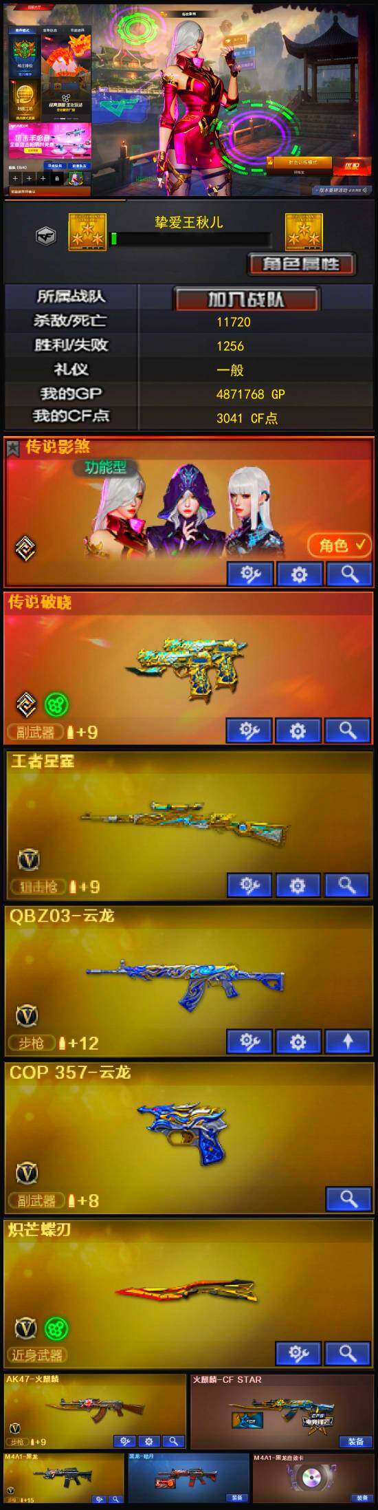 【英雄级武器】:AK47-火麒麟,M4A1-黑龙,无影-神兵利器,QBZ03-云龙,黑武士-锦绣游龙,VSK-94-金蚀,沙鹰-天神*2,COP 357-云龙,擎天*3,炽芒蝶刃,高爆手雷-云龙*2,闪光弹-云龙*2,烟雾弹-云龙*2