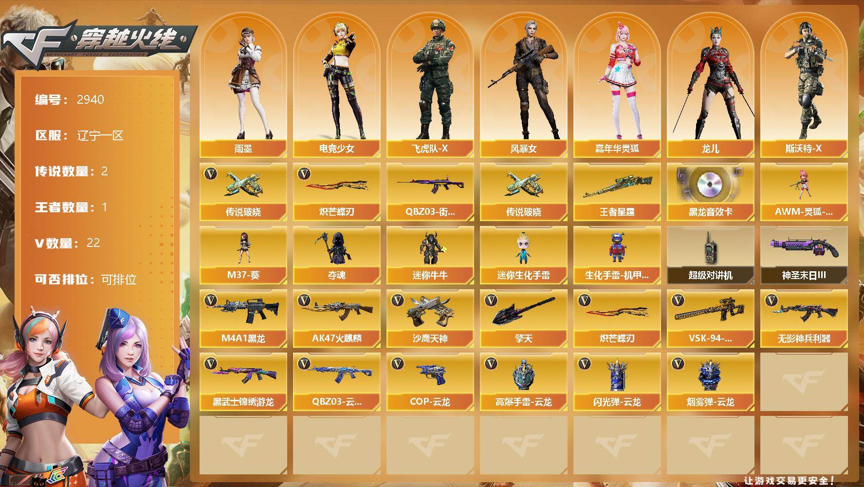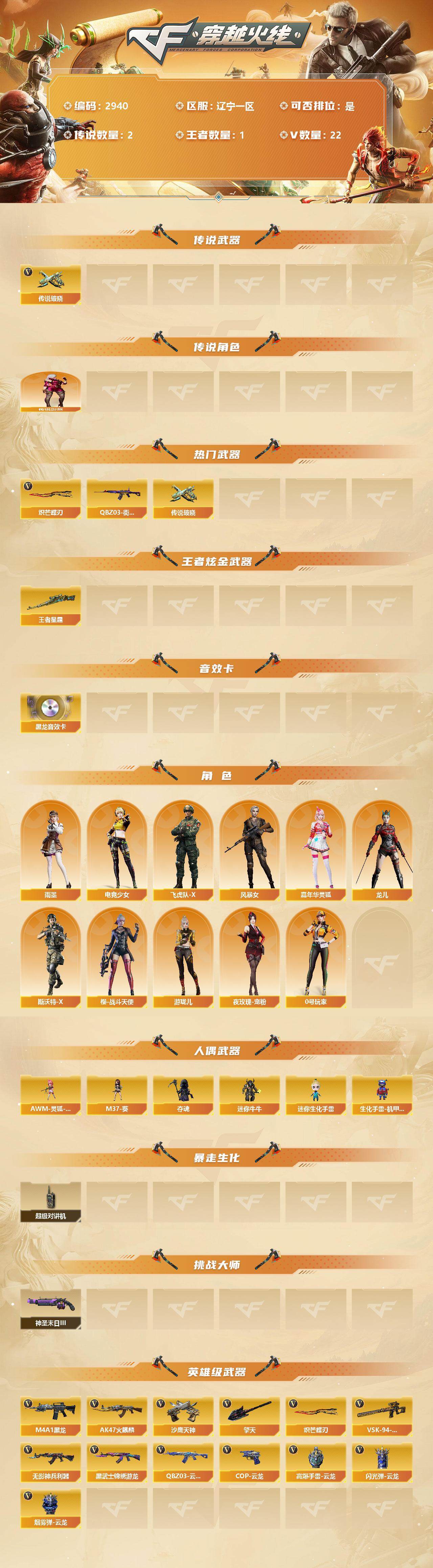 [13143838]辽宁一区-22V-1王者-0炫金 【传说武器】:传说破晓 【传说角色】:传说影煞 【热门武器】:传说破晓,QBZ03-街机,炽芒蝶刃 【王者炫金武器】:王者星霆 【音效卡】:M4A1-黑龙音效卡 【皮肤】:黑龙-暗月 【角色】:雨墨,电竞少女,飞虎队-X,风暴女,嘉年华灵狐,0号玩家,龙儿,斯沃特-X,夜玫瑰-宠粉,樱-战斗天使,游珑儿 【人偶武器】:AWM-灵狐-15周年嘉年华*2,M37-葵,夺魂,迷你牛牛,迷你生化手雷,生化手雷-机甲核心*3 【暴走生化】:超级对讲机 【挑战大师】:神圣爆裂者-末日III 【英雄级武器】:AK47-火麒麟,M4A1-黑龙,无影-神兵利器,QBZ03-云龙,黑武士-锦绣游龙,VSK-94-金蚀,沙鹰-天神*2,COP 357-云龙,擎天*3,炽芒蝶刃,高爆手雷-云龙*2,闪光弹-云龙*2,烟雾弹-云龙*2 【特殊枪械】: