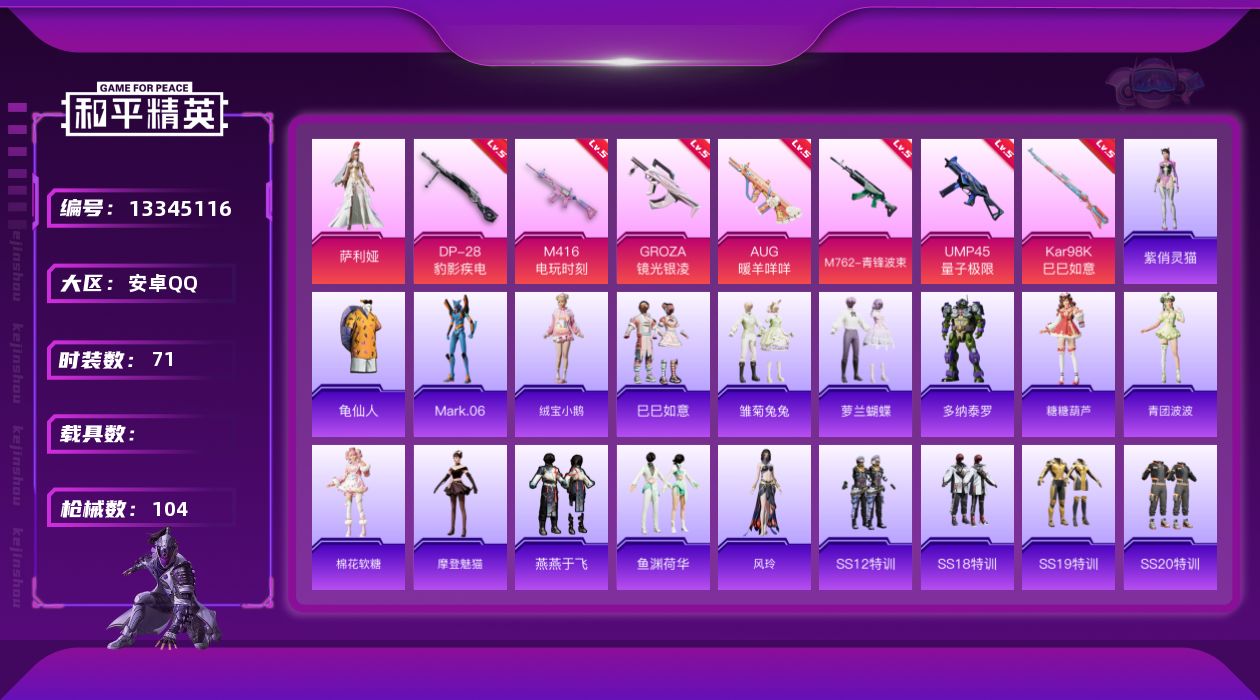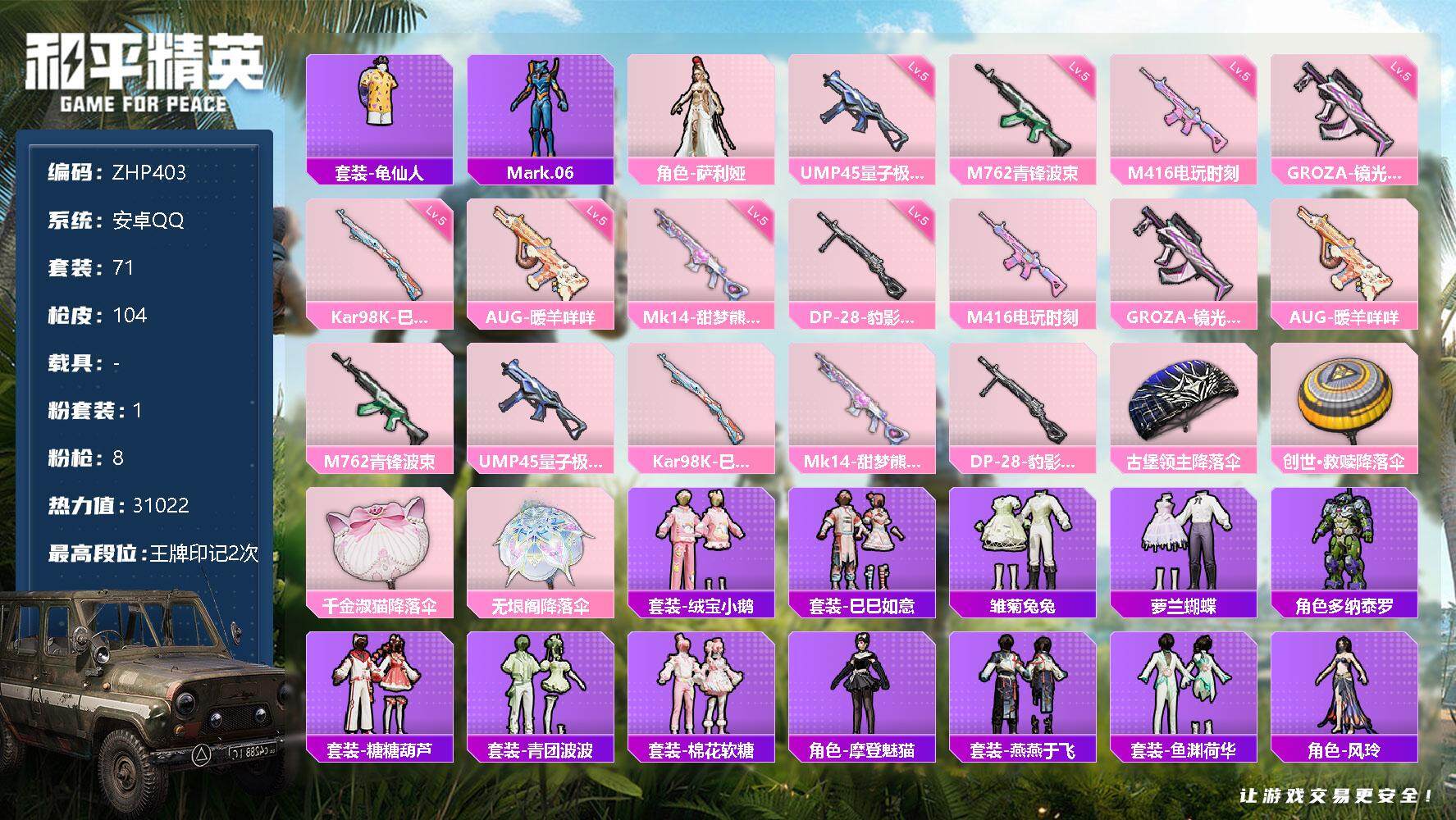[13345116]【店主推荐捡漏号!可直接换绑】/地铁满天赋 安卓 手Q-1粉装-8特效枪-3.1w热力值-2王牌印记-71套装-104枪皮【热门品类】:套装-龟仙人,角色-Mark.06【粉色套装】:角色-萨利娅【粉色枪皮等级】:M416-电玩时刻(五级),GROZA-镜光银凌(五级),AUG-暖羊咩咩(五级),M762-青锋波束(五级),UMP45-量子极限(五级),Kar98K-巳巳如意(五级),Mk14-甜梦熊击(五级),DP-28-豹影疾电(五级)【粉色枪皮】:M416-电玩时刻,GROZA-镜光银凌,AUG-暖羊咩咩,M762-青锋波束,UMP45-量子极限,Kar98K-巳巳如意,Mk14-甜梦熊击,DP-28-豹影疾电