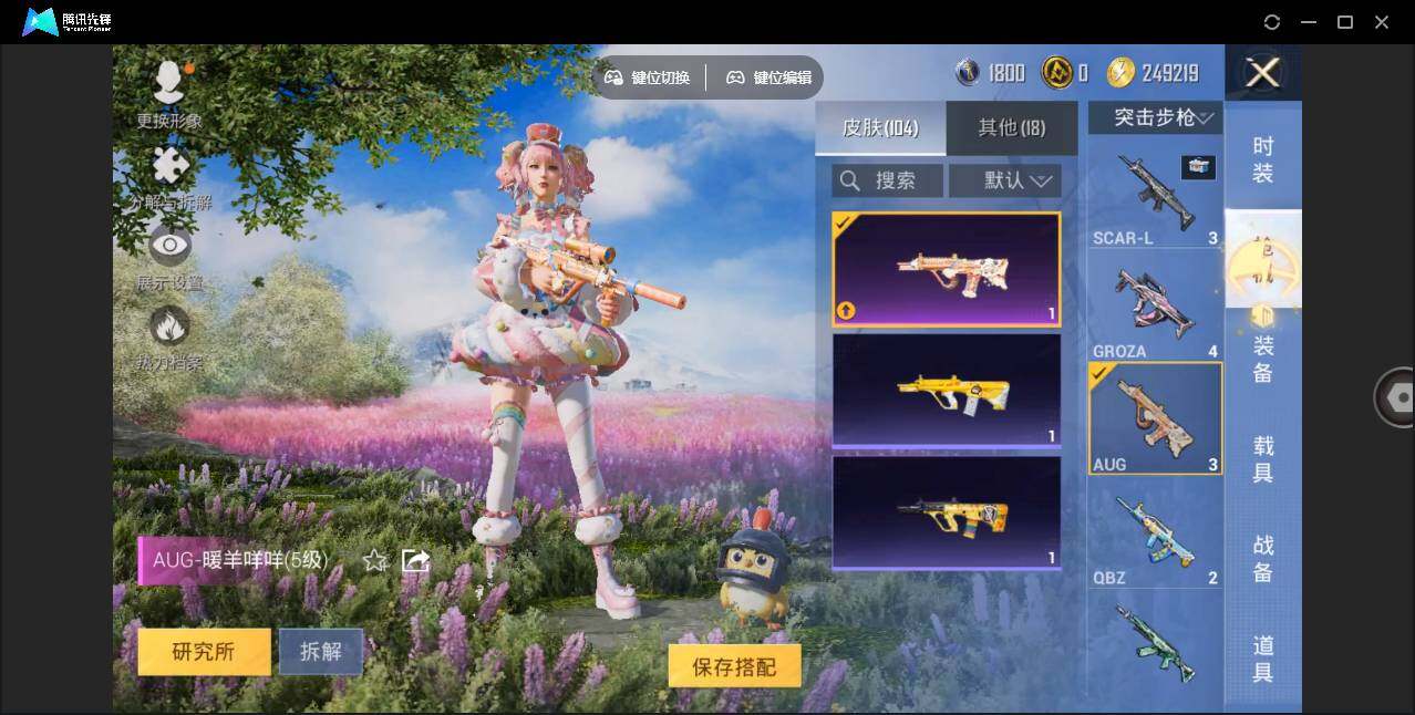 M416-电玩时刻,GROZA-镜光银凌,AUG-暖羊咩咩,M762-青锋波束,UMP45-量子极限,Kar98K-巳巳如意