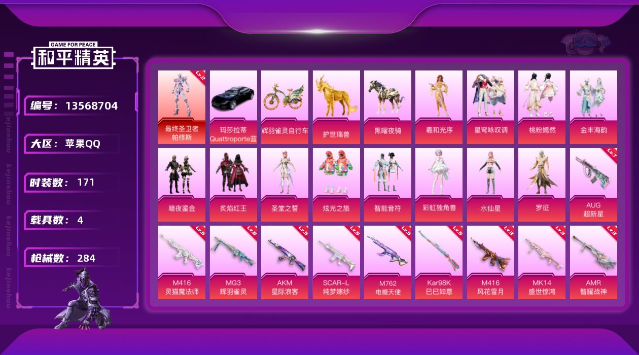 - [12680888]安卓 手Q-10粉装-7特效枪-1载具-3粉色飞行器-71214热力值-11王牌印记-173套装-209枪皮 【粉色载具】:阿斯顿马丁DBS(红) 【粉色套装】:粉装-王牌四分卫,粉装-沙场疾风,粉装-暗星紫秘,粉装-恐龙拽拽,粉装-紫电风暴,角色-紫钛骑兵,角色-烟云彩露,角色-小蓝,角色-美雪,角色-冷漠罗丽 【粉色枪皮等级】:AKM-绿萝繁花(五级),SCAR-L-锦绣绵绵(五级),M416-电玩时刻(五级),Vector-最终圣卫者(三级),Kar98K-巳巳如意(五级),DP-28-豹影疾电(五级),平底锅-林间仙鹿(七级) 【粉色枪皮】:AKM-绿萝繁花,SCAR-L-锦绣绵绵,M416-电玩时刻,Vector-最终圣卫者,Kar98K-巳巳如意,DP-28-豹影疾电,平底锅-林间仙鹿 【粉色飞行器】:古堡领主飞行器,四圣焕新飞行器,终晖之翼飞行器 【粉色降落伞】:四圣焕新降落伞,心之恋语降落伞,马卡龙降落伞,怪笑疯兔降落伞,暗夜玫瑰降落伞,莲影清波降落伞,精灵梦叶罗丽降落伞,星穹咏叹调降落伞,最终圣卫者降落伞,冷漠罗丽降落伞 【稀有套装】:套装-巳巳如意,套装-星影赞美诗,套装-霓虹热舞,套装-云朵鹅,套装-雪绒豹,角色-时希公主,角色-乐音 【稀有枪皮】:AKM-冰凉西瓜,AKM-四圣焕新,AKM-夜灯,AKM-彩虹符号,AKM-星之彼岸,AKM-江南烟雨,AKM-玉龙,AKM-生命誓言,AKM-破晓战魂,AKM-萌趣颜团子,AKM-虎虎生威,AKM-霓虹街区,AKM-龙的传人,M16A4-夜灯,M16A4-幻世战舞者,M16A4-红色方程式,M16A4-蓝色火焰,M16A4-最终圣卫者,SCAR-L-夏日绵绵冰,SCAR-L-炫彩节奏,SCAR-L-玉兔迎春,SCAR-L-红色方程式,SCAR-L-黄金龙骨,SCAR-L-冷漠罗丽,M416-夜灯,M416-糯团青竹,M416-红色方程式,M416-绯红前夜,M416-蓝色火焰,GROZA-异彩先驱,GROZA-彩虹符号,GROZA-春暖花开,GROZA-治愈之星,GROZA-生命誓言,GROZA-黑色刀锋,AUG-耀粉歌者,AUG-青春冒险家,QBZ-原初圣火,QBZ-彩虹符号,QBZ-飞驰魅影,M762-牛气冲天,M762-瑞龙福将,M762-生命誓言,M762-绯红前夜,M762-镭射皇者,