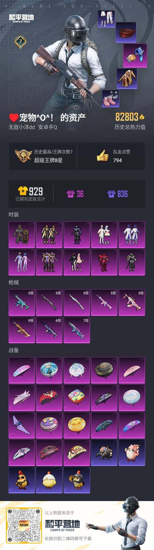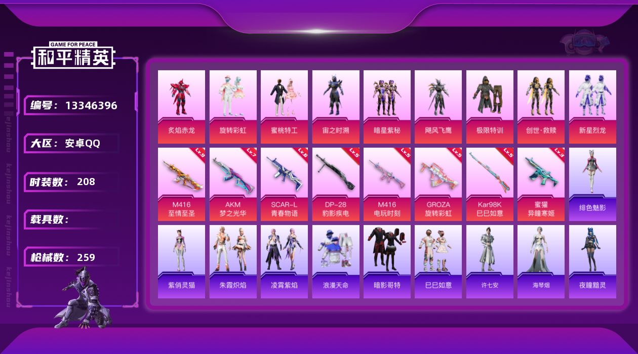 - [12037769]素材身法号【特价急出/详情看图】:安卓 手Q-16粉装-13特效枪-8载具-5粉色飞行器-11.7w热力值-13王牌印记-248套装-311枪皮【热门品类】:粉装-梦幻火箭,粉装-缤纷油彩,套装-奇异狩猎者,套装-胖达团团,套装-沙漠守护者,套装-浪客战士,套装-龟仙人,套装-潮萌小黄鸭,套装-暗影哥特,套装-粉红小猪,小恶魔头饰,熔岩游骑兵面罩,熔岩游骑兵连帽夹克【粉色载具】:特斯拉Model X(冷光银),阿斯顿马丁DBS(金),路特斯EVIJA(星际黄),玛莎拉蒂Ghibli(蓝),合金龙骨(蓝),海龙奔腾,双人摩托-梦幻火箭,僚机-萌兔起飞【粉色套装】:粉装-守护骑士,粉装-数码大师,粉装-天使彩虹糖,粉装-木曜青龙,粉装-梦幻火箭,粉装-金风玉露,粉装-金属狂野,粉装-缤纷油彩,粉装-新星烈龙,粉装-香水柠檬,粉装-海渊国主,粉装-海盐物语,粉装-恐龙拽拽,粉装-冷魅冰骑,粉装-赤焰黑爵,粉装-紫电风暴【粉色枪皮等级】:AKM-炫紫旋律(四级),AKM-梦之光华(六级),SCAR-L-青春物语(四级),M416-五爪金龙(二级),M416-心之恋语(五级),M762-冷魅冰骑(四级),UMP45-恐龙拽拽(四级),P90-金丰海韵(二级),Kar98K-巳巳如意(五级),M24-星之信仰(五级),Mini14-荧光虫舞(五级),S12K-海渊国主(四级),DP-28-豹影疾电(五级)【粉色飞行器】:梦幻火箭飞行器,锦绣火鲤飞行器,夏日绵绵冰飞行器,冷魅冰骑飞行器
