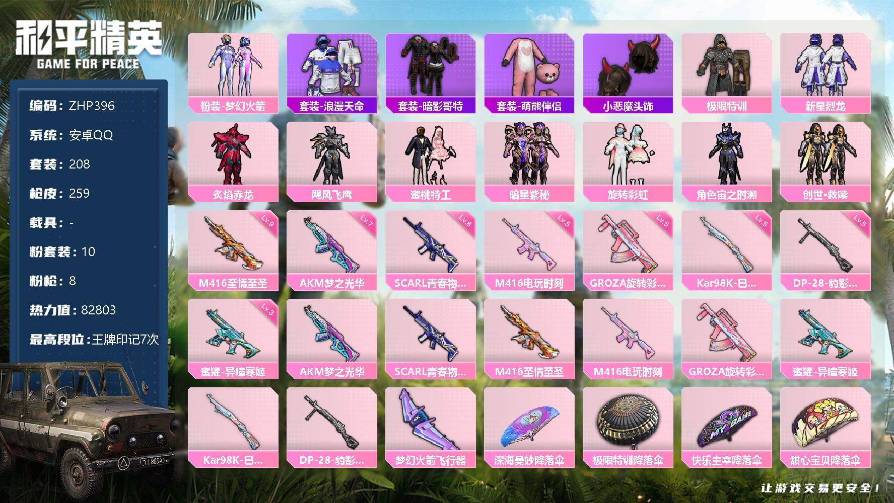 [13346396]【店主推荐捡漏号!可直接换绑】/满级m4至情至胜 素材身法号/地铁满天赋 安卓 手Q-10粉装-8特效枪-1粉色飞行器-8.2w热力值-7王牌印记-208套装-259枪皮【热门品类】:粉装-梦幻火箭,套装-浪漫天命,套装-暗影哥特,套装-萌熊伴侣,小恶魔头饰【粉色套装】:粉装-极限特训,粉装-梦幻火箭,粉装-新星烈龙,粉装-炙焰赤龙,粉装-飓风飞鹰,粉装-蜜桃特工,粉装-暗星紫秘,粉装-旋转彩虹,角色-宙之时溯,套装-创世·救赎【粉色枪皮等级】:AKM-梦之光华(七级),SCAR-L-青春物语(六级),M416-至情至圣(九级),M416-电玩时刻(五级),GROZA-旋转彩虹(五级),蜜獾-异瞳寒姬(三级),Kar98K-巳巳如意(五级),DP-28-豹影疾电(五级)【粉色飞行器】:梦幻火箭飞行器