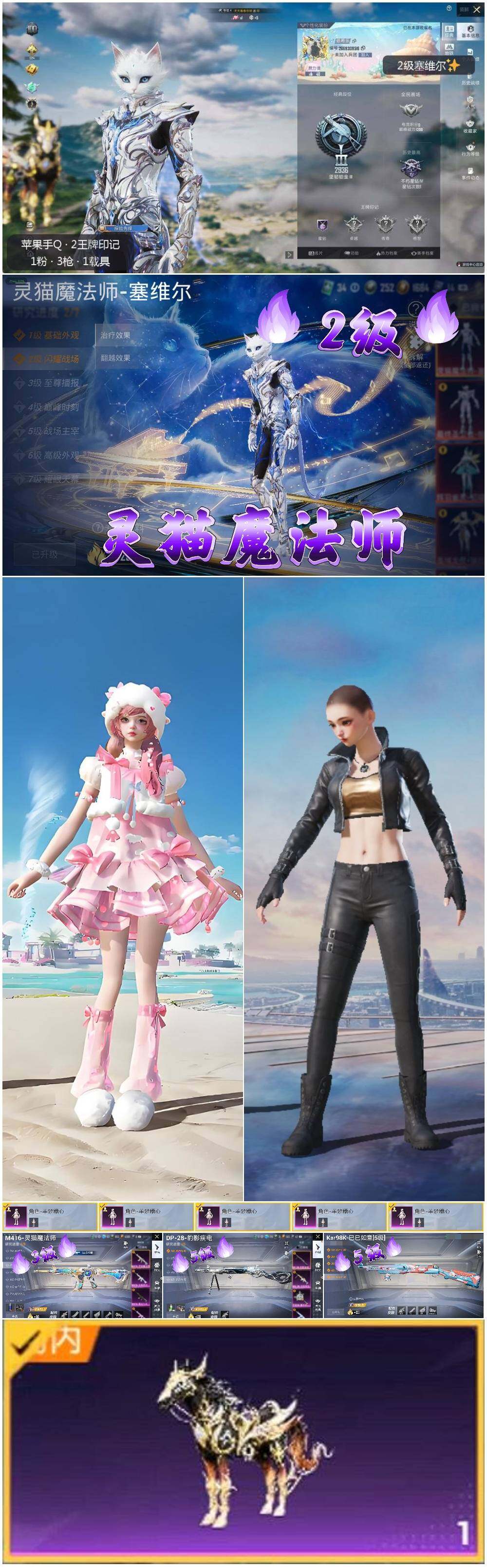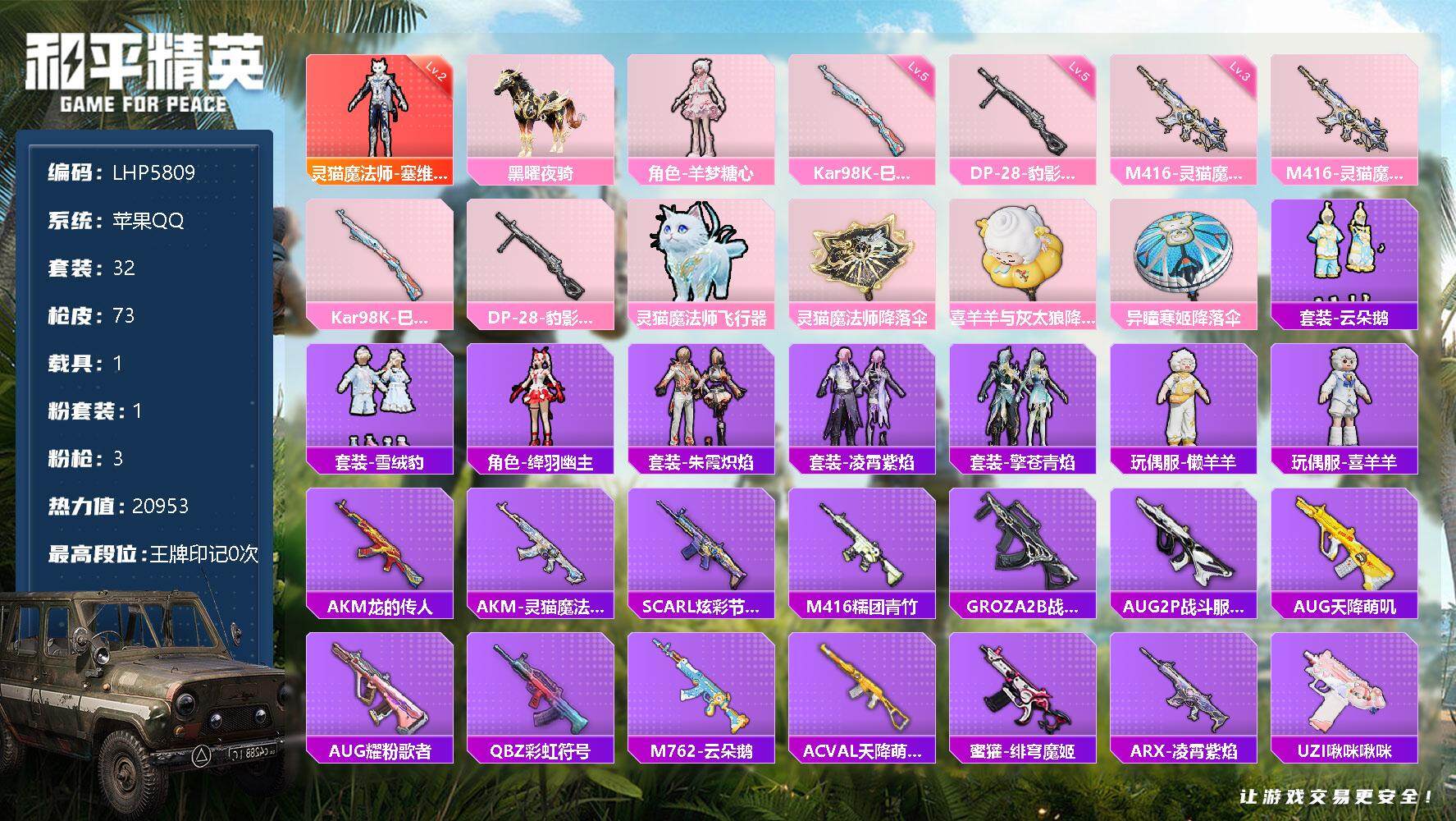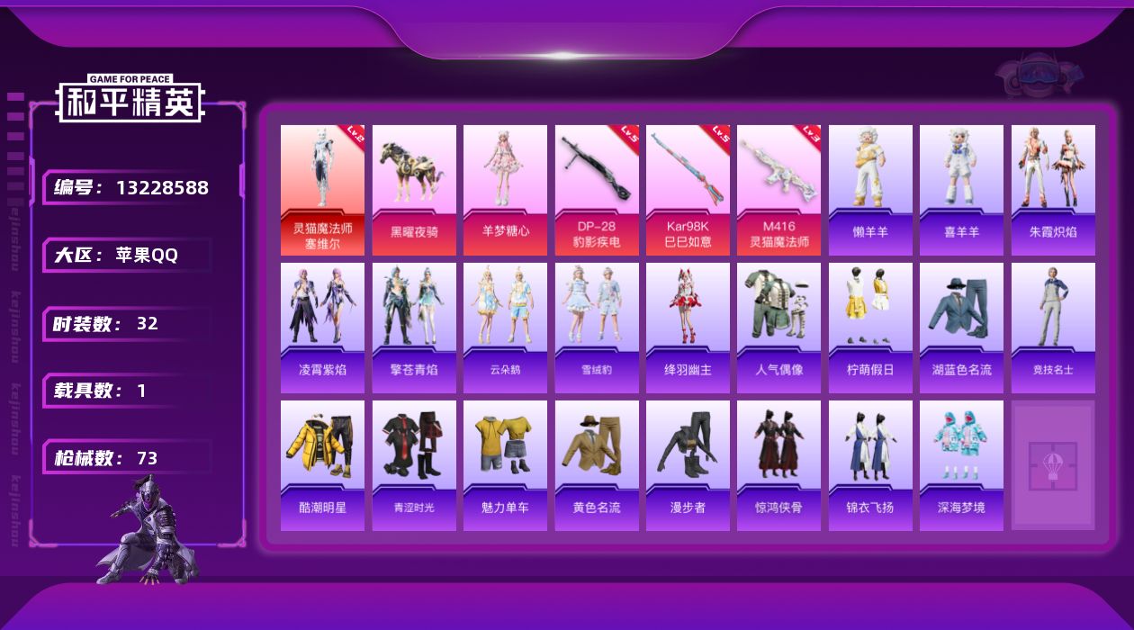 [13228588]素材身法号/地铁满天赋 苹果 手Q-1神装-1粉装-3特效枪-1载具-1粉色飞行器-2w热力值-2王牌印记-32套装-73枪皮【红色神装等级】:灵猫魔法师-塞维尔(二级)【粉色载具】:黑曜夜骑【粉色套装】:角色-羊梦糖心【粉色枪皮等级】:M416-灵猫魔法师(三级),Kar98K-巳巳如意(五级),DP-28-豹影疾电(五级)【粉色飞行器】:灵猫魔法师飞行器