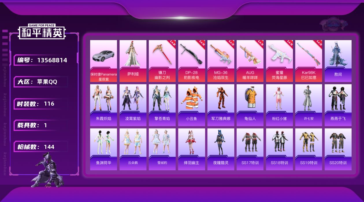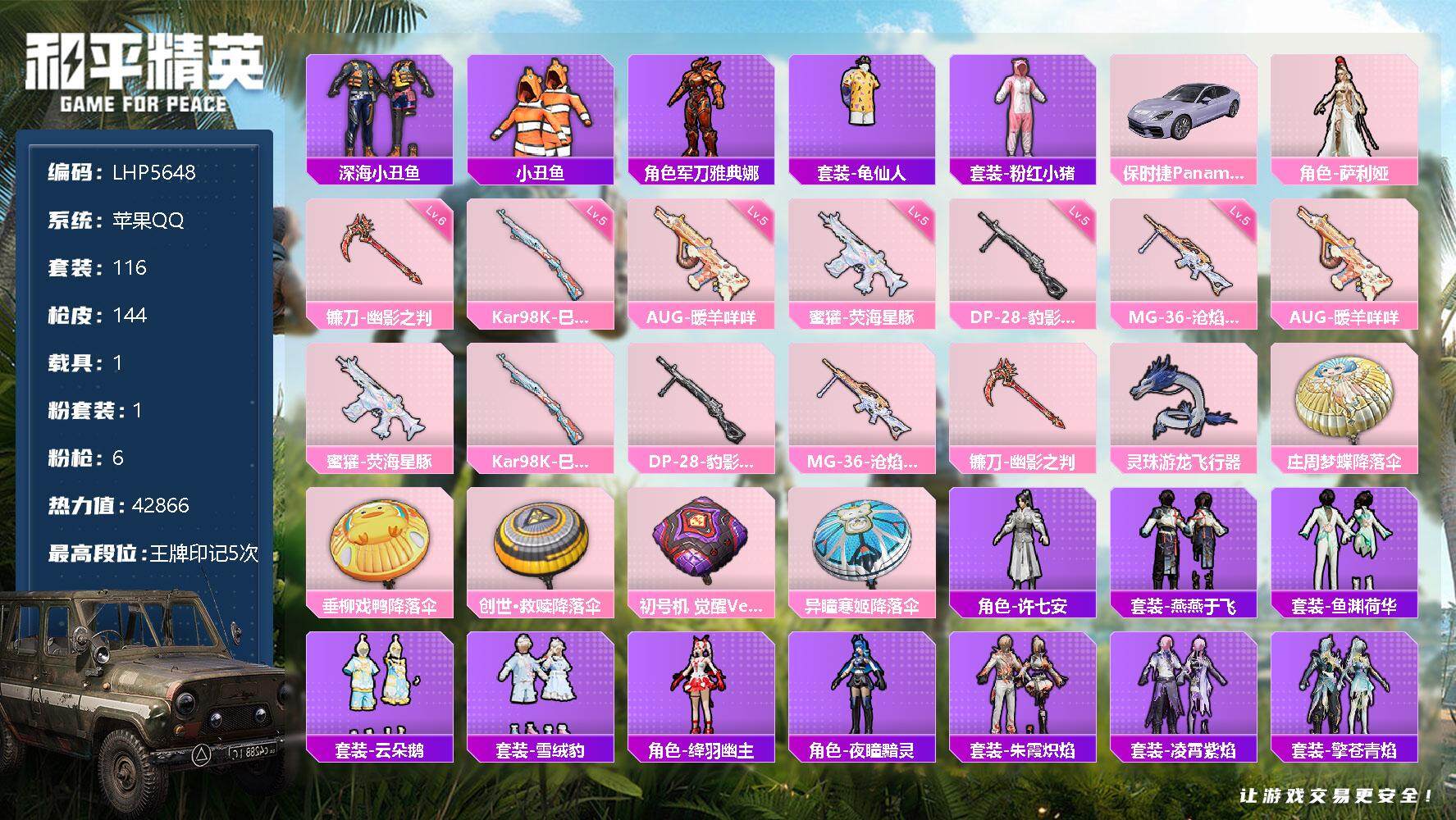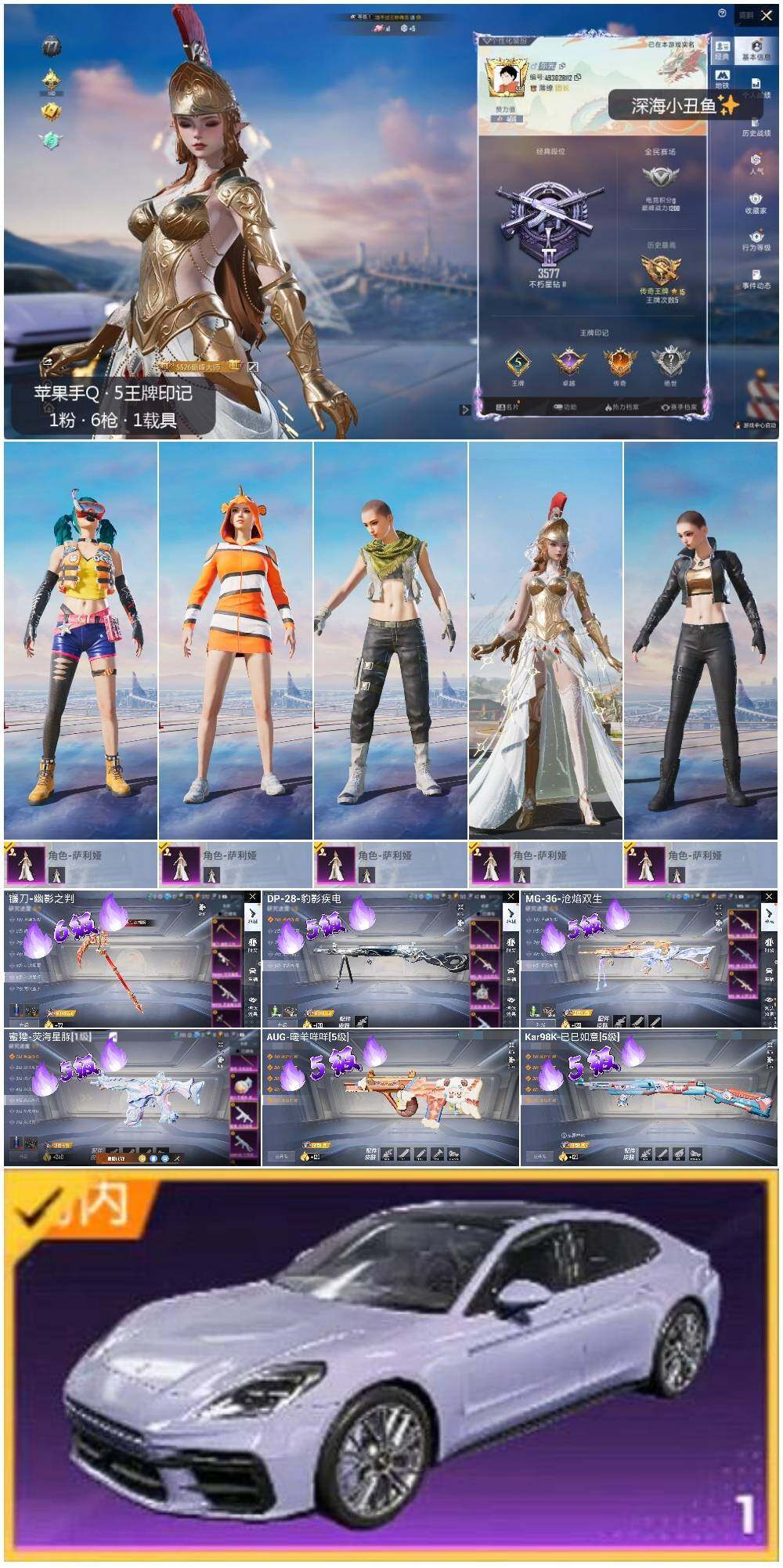 [13568814]苹果 手Q-1粉装-6特效枪-1载具-1粉色飞行器-4.2w热力值-5王牌印记-116套装-144枪皮【热门品类】:套装-深海小丑鱼,套装-小丑鱼,角色-军刀雅典娜,套装-龟仙人,套装-粉红小猪【粉色载具】:保时捷Panamera(星辰紫)【粉色套装】:角色-萨利娅【粉色枪皮等级】:AUG-暖羊咩咩(五级),蜜獾-荧海星豚(五级),Kar98K-巳巳如意(五级),DP-28-豹影疾电(五级),MG-36-沧焰双生(五级),镰刀-幽影之判(六级)【粉色飞行器】:灵珠游龙飞行器