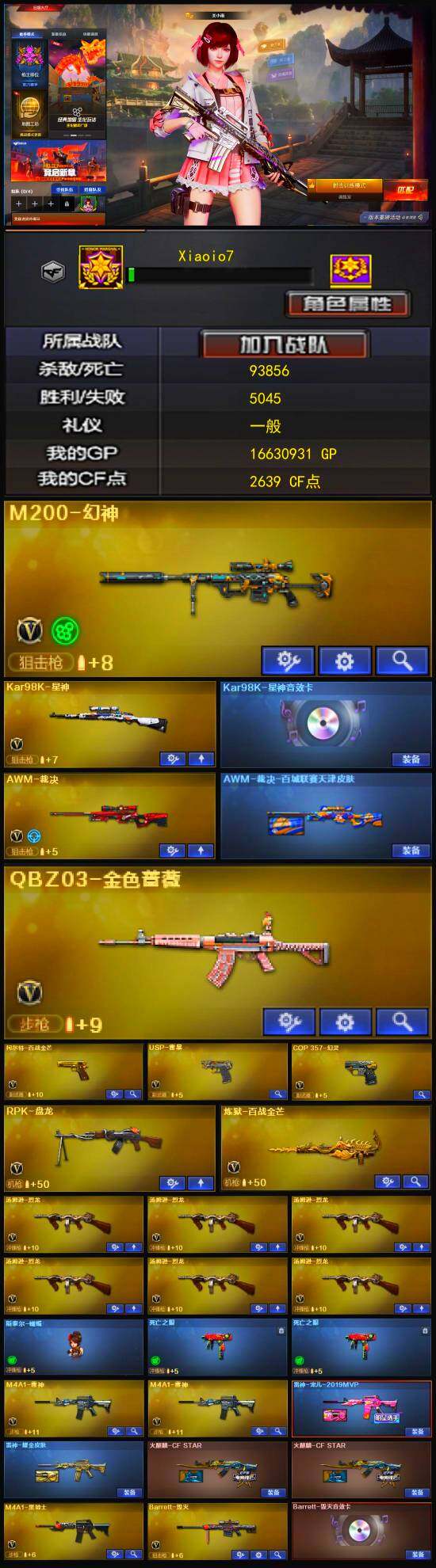 【热门武器】:QBZ03-金色蔷薇,M200-幻神,死亡之眼*2,Kar98K-星神,M4A1-黑骑士,汤姆逊-烈龙*6,RPK-盘龙,斯泰尔-蝴蝶,雷神-小红,USP-雷暴,COP 357-幻灵,沙鹰-修罗*3,金刚伞