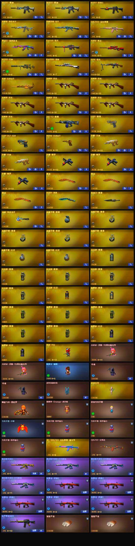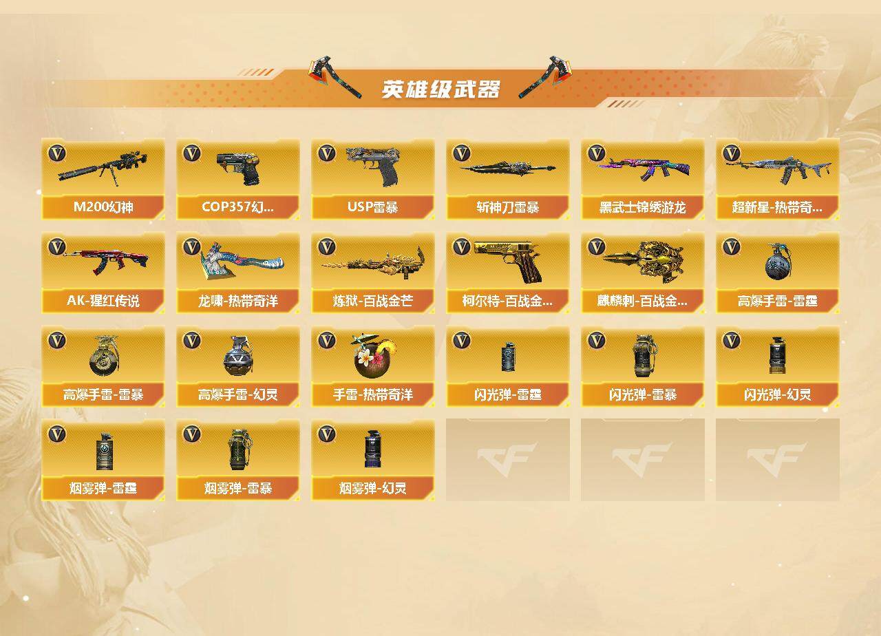 【英雄级武器】:M4A1-雷神*2,M4A1-黑骑士,黑武士-锦绣游龙,超新星-热带奇洋,QBZ03-金色蔷薇,AK-47-猩红传说,Barrett-毁灭,AWM-裁决,M200-幻神,Kar98K-星神,RPK-盘龙,炼狱-百战金芒,汤姆逊-烈龙*6,AA-12-雷霆,沙鹰-修罗*3,沙鹰-天神*2,USP-雷暴,COP 357-幻灵,柯尔特-百战金芒,屠龙*3,龙啸-热带奇洋,斩神刀-雷暴,麒麟刺-百战金芒,高爆手雷-雷霆,高爆手雷-雷暴*4,高爆手雷-幻灵*2,手雷-热带奇洋,闪光弹-雷霆,闪光弹-雷暴*4,闪光弹-幻灵,烟雾弹-雷霆,烟雾弹-雷暴*5,烟雾弹-幻灵*2
