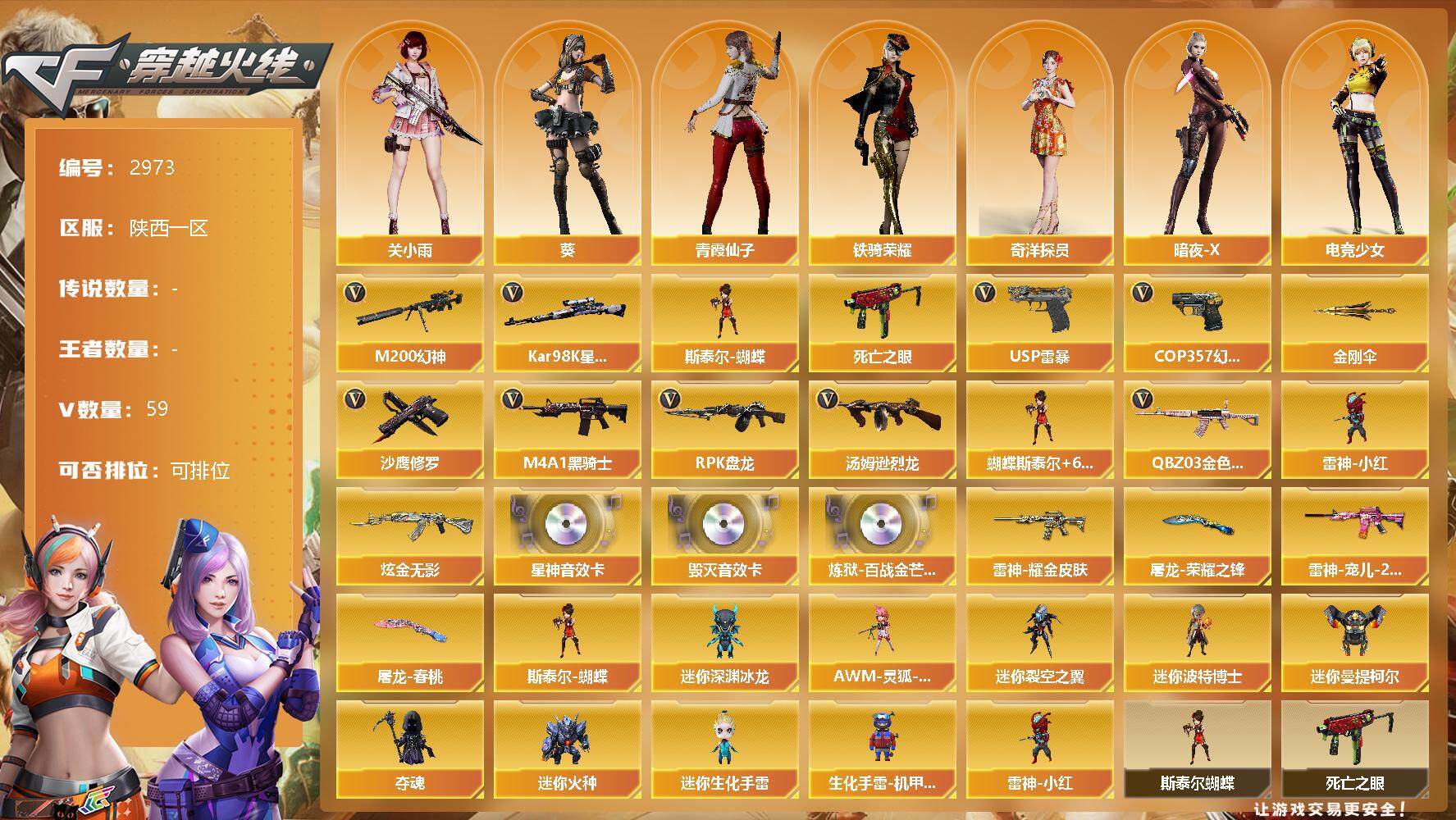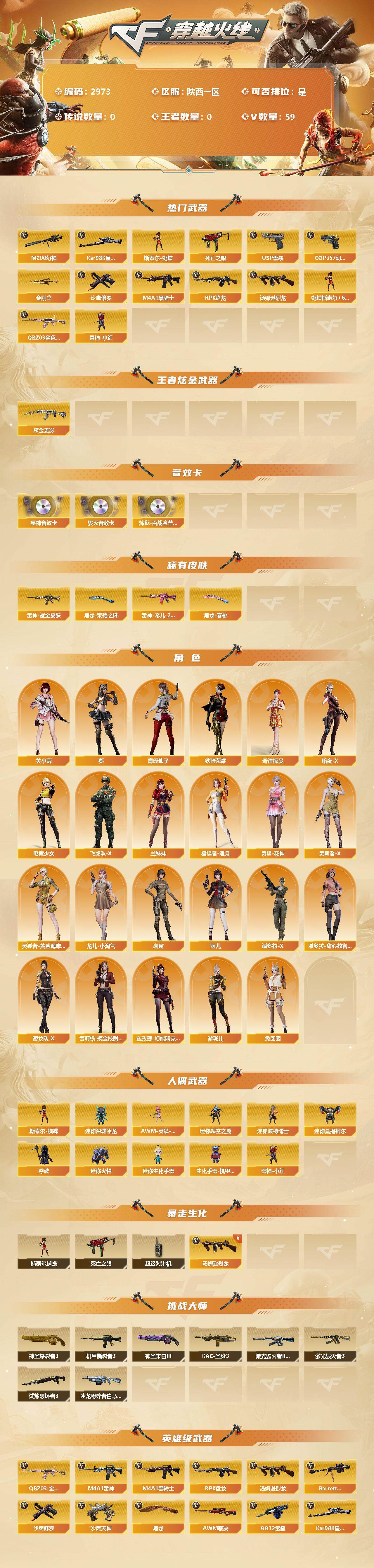 [13271178]陕西一区-59V-0王者-1炫金 【热门武器】:QBZ03-金色蔷薇,M200-幻神,死亡之眼*2,Kar98K-星神,M4A1-黑骑士,汤姆逊-烈龙*6,RPK-盘龙,斯泰尔-蝴蝶,雷神-小红,USP-雷暴,COP 357-幻灵,沙鹰-修罗*3,金刚伞 【王者炫金武器】:炫金无影 【音效卡】:Barrett-毁灭音效卡,Kar98K-星神音效卡,炼狱-百战金芒-庆典舞曲音效卡 【皮肤】:雷神-耀金皮肤,雷神-宠儿-2019MVP,M4A1-再燃火线,修罗-能量核心,屠龙-荣耀之锋,屠龙-春桃 皮肤,屠龙-惊鸿 皮肤,轻型军用手斧-再燃火线 【角色】:葵,关小雨,奇洋探员,暗夜-X,电竞少女,飞虎队-X,兰妹妹,猎狐者-追月,灵狐-花神,灵狐者-X,灵狐者-黄金海岸,龙儿-小淘气,麻雀,萌儿,潘多拉-X,潘多拉-甜心教官,潜龙队-X,青霞仙子,铁骑荣耀,兔囡囡,雪莉杨-摸金校尉,夜玫瑰-幻能朋克,游珑儿 【人偶武器】:雷神-小红,斯泰尔-蝴蝶,AWM-灵狐-15周年嘉年华*2,迷你深渊冰龙,迷你裂空之翼,迷你波特博士,迷你曼提柯尔,夺魂*2,迷你火种,迷你生化手雷,生化手雷-机甲核心*3 【暴走生化】:斯泰尔-蝴蝶,死亡之眼*2,超级对讲机 【挑战大师】:神圣爆裂者III*2,冰龙粉碎者-白马银枪,激光毁灭者III-白马银枪*3,激光毁灭者III,机甲撕裂者III,试炼破坏者III,KAC-圣炎切割者III,神圣爆裂者-末日III 【英雄级武器】:M4A1-雷神*2,M4A1-黑骑士,黑武士-锦绣游龙,超新星-热带奇洋,QBZ03-金色蔷薇,AK-47-猩红传说,Barrett-毁灭,AWM-裁决,M200-幻神,Kar98K-星神,RPK-盘龙,炼狱-百战金芒,汤姆逊-烈龙*6,AA-12-雷霆,沙鹰-修罗*3,沙鹰-天神*2,USP-雷暴,COP 357-幻灵,柯尔特-百战金芒,屠龙*3,龙啸-热带奇洋,斩神刀-雷暴,麒麟刺-百战金芒,高爆手雷-雷霆,高爆手雷-雷暴*4,高爆手雷-幻灵*2,手雷-热带奇洋,闪光弹-雷霆,闪光弹-雷暴*4,闪光弹-幻灵,烟雾弹-雷霆,烟雾弹-雷暴*5,烟雾弹-幻灵*2 【特殊枪械】:蝴蝶斯泰尔+6烈龙,1黑骑士,6烈龙,1盘龙,1蝴蝶斯泰尔