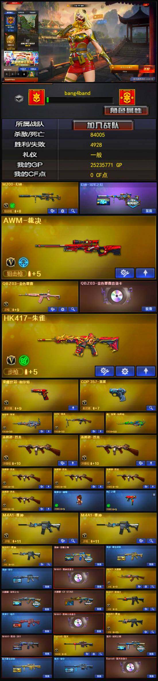 【热门武器】:QBZ03-金色蔷薇,HK417-朱雀,M200-幻神,死亡之眼,荣耀世冠-火麒麟,荣耀世冠-雷神,荣耀世冠-柯尔特,金色小号,M4A1-黑骑士,汤姆逊-烈龙*6,RPK-盘龙,加特林-炼狱,斯泰尔-蝴蝶,降世魔童,沙鹰-修罗*2,金刚伞
