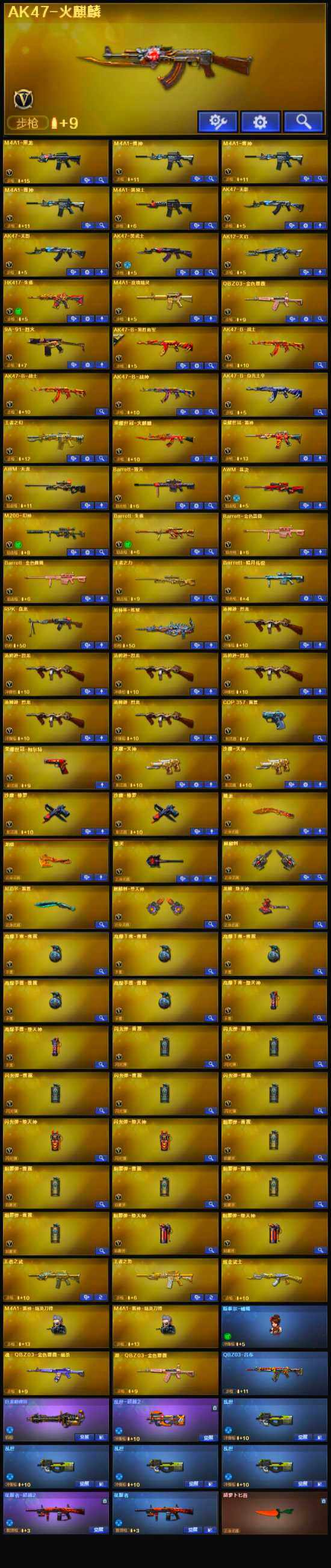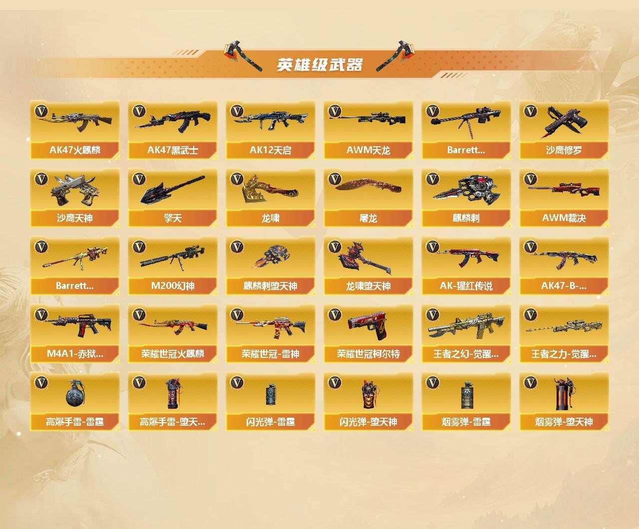 【英雄级武器】:AK47-火麒麟,M4A1-黑龙,M4A1-雷神*3,M4A1-黑骑士,AK47-无影*2,AK47-黑武士,AK12-天启,HK417-朱雀,M4A1-玫瑰精灵,QBZ03-金色蔷薇,王者之幻-觉醒版,AK-47-猩红传说*8,AK47-B-战神,AK47-B-常胜将军,荣耀世冠-火麒麟,荣耀世冠-雷神,AWM-天龙,Barrett-毁灭,AWM-裁决,M200-幻神,Barrett-朱雀,Barrett-金色蔷薇*2,王者之力-觉醒版,RPK-盘龙,加特林-炼狱,汤姆逊-烈龙*6,沙鹰-修罗*2,沙鹰-天神*2,荣耀世冠-柯尔特,屠龙,龙啸,麒麟刺-堕天神,擎天,麒麟刺,龙啸-堕天神,高爆手雷-雷霆*5,高爆手雷-堕天神*2,闪光弹-雷霆*5,闪光弹-堕