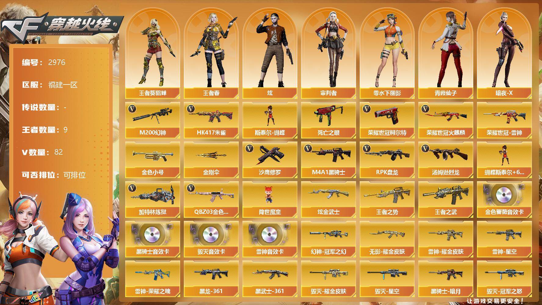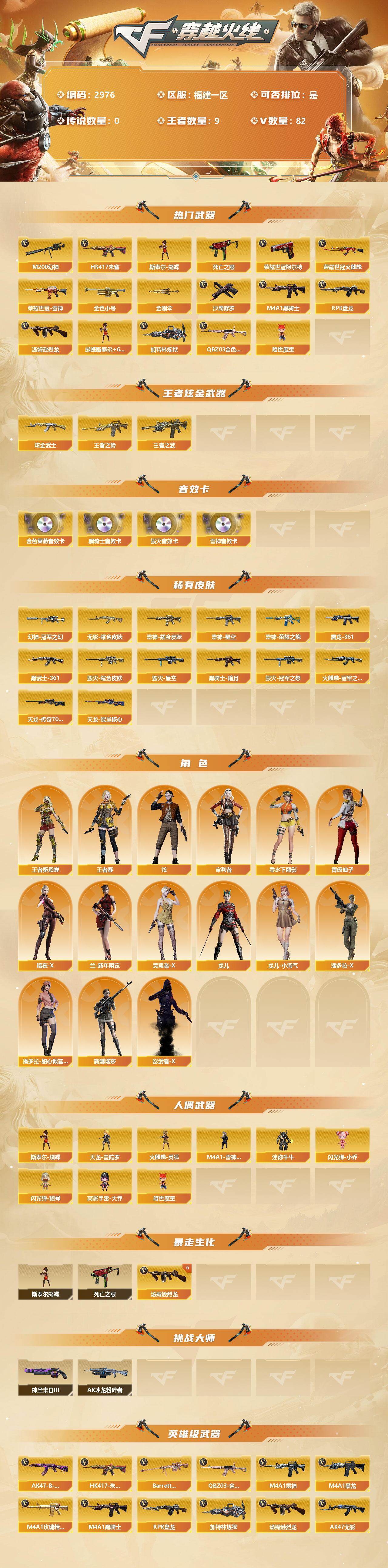 [13360636]福建一区-82V-9王者-1炫金 【热门武器】:QBZ03-金色蔷薇,HK417-朱雀,M200-幻神,死亡之眼,荣耀世冠-火麒麟,荣耀世冠-雷神,荣耀世冠-柯尔特,金色小号,M4A1-黑骑士,汤姆逊-烈龙*6,RPK-盘龙,加特林-炼狱,斯泰尔-蝴蝶,降世魔童,沙鹰-修罗*2,金刚伞 【王者炫金武器】:王者之势,王者之武,炫金武士 【音效卡】:M4A1-雷神音效卡,M4A1-黑骑士音效卡,Barrett-毁灭音效卡,QBZ03-金色蔷薇音效卡 【皮肤】:幻神-冠军之幻,雷神-荣耀之魄,雷神-星空,雷神-耀金皮肤,火麒麟-雷神,火麒麟-冠军之心,毁灭耀金皮肤,毁灭-星空,毁灭-冠军之怒,M4A1-黑龙-361,黑骑士-暗月,无影耀金皮肤,AK47-黑武士-361,战神-粉色甜心皮肤*4,战神-紫绶金章皮肤*4,战神-流金岁月皮肤,AK47-B-常胜将军-曹操,AK47-B-常胜将军-刘备*3,AK47-B-常胜将军-孙权,天龙-能量核心,AWM-天龙-传奇70KG 【角色】:炫,审判者,王者-葵-貂蝉,王者春,暗夜-X,兰-新年限定,零-水下丽影,灵狐者-X,龙儿,龙儿-小淘气,潘多拉-X,潘多拉-甜心教官,青霞仙子,新娜塔莎,影武者-X 【人偶武器】:天龙-曼陀罗,火麒麟-灵狐,M4A1-雷神-精英刀锋*2,斯泰尔-蝴蝶,迷你牛牛*5,闪光弹-小乔*2,闪光弹-貂蝉,高爆手雷-大乔,降世魔童 【暴走生化】:斯泰尔-蝴蝶,死亡之眼 【挑战大师】:AK47-冰龙粉碎者,神圣爆裂者-末日III*2 【英雄级武器】:AK47-火麒麟,M4A1-黑龙,M4A1-雷神*3,M4A1-黑骑士,AK47-无影*2,AK47-黑武士,AK12-天启,HK417-朱雀,M4A1-玫瑰精灵,QBZ03-金色蔷薇,王者之幻-觉醒版,AK-47-猩红传说*8,AK47-B-战神,AK47-B-常胜将军,荣耀世冠-火麒麟,荣耀世冠-雷神,AWM-天龙,Barrett-毁灭,AWM-裁决,M200-幻神,Barrett-朱雀,Barrett-金色蔷薇*2,王者之力-觉醒版,RPK-盘龙,加特林-炼狱,汤姆逊-烈龙*6,沙鹰-修罗*2,沙鹰-天神*2,荣耀世冠-柯尔特,屠龙,龙啸,麒麟刺-堕天神,擎天,麒麟刺,龙啸-堕天神,高爆手雷-雷霆*5,高爆手雷-堕天神*2,闪光弹-雷霆*5,闪光弹-堕