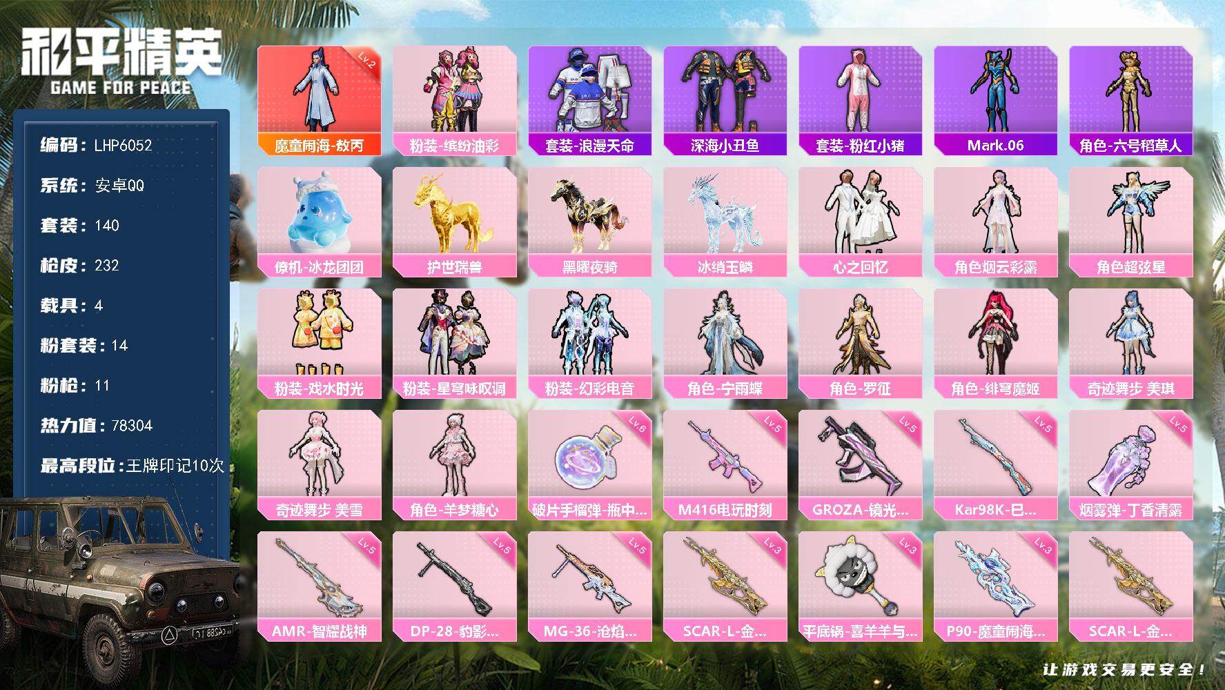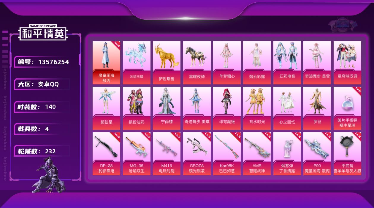 [13576254]可二次【店主推荐捡漏号!可直接换绑】/素材身法号/绝世印记1 安卓 手Q-1神装-14粉装-11特效枪-4载具-19粉色飞行器-7.8w热力值-10王牌印记-140套装-232枪皮【红色神装等级】:魔童闹海-敖丙(二级)【热门品类】:粉装-缤纷油彩,套装-浪漫天命,套装-深海小丑鱼,套装-粉红小猪,角色-Mark.06,角色-六号稻草人【粉色载具】:僚机-冰龙团团,护世瑞兽,黑曜夜骑,冰绡玉鳞【粉色套装】:粉装-缤纷油彩,粉装-心之回忆,角色-烟云彩露,角色-超弦星,粉装-戏水时光,粉装-星穹咏叹调,粉装-幻彩电音,角色-宁雨蝶,角色-罗征,角色-绯穹魔姬,角色-奇迹舞步 美琪,角色-奇迹舞步 美雪,角色-羊梦糖心【粉色枪皮等级】:SCAR-L-金蛇镇世(三级),M416-电玩时刻(五级),GROZA-镜光银凌(五级),P90-魔童闹海 敖丙(三级),Kar98K-巳巳如意(五级),AMR-智耀战神(五级),DP-28-豹影疾电(五级),MG-36-沧焰双生(五级),平底锅-喜羊羊与灰太狼(三级),烟雾弹-丁香清露(五级),破片手榴弹-瓶中星球(六级)【粉色飞行器】:酣梦熊熊飞行器,龙翔九天飞行器,凤舞九天飞行器,万象金身飞行器,彩虹独角兽飞行器,月下星之子飞行器,圣域金龙飞行器,御兔特攻飞行器,幻星舰长飞行器,时光之吻飞行器,终晖之翼飞行器,智趣喵喵飞行器,灵猫魔法师飞行器,桃源时光飞行器,飞天猪飞行器,灵珠游龙飞行器