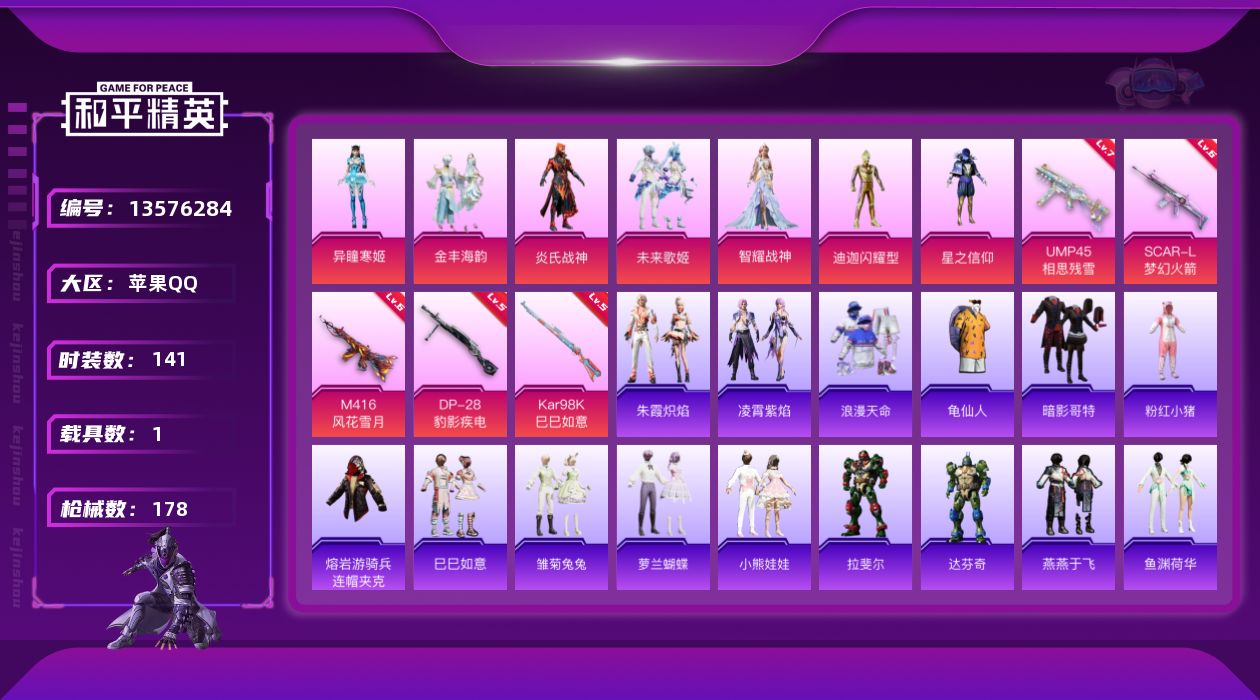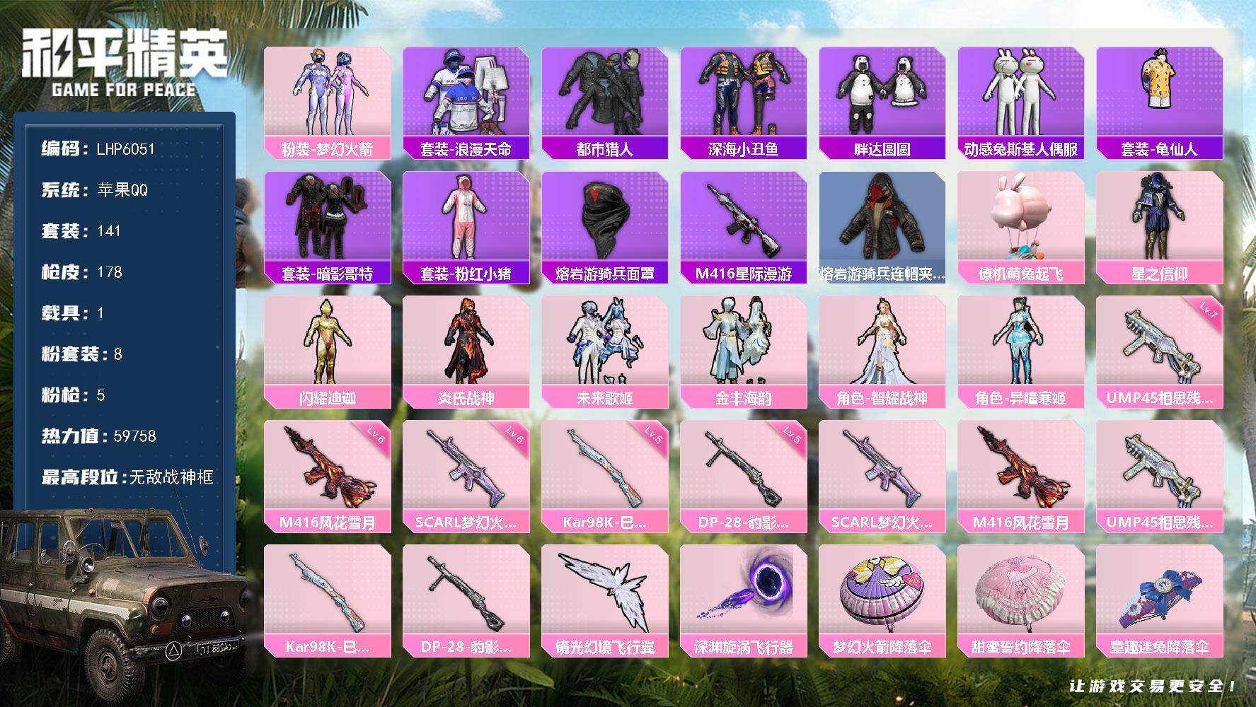 [13576284]【店主推荐捡漏号!可直接换绑】/素材身法号/绝世印记1/无敌战神1 苹果 手Q-无敌战神框-8粉装-5特效枪-1载具-3粉色飞行器-5.9w热力值-13王牌印记-141套装-178枪皮【热门品类】:粉装-梦幻火箭,套装-浪漫天命,套装-都市猎人,套装-深海小丑鱼,套装-胖达圆圆,套装-动感兔斯基人偶服,套装-龟仙人,套装-暗影哥特,套装-粉红小猪,熔岩游骑兵面罩,M416-星际漫游,熔岩游骑兵连帽夹克【粉色载具】:僚机-萌兔起飞【粉色套装】:粉装-梦幻火箭,粉装-星之信仰,角色-闪耀迪迦,粉装-炎氏战神,粉装-未来歌姬,粉装-金丰海韵,角色-智耀战神,角色-异瞳寒姬【粉色枪皮等级】:SCAR-L-梦幻火箭(六级),M416-风花雪月(六级),UMP45-相思残雪(七级),Kar98K-巳巳如意(五级),DP-28-豹影疾电(五级)【粉色飞行器】:镜光幻境飞行翼,深渊漩涡飞行器