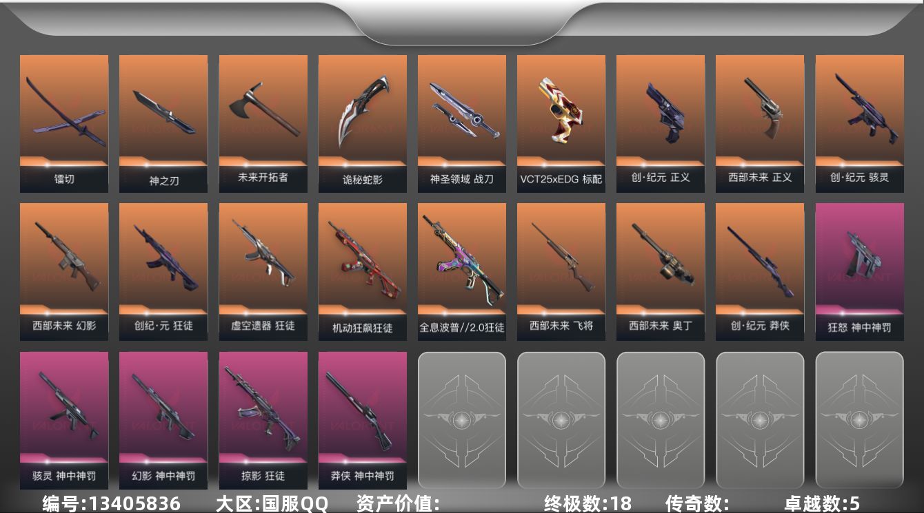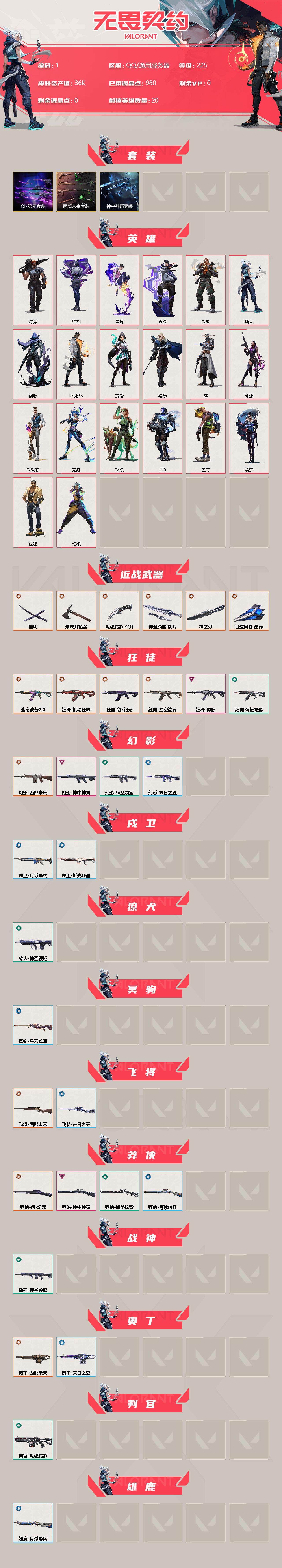 [13405836]可二次 库存资产36070【店主推荐捡漏号!可直接换绑】 【套装】:西部未来套装,创·纪元套装,神中神罚套装 【英雄】:幻棱,炼狱,维斯,暮蝶,钛狐,壹决,铁臂,捷风,幽影,不死鸟,贤者,猎枭,零,芮娜,尚勃勒,霓虹,斯凯,K/O,盖可,黑梦 【近战 武器】:近战武器-神之刃,近战武器-镭切,近战武器-未来开拓者,近战武器-诡秘蛇影 军刀,近战武器-神圣领域 战刀,近战武器-日耀风暴 遗器 【狂徒】:狂徒-机动狂飙,狂徒-全息波普//2.0,狂徒-创·纪元,狂徒-虚空遗器,狂徒-掠影,狂徒-诡秘蛇影 【幻影】:幻影-西部未来,幻影-神中神罚,幻影-神圣领域,幻影-末日之翼,幻影-西部未来 【戍卫】:戍卫-月球哨兵,戍卫-折光棱晶 【獠犬】:獠犬-神圣领域 【冥驹】:冥驹-星云暗涌 【飞将】:飞将-西部未来,飞将-末日之翼 【莽侠】:莽侠-创·纪元,莽侠-神中神罚,莽侠-诡秘蛇影,莽侠-月球哨兵 【战神】:战神-神圣领域 【奥丁】:奥丁-西部未来,奥丁-末日之翼 【判官】:判官-诡秘蛇影 【雄鹿】:雄鹿-月球哨兵 【骇灵】:骇灵-创·纪元,骇灵-神中神罚,骇灵-星云暗涌 【蜂刺】:蜂刺-星云暗涌,蜂刺-折光棱晶 【标配】:标配-折光棱晶 【VCT手枪】:标配-VCT25 x EDG 【正义】:正义-创·纪元,正义-西部未来,正义-超限闪存,正义-复古浪潮,正义-纳米打击,正义-游戏结束,正义-月球哨兵 【鬼魅】:鬼魅-流星兵团,鬼魅-诡秘蛇影,鬼魅-星云暗涌 【狂怒】:狂怒-神中神罚,狂怒-神圣领域 【短炮】:短炮-末日之翼 【卡面】:终章:激斗汉堡 卡面,进入射程 卡面,《双城之战》拥抱 卡面,精灵大战 卡面,欢迎来到底城 卡面,南瓜盛典 卡面,修车达人 卡面,正义的化身 卡面,时间到 卡面,最高舞台 卡面,声感陷阱设计图 卡面,梦幻奶茶 卡面,终章:打造专属狂徒 卡面,趁热吃 卡面,源能反应 卡面,零点嗅探设计图 卡面,终章:瓦娃脸雪糕 卡面,表象之下 卡面,沙雕爆能器 卡面,无畏契约GO!第一卷:芮娜 卡面,清除名单 卡面,无畏契约GO!第一卷:零 卡面,龍记 卡面,完美调谐 卡面 ,暗枪 卡面,代号红色 卡面,新兵报到 卡面,V契约 卡面,无畏契约 卡面 【喷漆】:嗨宝南瓜灯 喷漆,嘭! 喷漆,都算到了 喷漆,控场勿近 喷漆,小丑猫 喷漆,熊抱 喷漆,超级粉