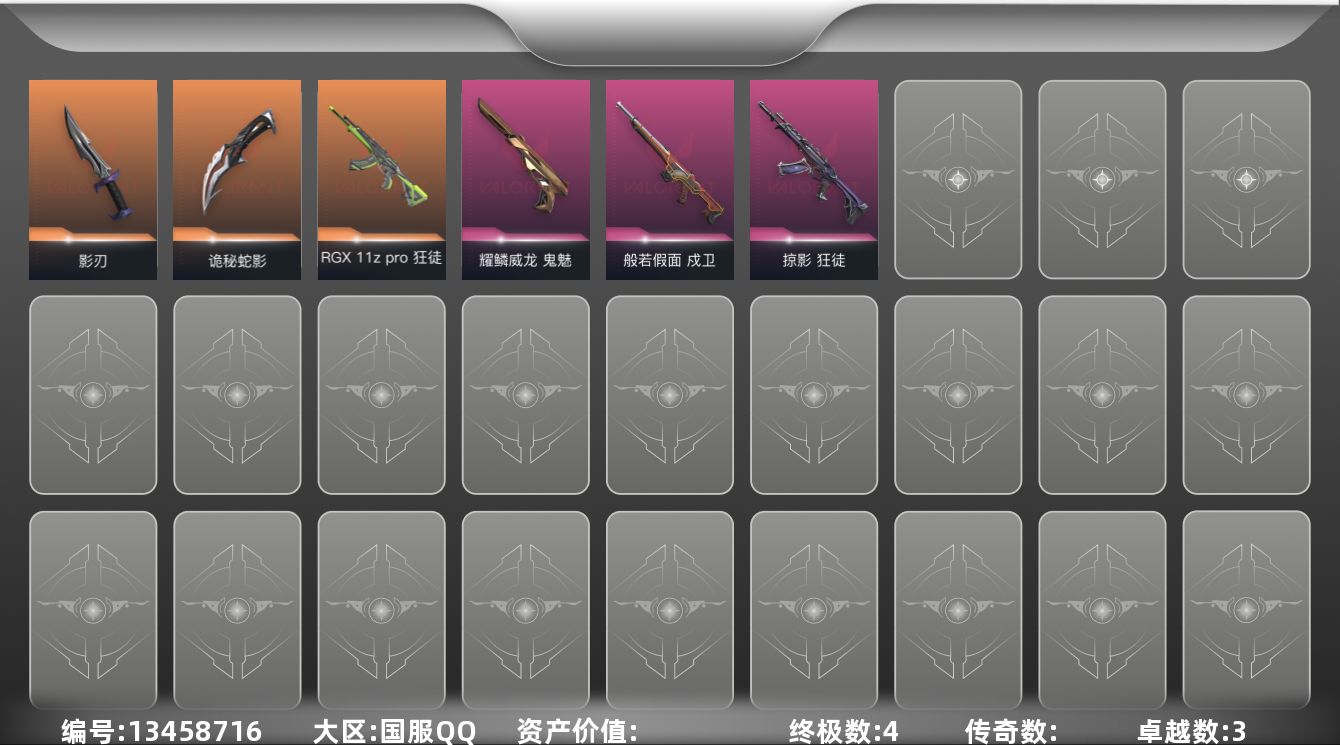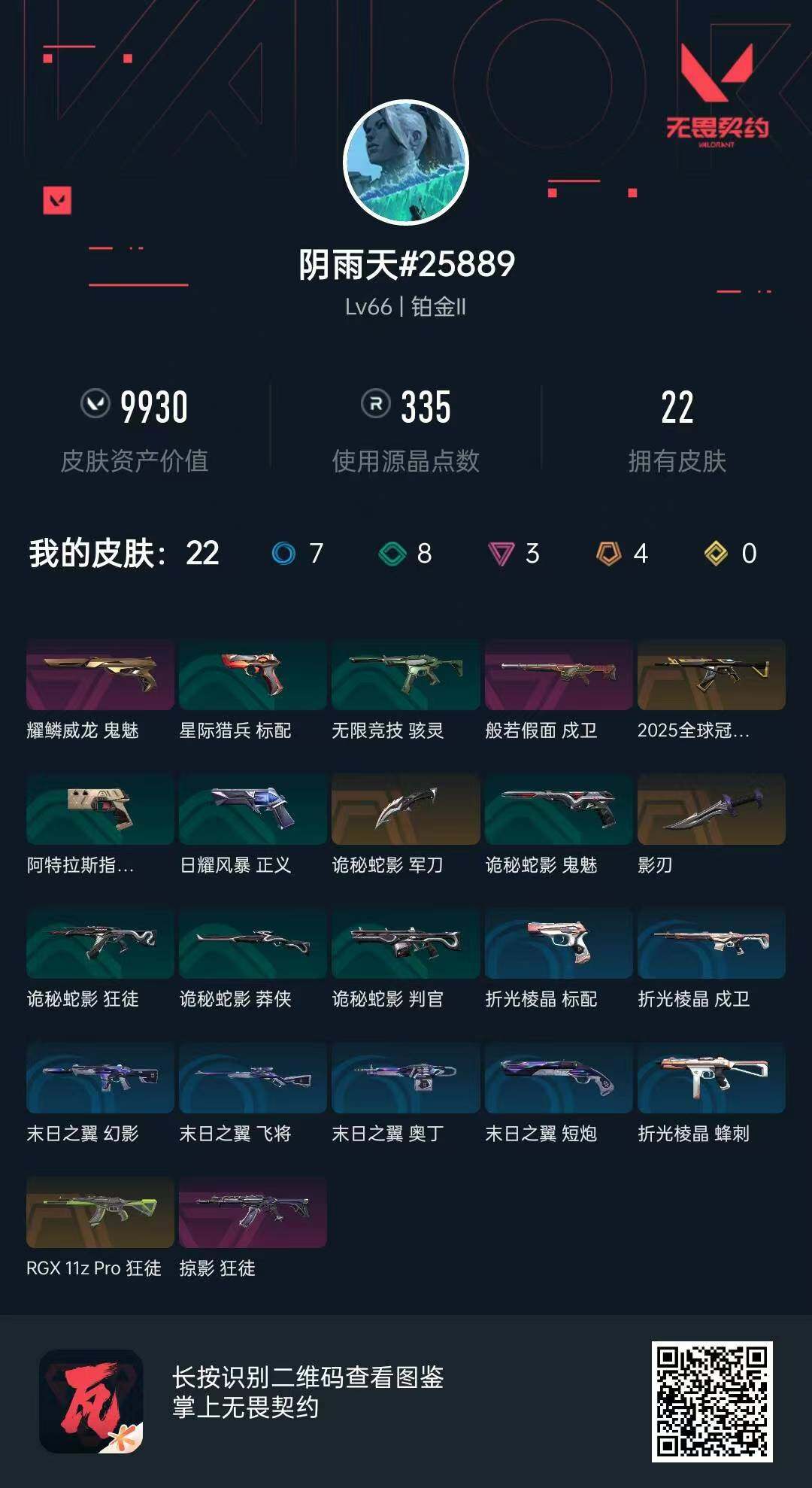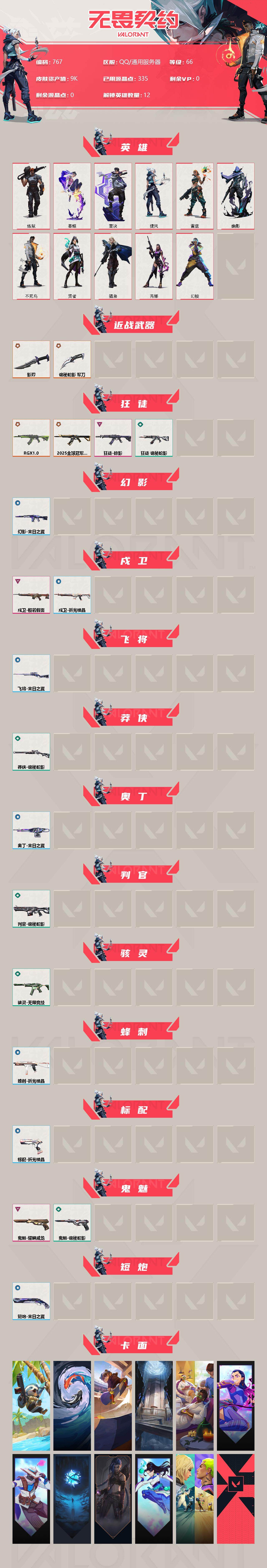 [13458716]【英雄】:幻棱,炼狱,暮蝶,壹决,捷风,雷兹,幽影,不死鸟,贤者,猎枭,芮娜 【近战 武器】:近战武器-影刃,近战武器-诡秘蛇影 军刀 【狂徒】:狂徒-2025全球冠军赛,狂徒-RGX 11z Pro,狂徒-掠影,狂徒-诡秘蛇影 【幻影】:幻影-末日之翼 【戍卫】:戍卫-般若假面,戍卫-折光棱晶 【飞将】:飞将-末日之翼 【莽侠】:莽侠-诡秘蛇影 【奥丁】:奥丁-末日之翼 【判官】:判官-诡秘蛇影 【骇灵】:骇灵-无限竞技 【蜂刺】:蜂刺-折光棱晶 【标配】:标配-折光棱晶 【鬼魅】:鬼魅-耀鳞威龙,鬼魅-诡秘蛇影 【短炮】:短炮-末日之翼 【卡面】:树懒大作战 卡面,红鳞松叶 卡面,Clutch 卡面,表象之下 卡面,源能者美容 卡面,无畏契约GO!第一卷:芮娜 卡面,无畏契约GO!第一卷:零 卡面,无垠星环 卡面,《双城之战》金克丝 卡面,无畏契约GO!第一卷:贤者 卡面,钢锁vs盖可 卡面,代号红色 卡面,新兵报到 卡面,V契约 卡面,无畏契约 卡面 【喷漆】:霓光四射 喷漆,买装还是存钱 喷漆,关门放狗 喷漆,酷熊冲浪 喷漆,无畏契约GO!第一卷:芮娜 喷漆,松叶 喷漆,放下武器 喷漆,胜利属于无畏契约 喷漆,GLHF 喷漆,无畏契约 喷漆 【挂饰】:动力机箱 挂饰,天外飞客 挂饰,红鳞松叶 挂饰,《双城之战》魄罗 挂饰,无畏契约 纪念币 挂饰