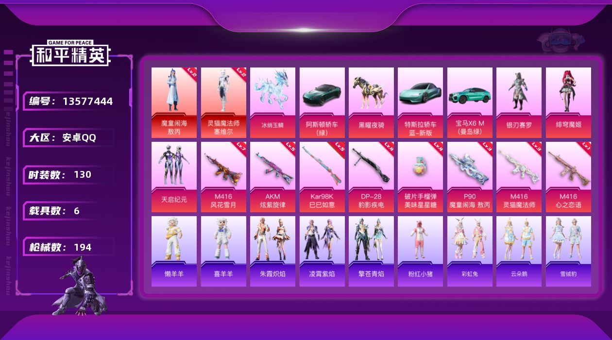 - PX_2101394-??/枪械8/装备297/载具7/战备186/王牌印记14/热力值90329/六级AKM-白勺歌姬/六级SCAR-L-纯梦嫁纱/七级M416-心之恋语/六级GROZA-焦糖拿铁/五级M762-甜心娃娃/一级Kar98K-巳巳如意/一级SLR-暗夜玫瑰/五级DP-28-枪炮玫瑰/兰博SVJ绿色/玛莎拉蒂粉色/海龙奔腾/萌喵橘座/极速兔兔车/萌兔起飞僚机/塞莎霓虹粉/红螳螂/音爆