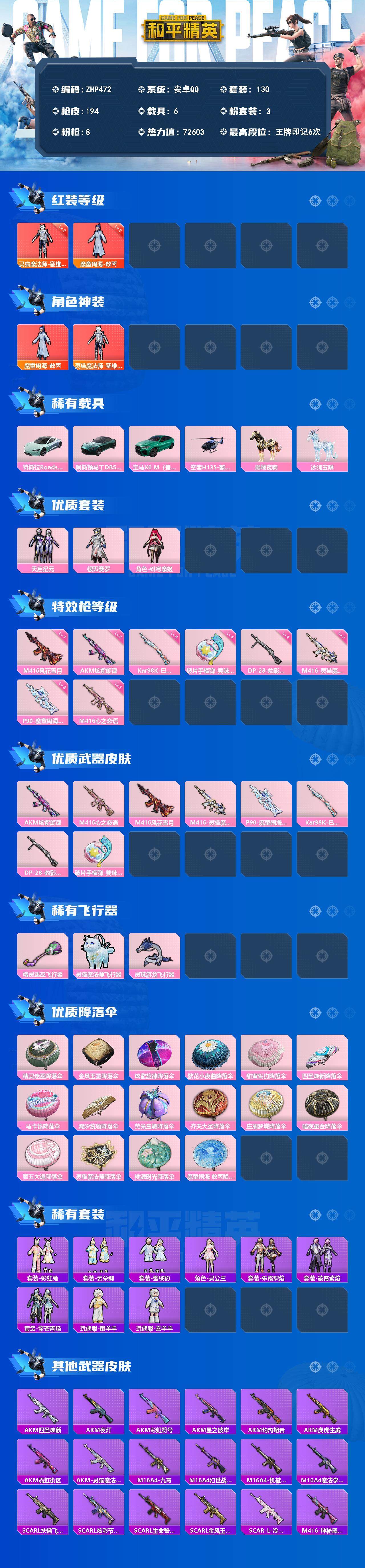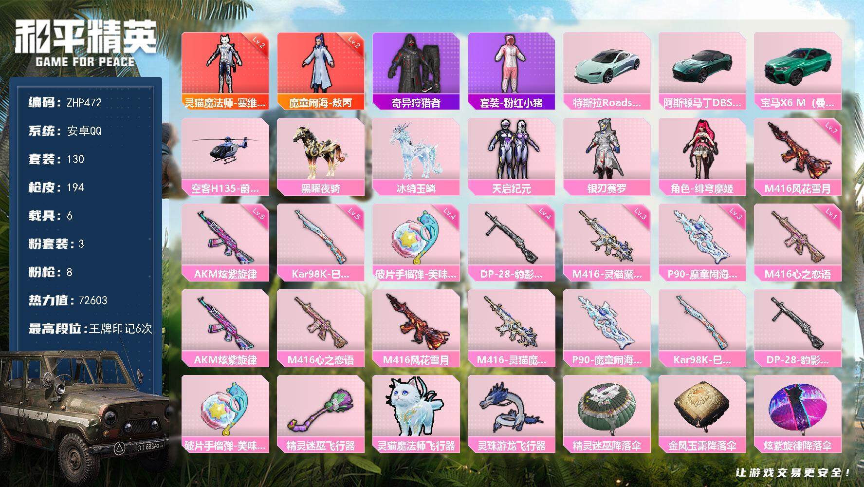 [13577444]不可二次【店主推荐捡漏号!可直接换绑】/绝世印记1/素材身法号 安卓 手Q-2神装-3粉装-8特效枪-6载具-3粉色飞行器-7.2w热力值-6王牌印记-130套装-194枪皮【红色神装等级】:魔童闹海-敖丙(二级),灵猫魔法师-塞维尔(二级)【热门品类】:套装-奇异狩猎者,套装-粉红小猪【粉色载具】:特斯拉Roadster(水滴蓝),阿斯顿马丁DBS(绿),宝马X6 M(曼岛绿),空客H135-蔚蓝之翼,黑曜夜骑,冰绡玉鳞【粉色套装】:粉装-天启纪元,粉装-银刃赛罗,角色-绯穹魔姬【粉色枪皮等级】:AKM-炫紫旋律(五级),M416-心之恋语(一级),M416-风花雪月(七级),M416-灵猫魔法师(三级),P90-魔童闹海 敖丙(三级),Kar98K-巳巳如意(五级),DP-28-豹影疾电(四级),破片手榴弹-美味星星糖(四级)【粉色飞行器】:精灵迷巫飞行器,灵猫魔法师飞行器,灵珠游龙飞行器
