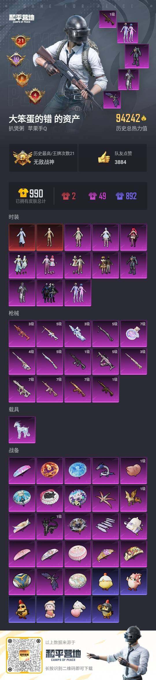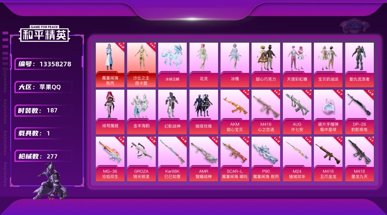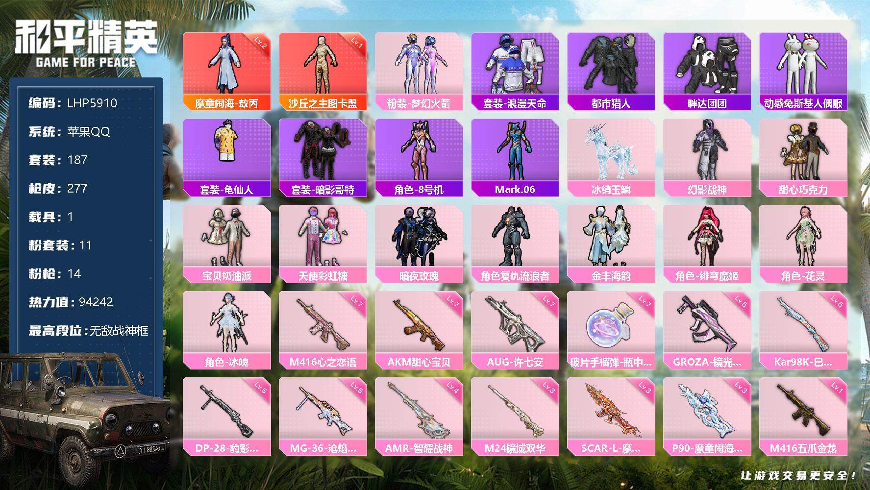 [13358278]【店主推荐捡漏号!可直接换绑】/无敌战神框2/绝世印记4/地铁满天赋 苹果 手Q-无敌战神框-2神装-11粉装-14特效枪-1载具-8粉色飞行器-9.4w热力值-21王牌印记-187套装-277枪皮【红色神装等级】:魔童闹海-敖丙(二级),沙丘之主-图卡盟(一级)【热门品类】:粉装-梦幻火箭,套装-浪漫天命,套装-都市猎人,套装-胖达团团,套装-动感兔斯基人偶服,套装-龟仙人,套装-暗影哥特,角色-8号机,角色-Mark.06【粉色载具】:冰绡玉鳞【粉色套装】:粉装-幻影战神,粉装-甜心巧克力,粉装-宝贝奶油派,粉装-天使彩虹糖,粉装-梦幻火箭,粉装-暗夜玫瑰,角色-复仇流浪者,粉装-金丰海韵,角色-绯穹魔姬,角色-花灵,角色-冰魄【粉色枪皮等级】:AKM-甜心宝贝(七级),SCAR-L-魔童闹海 哪吒(三级),M416-五爪金龙(一级),M416-心之恋语(七级),M416-墨龙九天(一级),GROZA-镜光银凌(五级),AUG-许七安(七级),P90-魔童闹海 敖丙(三级),Kar98K-巳巳如意(五级),M24-镜域双华(三级),AMR-智耀战神(四级),DP-28-豹影疾电(五级),MG-36-沧焰双生(五级),破片手榴弹-瓶中星球(七级)【粉色飞行器】:酣梦熊熊飞行器,星夜魔法师飞行翼,沙丘之主天马,镜域双华-灵镜之阶,龙翔九天飞行器,飞天猪飞行器,灵珠游龙飞行器