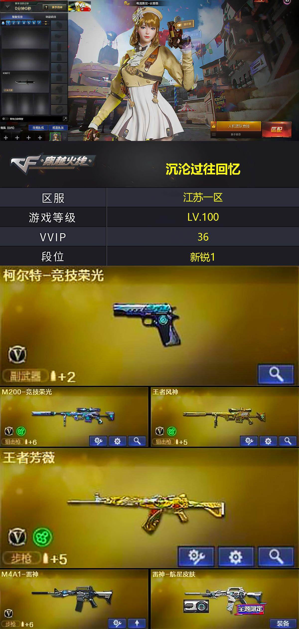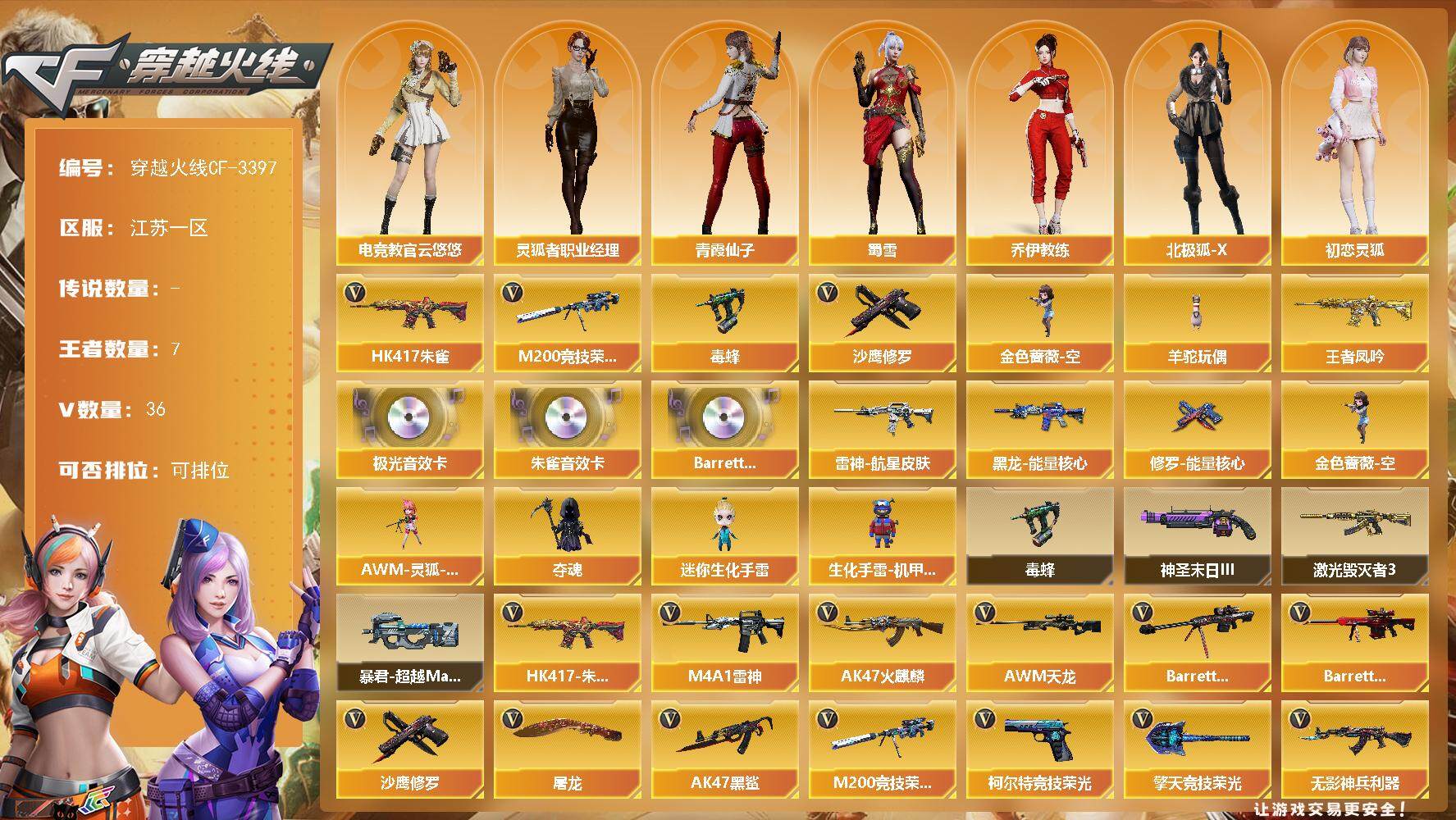[13582574]江苏一区-36V-7王者-0炫金 【热门武器】:HK417-朱雀,M200-竞技荣光,毒蜂,金色蔷薇-空,羊驼玩偶,沙鹰-修罗*2 【王者炫金武器】:王者凤吟 【音效卡】:Barrett-极光音效卡,HK417-朱雀音效卡,Barrett-碧霄极光音效卡*2 【皮肤】:雷神-航星皮肤,黑龙-能量核心,修罗-能量核心 【角色】:电竞教官-云悠悠,乔伊教练,北极狐-X,初恋灵狐,虎妞,嘉年华灵狐,娟娟,灵狐者-职业经理,麻雀,潘多拉-X,青霞仙子,斯沃特-X,蜀雪,新娜塔莎,雪莉杨-摸金校尉,影武者-X 【人偶武器】:金色蔷薇-空,AWM-灵狐-15周年嘉年华,夺魂,迷你生化手雷,生化手雷-机甲核心 【暴走生化】:毒蜂 【挑战大师】:暴君乱世-超越Max,激光毁灭者III,神圣爆裂者-末日III 【英雄级武器】:AK47-火麒麟,M4A1-雷神,AK47-黑鲨,HK417-朱雀,无影-神兵利器,烈火-动感闪耀,超新星-悦享-觉醒版,王者芳薇-觉醒版,AWM-天龙,Barrett-毁灭,Barrett-极光,M200-竞技荣光,王者风神-觉醒版,王者凰鸣-觉醒版,沙鹰-修罗*2,柯尔特-竞技荣光,天神-动感闪耀,屠龙,擎天-竞技荣光*2,屠龙-动感闪耀,王者之击-觉醒版,高爆手雷-竞技荣光*5,手雷-动感闪耀,闪光弹-竞技荣光*5,闪光弹-雷霆王者-觉醒版,烟雾弹-竞技荣光*5,M4A1-赤狱骑士 【道具】:CFS限定背包,女皇终结者-背包,老虎背包,超级背包,哔哩哔哩名片,女皇终结者-魔龙之吻,绿色巨人,灵魂忍者,迷雾幽灵,夺命之镰,防化服*2,金色流光-枪王排位*2,星辰流光-枪王排位,流光-鎏金之域,枪王排位28赛季金色流光,枪王排位29赛季金色流光,动感闪耀表情,EP战队名片,EP战队喷图,EP战队击杀图标,防弹头盔*7,防弹衣*7,C4工具钳*7,手雷包*7 【特殊枪械】: