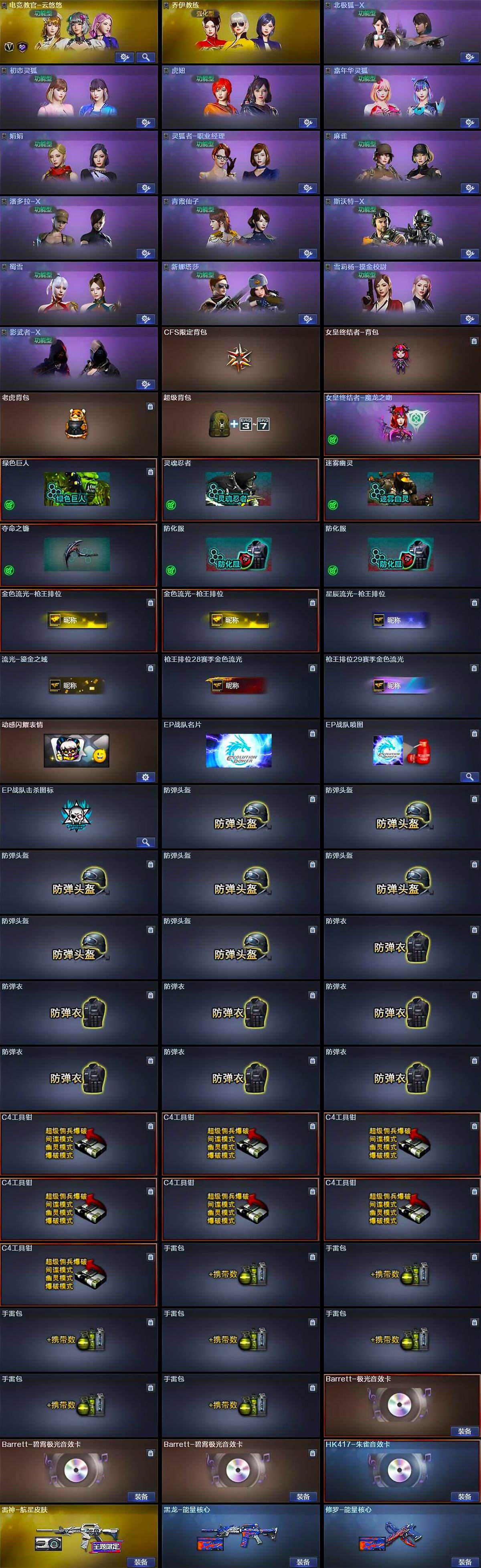 【道具】:CFS限定背包,女皇终结者-背包,老虎背包,超级背包,哔哩哔哩名片,女皇终结者-魔龙之吻,绿色巨人,灵魂忍者,迷雾幽灵,夺命之镰,防化服*2,金色流光-枪王排位*2,星辰流光-枪王排位,流光-鎏金之域,枪王排位28赛季金色流光,枪王排位29赛季金色流光,动感闪耀表情,EP战队名片,EP战队喷图,EP战队击杀图标,防弹头盔*7,防弹衣*7,C4工具钳*7,手雷包*7