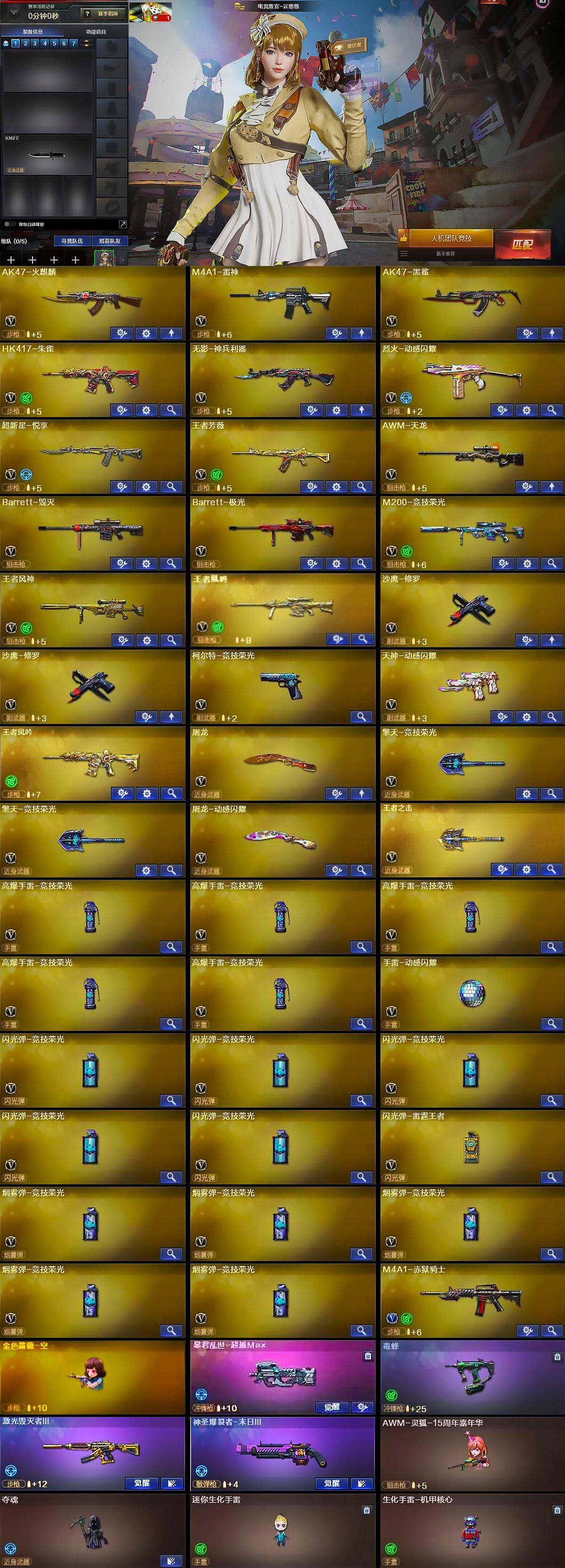 【英雄级武器】:AK47-火麒麟,M4A1-雷神,AK47-黑鲨,HK417-朱雀,无影-神兵利器,烈火-动感闪耀,超新星-悦享-觉醒版,王者芳薇-觉醒版,AWM-天龙,Barrett-毁灭,Barrett-极光,M200-竞技荣光,王者风神-觉醒版,王者凰鸣-觉醒版,沙鹰-修罗*2,柯尔特-竞技荣光,天神-动感闪耀,屠龙,擎天-竞技荣光*2,屠龙-动感闪耀,王者之击-觉醒版,高爆手雷-竞技荣光*5,手雷-动感闪耀,闪光弹-竞技荣光*5,闪光弹-雷霆王者-觉醒版,烟雾弹-竞技荣光*5,M4A1-赤狱骑士