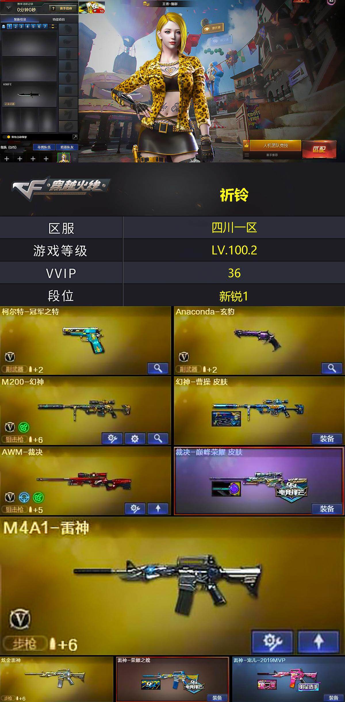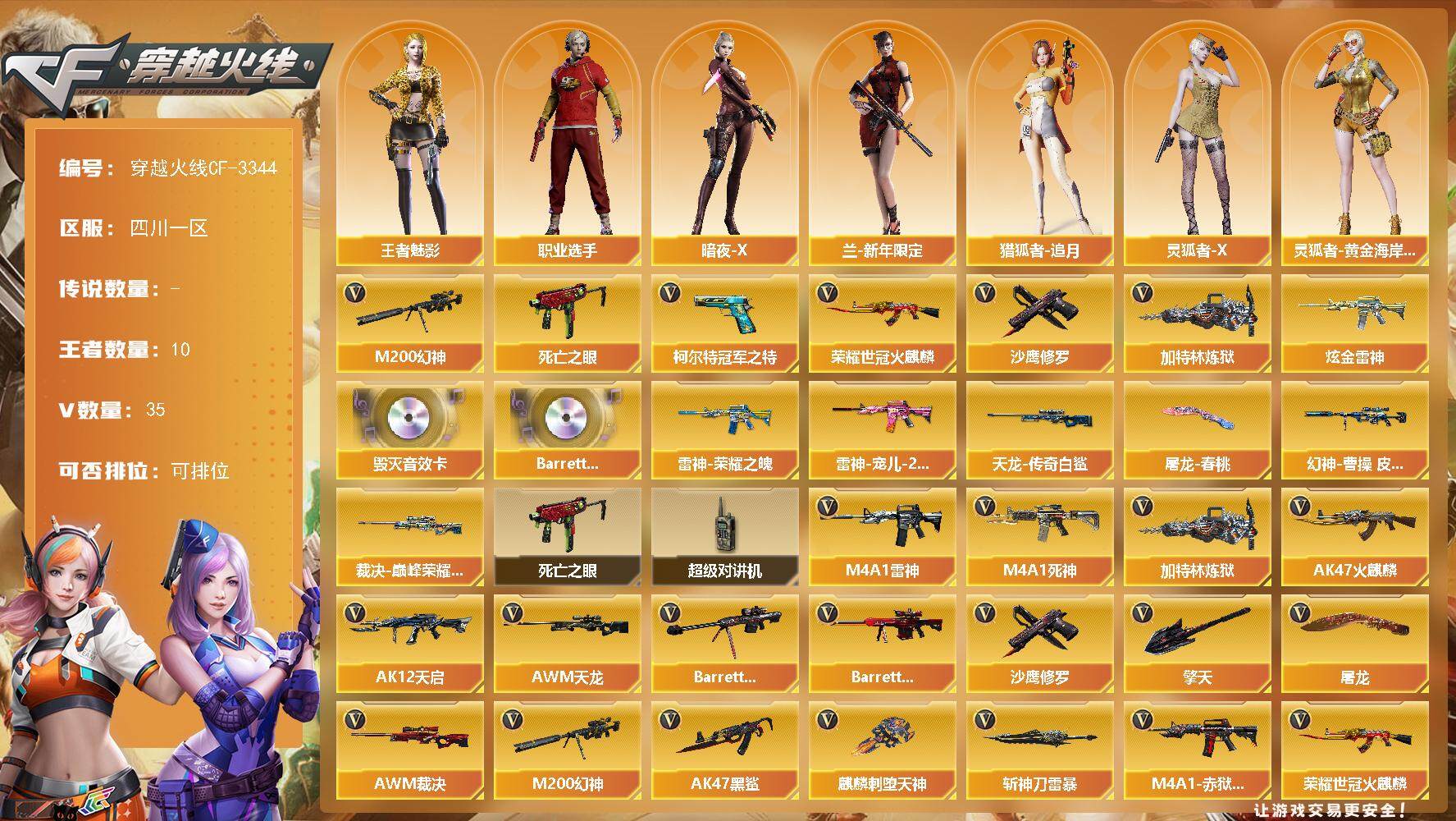 [13587604]四川一区-35V-10王者-1炫金 【热门武器】:M200-幻神,死亡之眼,荣耀世冠-火麒麟,柯尔特-冠军之特,加特林-炼狱*2,沙鹰-修罗*5 【王者炫金武器】:炫金雷神 【音效卡】:Barrett-毁灭音效卡,Barrett-碧霄极光音效卡 【皮肤】:幻神-曹操 皮肤,裁决-巅峰荣耀 皮肤,雷神-荣耀之魄,雷神-宠儿-2019MVP,AWM-天龙-传奇白鲨,屠龙-春桃 皮肤 【角色】:王者-魅影,暗夜-X,兰-新年限定,猎狐者-追月,灵狐者-X,灵狐者-黄金海岸,龙儿-小淘气,麻雀,曼陀罗-X,潘多拉-X,潘多拉-甜心教官,蛇姬,雪莉杨,雪莉杨-摸金校尉,樱-战斗天使,职业选手 【暴走生化】:死亡之眼,超级对讲机 【英雄级武器】:AK47-火麒麟,M4A1-雷神,M4A1-死神,AK12-天启,AK47-黑鲨,荣耀世冠-火麒麟,AWM-天龙,Barrett-毁灭,Barrett-极光,AWM-裁决,M200-幻神,加特林-炼狱*2,沙鹰-修罗*5,柯尔特-冠军之特,Anaconda-玄豹,屠龙*2,麒麟刺-堕天神,擎天,斩神刀-雷暴,王者之击-觉醒版,高爆手雷-雷霆,高爆手雷-雷暴,高爆手雷-堕天神,闪光弹-雷霆,闪光弹-雷暴,闪光弹-堕天神,闪光弹-雷霆王者-觉醒版*3,烟雾弹-雷暴,烟雾弹-堕天神,烟雾弹-玄豹,烟雾弹-雷霆王者-觉醒版*2,M4A1-赤狱骑士 【道具】:BS战队炫彩背包,CFS限定背包,亚洲杯纪念炫彩背包,女皇终结者-背包,炫彩背包,背包-葫芦兄弟,女皇终结者-魔龙之吻,救世主-黑桃战神,绿色巨人,灵魂忍者*2,变异宝贝,迷雾幽灵*2,夺命之镰,防化服*3,巅峰赛先锋-金色流光,流光-鎏金之域,枪王排位28赛季金色流光,枪王排位29赛季金色流光,EP战队名片,EP战队喷图,EP战队击杀图标,防弹头盔*4,防弹衣*4,C4工具钳*6,手雷包*4 【特殊枪械】:2炼狱