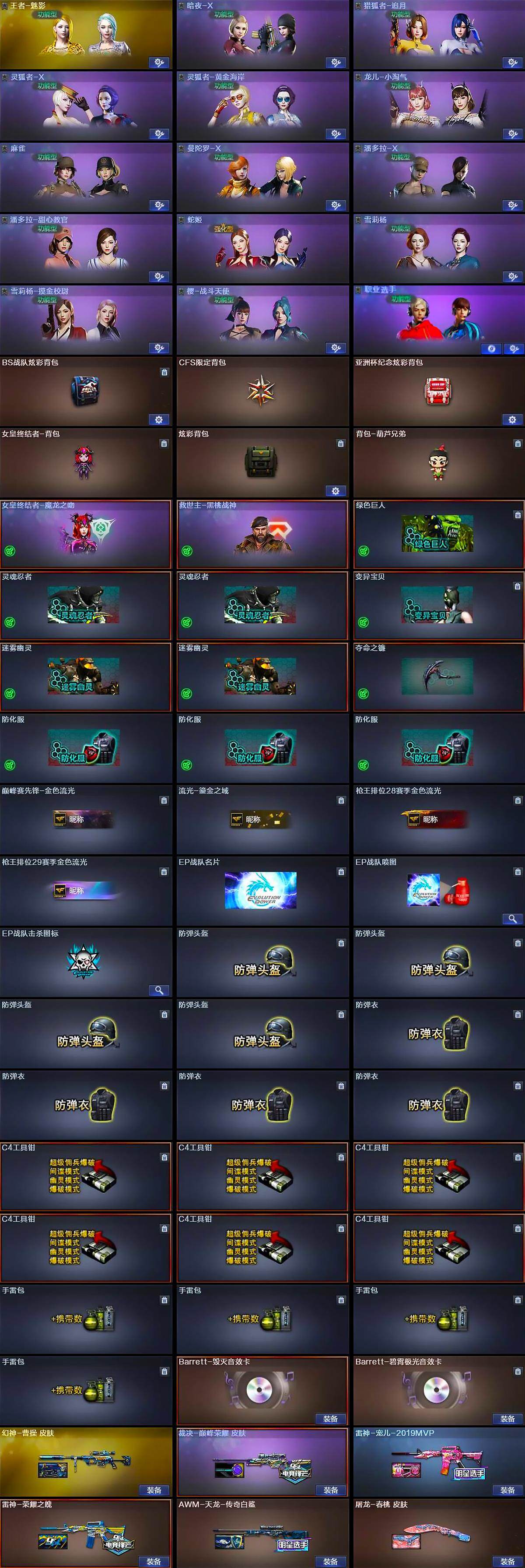 【道具】:BS战队炫彩背包,CFS限定背包,亚洲杯纪念炫彩背包,女皇终结者-背包,炫彩背包,背包-葫芦兄弟,女皇终结者-魔龙之吻,救世主-黑桃战神,绿色巨人,灵魂忍者*2,变异宝贝,迷雾幽灵*2,夺命之镰,防化服*3,巅峰赛先锋-金色流光,流光-鎏金之域,枪王排位28赛季金色流光,枪王排位29赛季金色流光,EP战队名片,EP战队喷图,EP战队击杀图标,防弹头盔*4,防弹衣*4,C4工具钳*6,手雷包*4