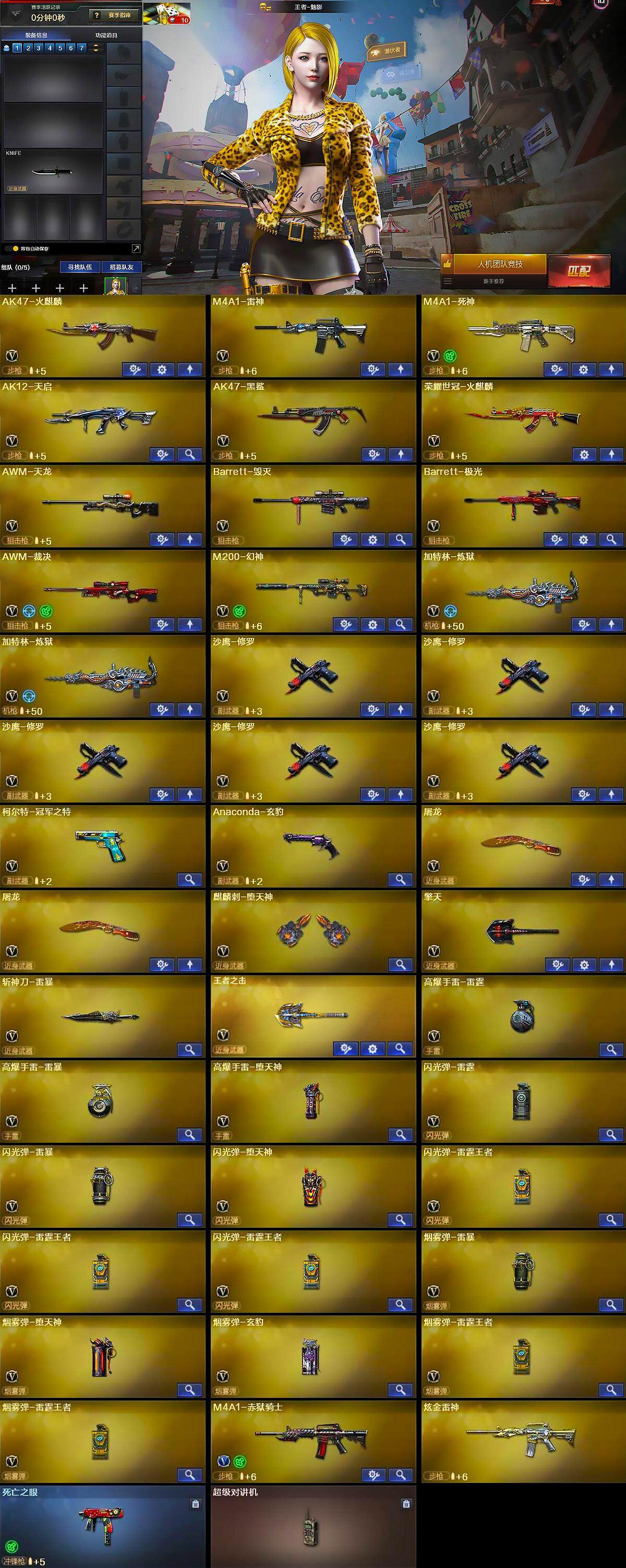 【英雄级武器】:AK47-火麒麟,M4A1-雷神,M4A1-死神,AK12-天启,AK47-黑鲨,荣耀世冠-火麒麟,AWM-天龙,Barrett-毁灭,Barrett-极光,AWM-裁决,M200-幻神,加特林-炼狱*2,沙鹰-修罗*5,柯尔特-冠军之特,Anaconda-玄豹,屠龙*2,麒麟刺-堕天神,擎天,斩神刀-雷暴,王者之击-觉醒版,高爆手雷-雷霆,高爆手雷-雷暴,高爆手雷-堕天神,闪光弹-雷霆,闪光弹-雷暴,闪光弹-堕天神,闪光弹-雷霆王者-觉醒版*3,烟雾弹-雷暴,烟雾弹-堕天神,烟雾弹-玄豹,烟雾弹-雷霆王者-觉醒版*2,M4A1-赤狱骑士