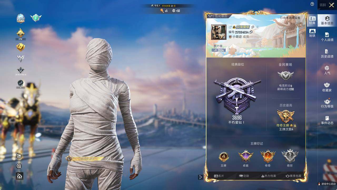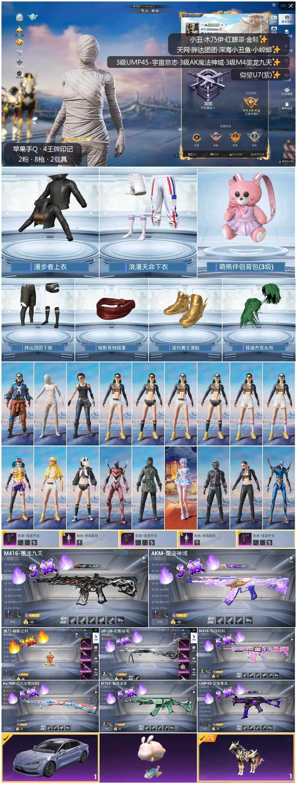 [13503226]【店主推荐捡漏号!可直接换绑】/老木乃伊/素材身法号 苹果 手Q-2粉装-8特效枪-3载具-5粉色飞行器-5.6w热力值-4王牌印记-124套装-178枪皮【热门品类】:粉装-怪诞乔克,套装-浪漫天命,套装-冥河战士,套装-派对舞王,套装-深海小丑鱼,套装-胖达团团,套装-天网终结者,套装-暗影哥特,套装-粉红小猪,角色-8号机,角色-Mark.06,小丑红鼻头,熔岩游骑兵面罩,熔岩游骑兵连帽夹克【粉色载具】:仰望U7(阿盖尔紫),僚机-萌兔起飞,黑曜夜骑【粉色套装】:粉装-怪诞乔克,角色-荧海星豚【粉色枪皮等级】:AKM-魔法神域(三级),M416-电玩时刻(五级),M416-墨龙九天(三级),M762-青锋波束(五级),UMP45-宇宙意志(三级),Kar98K-巳巳如意(五级),DP-28-豹影疾电(五级),镰刀-幽影之判(七级)【粉色飞行器】:沙丘之主天马,龙翔九天飞行器,深渊漩涡飞行器,灵猫魔法师飞行器