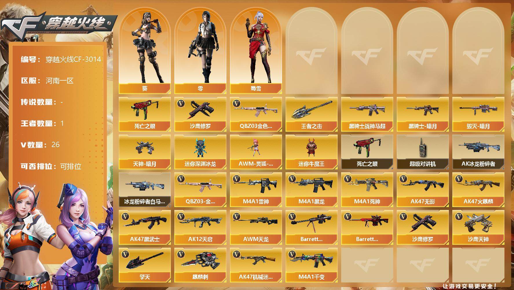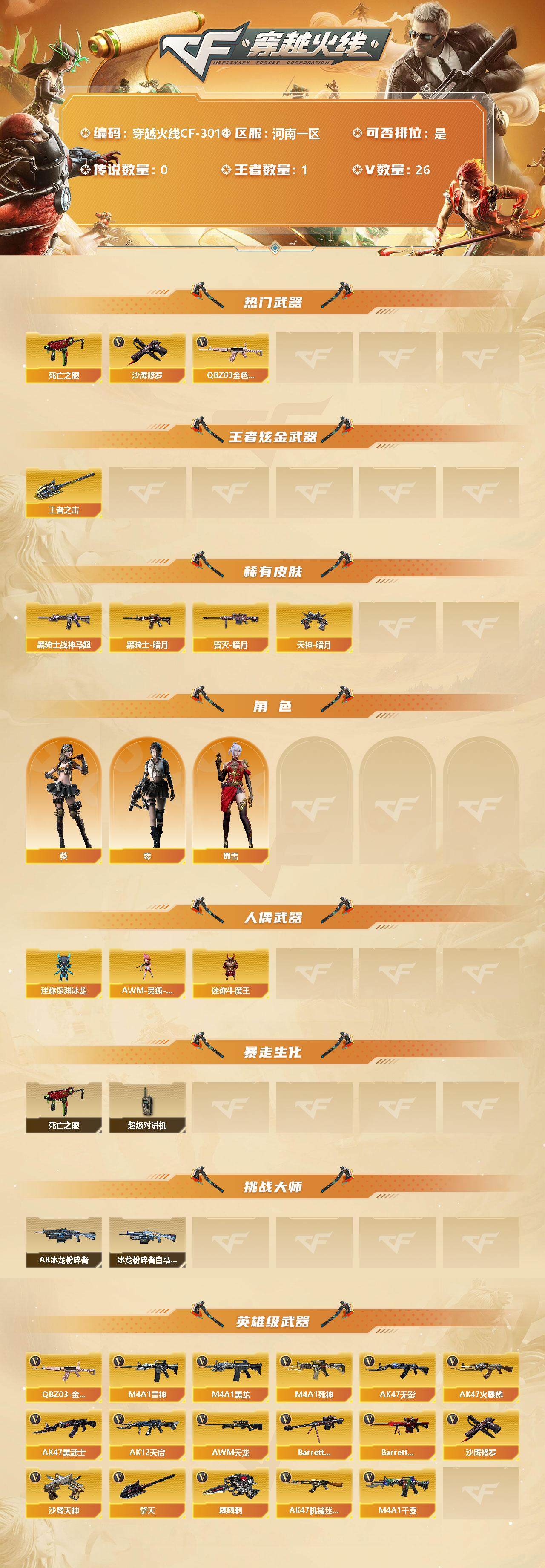 [13605204]河南一区-26V-1王者-0炫金 【热门武器】:QBZ03-金色蔷薇,死亡之眼,沙鹰-修罗*4 【王者炫金武器】:王者之击 【稀有皮肤】:黑骑士-暗月*3,黑骑士-战神马超,毁灭-暗月,天神-暗月*2 【角色】:零,葵,蜀雪 【人偶武器】:AWM-灵狐-15周年嘉年华,迷你深渊冰龙,迷你牛魔王 【暴走生化】:死亡之眼,超级对讲机 【挑战大师】:AK47-冰龙粉碎者,冰龙粉碎者-白马银枪 【英雄级武器】:QBZ03-金色蔷薇,M4A1-雷神*2,M4A1-黑龙,M4A1-死神*2,AK47-无影,AK47-火麒麟,AK47-黑武士,AK12-天启,AWM-天龙*2,Barrett-毁灭,Barrett-极光,AK47-机械迷城,M4A1-千变,沙鹰-天神,沙鹰-修罗*4,麒麟刺,擎天 【特殊枪械】: