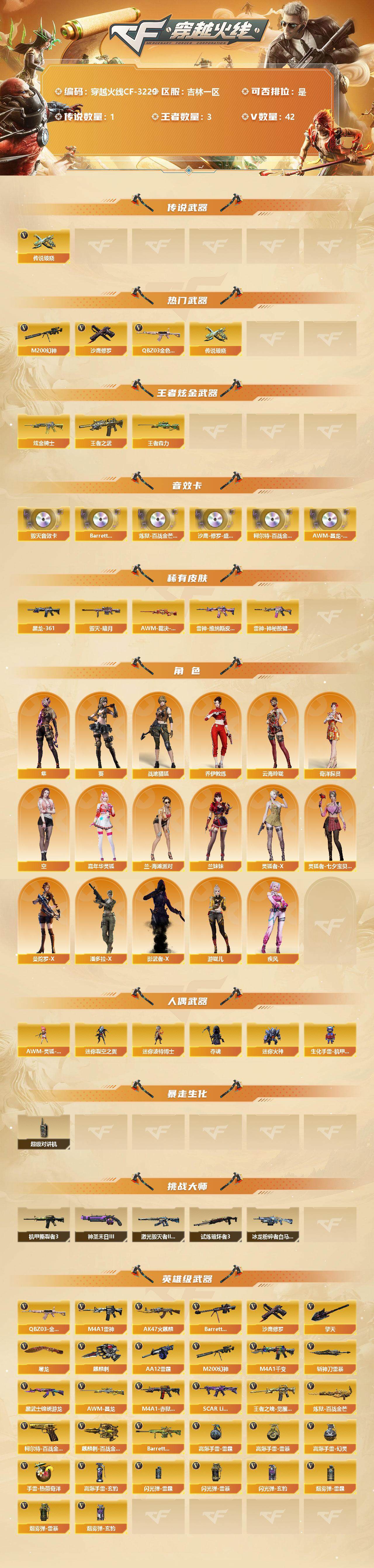 [13370678]吉林一区-42V-3王者-1炫金 【传说武器】:传说破晓 【热门武器】:传说破晓,QBZ03-金色蔷薇,M200-幻神,沙鹰-修罗*2 【王者炫金武器】:王者之武,王者森力,炫金骑士 【音效卡】:Barrett-毁灭音效卡,Barrett-碧霄极光音效卡*2,炼狱-百战金芒-庆典舞曲音效卡,沙鹰-修罗-盛典舞曲音效卡,柯尔特-百战金芒-庆典舞曲音效卡,AWM-昌龙-怀旧音效卡 【皮肤】:AWM-裁决-凤灵皮肤,雷神-维纳斯皮肤,雷神-神秘按键 皮肤,毁灭-暗月,毁灭-航天科技皮肤,M4A1-黑龙-361,屠龙-巅峰荣耀 皮肤,屠龙-惊鸿 皮肤 【角色】:葵,隼,战地猎狐,奇洋探员,乔伊教练,云海玲珑,空,嘉年华灵狐,疾风,兰-海滩派对,兰妹妹,灵狐者-X,灵狐者-七夕宝贝,曼陀罗-X,潘多拉-X,影武者-X,游珑儿 【人偶武器】:AWM-灵狐-15周年嘉年华,迷你裂空之翼,迷你波特博士,夺魂*2,迷你火种,生化手雷-机甲核心 【暴走生化】:超级对讲机 【挑战大师】:冰龙粉碎者-白马银枪,激光毁灭者III-白马银枪*2,机甲撕裂者III,试炼破坏者III,神圣爆裂者-末日III 【英雄级武器】:M4A1-千变,AK47-火麒麟,M4A1-雷神,黑武士-锦绣游龙,SCAR Light-玄豹,QBZ03-金色蔷薇,王者之魄-觉醒版,Barrett-毁灭,M200-幻神,炼狱-百战金芒,AA-12-雷霆,沙鹰-修罗*2,柯尔特-百战金芒,屠龙*2,擎天,麒麟刺,斩神刀-雷暴,麒麟刺-百战金芒,高爆手雷-雷霆,高爆手雷-雷暴,高爆手雷-幻灵*2,手雷-热带奇洋,高爆手雷-玄豹*2,闪光弹-雷霆,闪光弹-雷暴,闪光弹-玄豹*2,烟雾弹-雷霆,烟雾弹-雷暴,烟雾弹-玄豹*3,M4A1-赤狱骑士,AWM-昌龙,Barrett-碧霄极光 【道具】:BS战队炫彩背包,奇洋探员-海龟背包,女皇终结者-背包,沙漠龙背包-猛男专属,炫彩背包-诺拉,炫彩背包,白狐背包,百战金芒炫彩背包,超级背包,金狐背包*2,女皇终结者-魔龙之吻,救世主-黑桃战神,绿色巨人,灵魂忍者*2,变异宝贝,妖姬,迷雾幽灵*2,夺命之镰,防化服*3,金色流光-枪王排位,星辰流光-枪王排位,流光-鎏金之域,流光-再燃火线,枪王排位28赛季金色流光,语音特效-盛典烟火,语音特效-生化,萌萌小葵表情,热带奇洋表情,防弹头盔