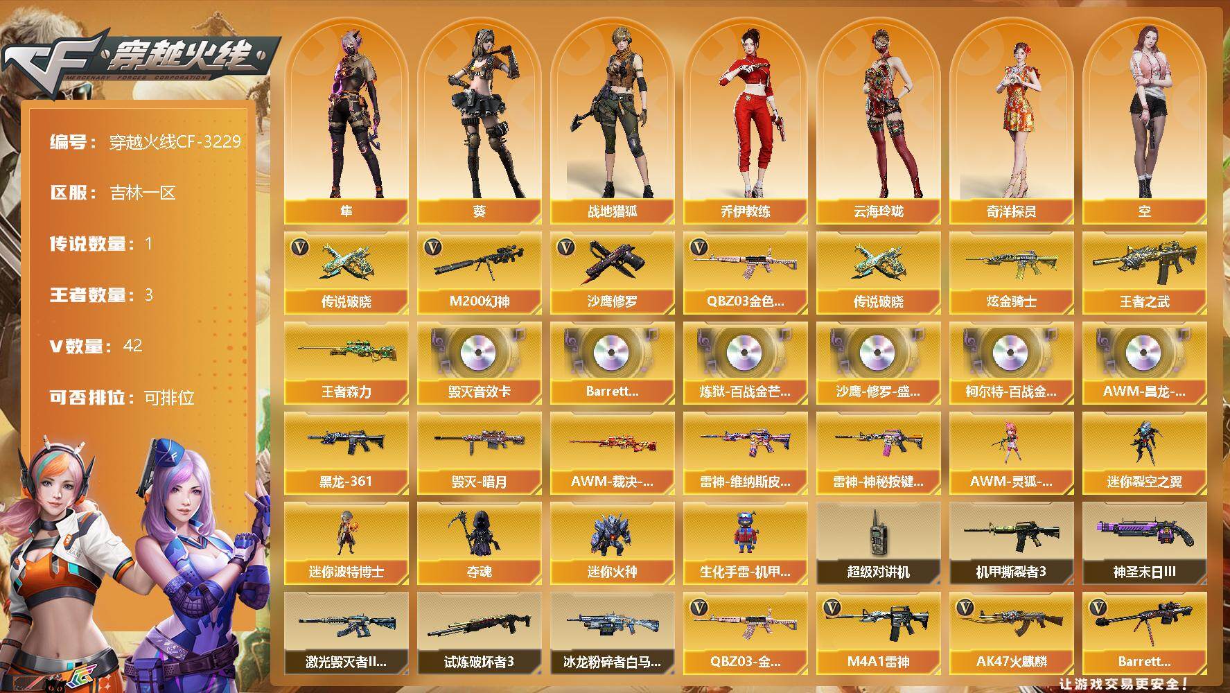 - [12724219]上海二区-39V-22王者-1炫金 【传说武器】:传说辉光,传说幽瞳 【热门武器】:传说辉光,传说幽瞳,王者森决,G36C-幻影,M200-幻神,柯尔特-荣耀世冠白鲨2023*2,金色蔷薇-古蛇迷踪,修罗-古蛇迷踪,八面凌龙,柯尔特-冠军之特,荣耀世冠-柯尔特,Kar98K-星神,M4A1-黑骑士,加特林-炼狱,COP-白鲨*2,炽芒蝶刃,炽芒蝶刃-荣耀世冠白鲨2023 皮肤,荣耀世冠-龙啸 【王者炫金武器】:炫金无影,Barrett-雷霆王者,M4A1-雷霆王者,王者霜心,王者森决,雷霆王者之锋*2 【音效卡】:M200-幻神音效卡,M4A1-雷神音效卡,M4A1-黑骑士音效卡,Barrett-毁灭音效卡,Kar98K-星神音效卡,八面凌龙音效卡 【稀有皮肤】:M200-幻神-黄忠皮肤,幻神-丹凤,幻神-CFS2022,幻神-Heartshot 皮肤,幻神-荣耀世冠白鲨2023 皮肤,星神-傲竹金蛇 皮肤,黑骑士-冠军之势,毁灭-星空,毁灭-CFS2020,炼狱-夏佐 皮肤,炽芒蝶刃-荣耀世冠白鲨2023 皮肤,屠龙-荣耀之锋 【角色】:王者炫,王者凌霄,王者晴雅,雨棠,晴雅,星际战将,炽天使 【人偶武器】:COP-白鲨*2,巴雷特-零-水下丽影 【暴走生化】:双面神 【英雄级武器】:柯尔特-竞技荣光,擎天-竞技荣光,烟雾弹-竞技荣光,马来剑-夜魔,麒麟刺-堕天神,荣耀世冠-柯尔特,荣耀世冠-龙啸,G36C-幻影,金色蔷薇-古蛇迷踪,八面凌龙,M4A1-雷神,M4A1-黑骑士,加特林-炼狱,Barrett-毁灭,AWM-裁决,Kar98K-星神,M200-幻神,柯尔特-冠军之特,修罗-古蛇迷踪,沙鹰-天神,炽芒蝶刃,屠龙*3 【特殊枪械】:1黑骑士,1炼狱