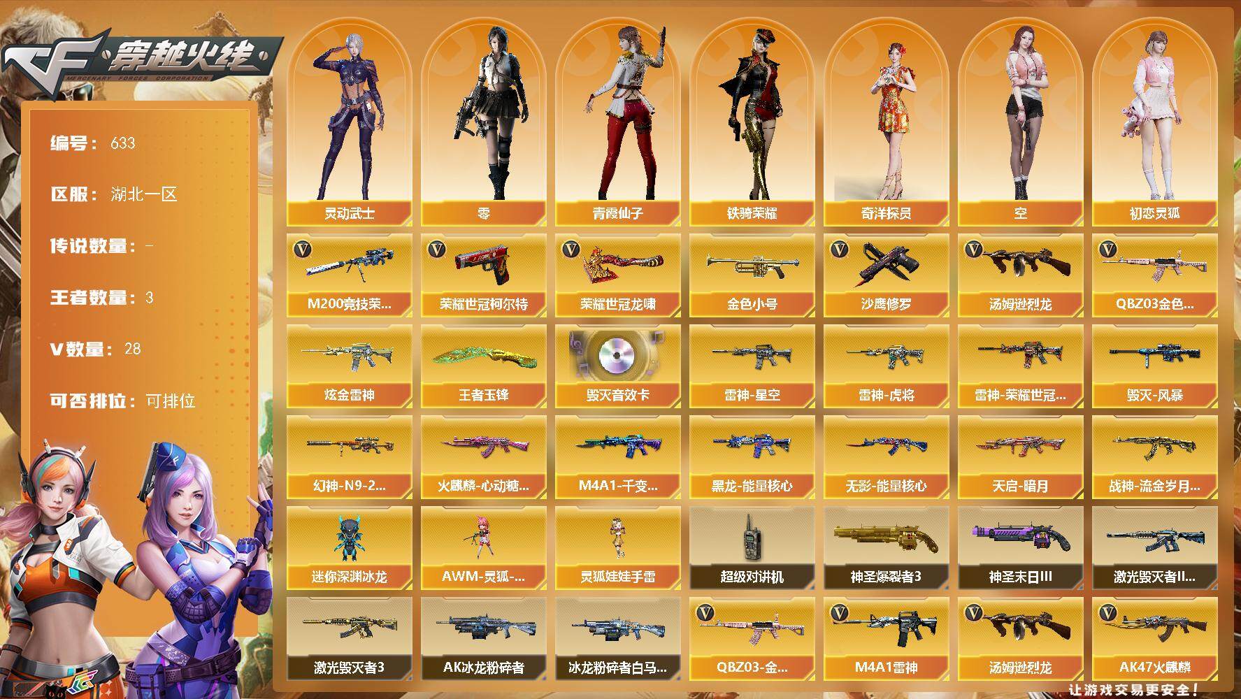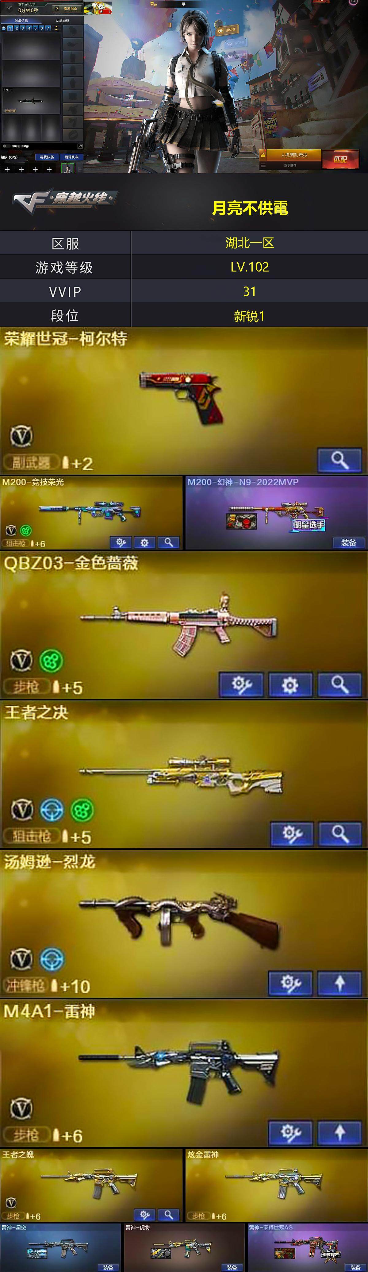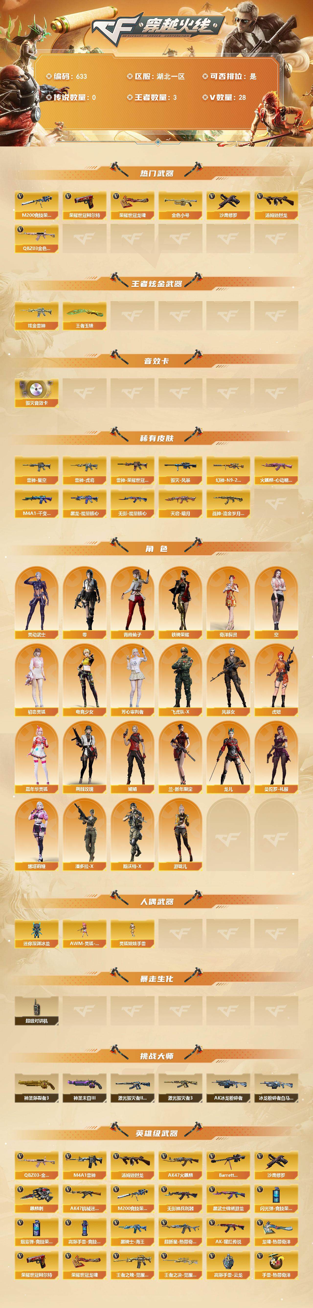 [13613204]湖北一区-28V-3王者-1炫金 【热门武器】:QBZ03-金色蔷薇,M200-竞技荣光,荣耀世冠-柯尔特,金色小号,汤姆逊-烈龙,沙鹰-修罗,荣耀世冠-龙啸 【王者炫金武器】:王者玉锋,炫金雷神 【音效卡】:Barrett-毁灭音效卡 【皮肤】:M200-幻神-N9-2022MVP,雷神-星空,雷神-虎将,雷神-荣耀世冠AG,火麒麟-心动糖果,毁灭-风暴,M4A1-千变-孔明皮肤,黑龙-能量核心,无影-能量核心,天启-暗月,战神-流金岁月皮肤 【角色】:零,奇洋探员,空,初恋灵狐,电竞少女,芳心审判者,飞虎队-X,风暴女,虎妞,嘉年华灵狐,荆棘玫瑰,娟娟,兰-新年限定,灵动武士,龙儿,曼陀罗-礼服,娜塔莉娅,潘多拉-X,青霞仙子,斯沃特-X,铁骑荣耀,游珑儿 【人偶武器】:AWM-灵狐-15周年嘉年华,迷你深渊冰龙,灵狐娃娃手雷 【暴走生化】:超级对讲机 【挑战大师】:神圣爆裂者III,AK47-冰龙粉碎者,冰龙粉碎者-白马银枪,激光毁灭者III-白马银枪,激光毁灭者III*2,神圣爆裂者-末日III 【英雄级武器】:AK47-火麒麟,M4A1-雷神,AK47-机械迷城,无影-神兵利器,黑武士-锦绣游龙,超新星-热带奇洋,QBZ03-金色蔷薇,王者之魄-觉醒版,AK-47-猩红传说,黑骑士-海王,Barrett-毁灭,M200-竞技荣光,王者之决-觉醒版,汤姆逊-烈龙,沙鹰-修罗,荣耀世冠-柯尔特,麒麟刺,龙啸-热带奇洋,荣耀世冠-龙啸,高爆手雷-竞技荣光*2,高爆手雷-云龙*2,手雷-热带奇洋,闪光弹-竞技荣光,闪光弹-云龙*3,烟雾弹-竞技荣光*2,烟雾弹-云龙 【道具】:全能枪王背包,奇洋探员-海龟背包,炫彩背包,热带奇洋炫彩背包,超级背包,绿色巨人,灵魂忍者*2,迷雾幽灵,生化弹匣,夺命之镰,防化服*2,金色流光-枪王排位,星辰流光-枪王排位,枪王排位28赛季金色流光,热带奇洋表情,防弹头盔*5,防弹衣*7,C4工具钳*6,手雷包*6 【特殊枪械】:1烈龙