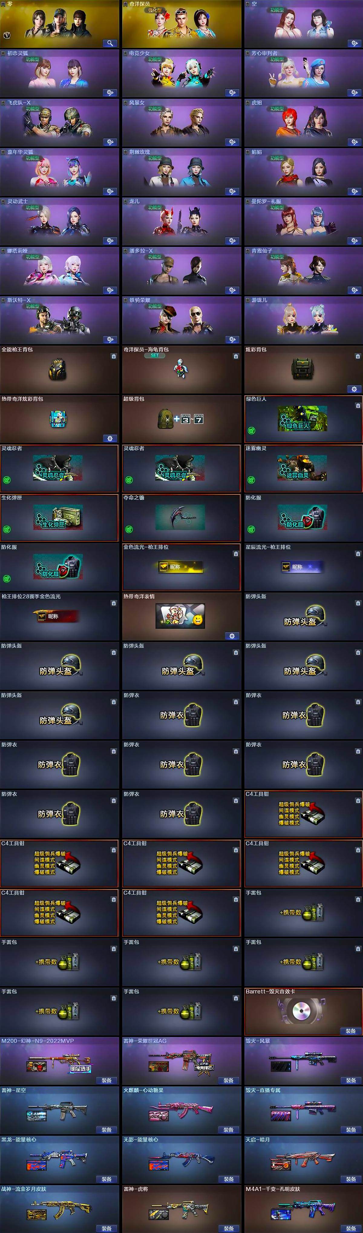 【道具】:全能枪王背包,奇洋探员-海龟背包,炫彩背包,热带奇洋炫彩背包,超级背包,绿色巨人,灵魂忍者*2,迷雾幽灵,生化弹匣,夺命之镰,防化服*2,金色流光-枪王排位,星辰流光-枪王排位,枪王排位28赛季金色流光,热带奇洋表情,防弹头盔*5,防弹衣*7,C4工具钳*6,手雷包*6
