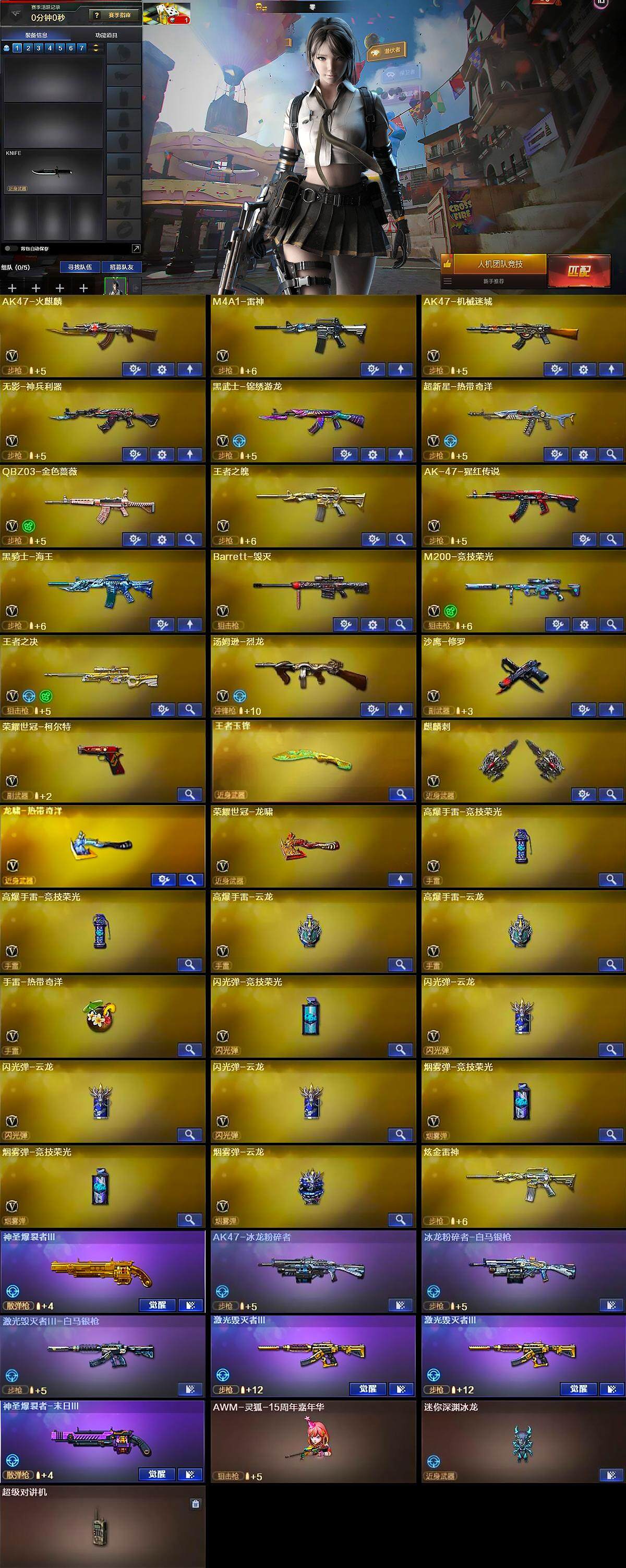 【英雄级武器】:AK47-火麒麟,M4A1-雷神,AK47-机械迷城,无影-神兵利器,黑武士-锦绣游龙,超新星-热带奇洋,QBZ03-金色蔷薇,王者之魄-觉醒版,AK-47-猩红传说,黑骑士-海王,Barrett-毁灭,M200-竞技荣光,王者之决-觉醒版,汤姆逊-烈龙,沙鹰-修罗,荣耀世冠-柯尔特,麒麟刺,龙啸-热带奇洋,荣耀世冠-龙啸,高爆手雷-竞技荣光*2,高爆手雷-云龙*2,手雷-热带奇洋,闪光弹-竞技荣光,闪光弹-云龙*3,烟雾弹-竞技荣光*2,烟雾弹-云龙