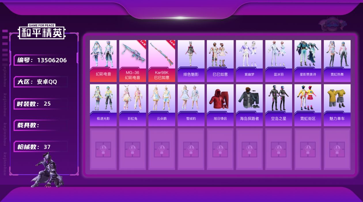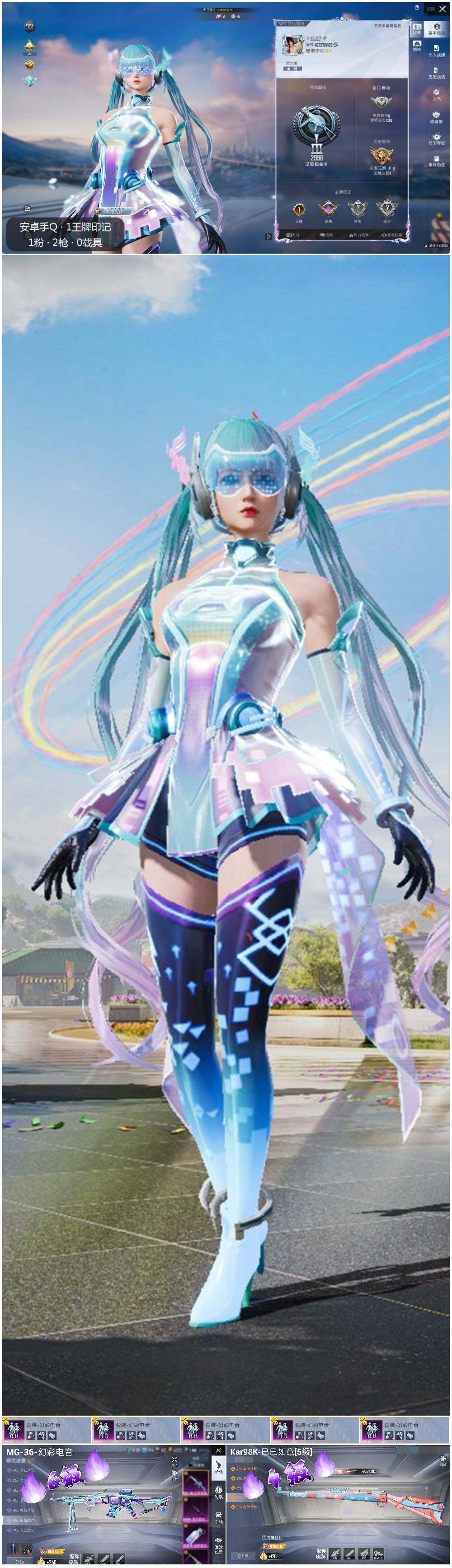 [13506206]安卓 手Q-1粉装-2特效枪-1粉色飞行器-1.1w热力值-1王牌印记-25套装-37枪皮【粉色套装】:粉装-幻彩电音【粉色枪皮等级】:Kar98K-巳巳如意(四级),MG-36-幻彩电音(六级)【粉色飞行器】:时光之誓飞行器