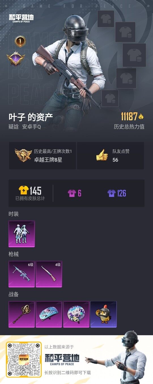 - [13789256]【店主推荐捡漏号!可直接换绑】/地铁满天赋 安卓 手Q-3粉装-10特效枪-5.8w热力值-6王牌印记-153套装-198枪皮【热门品类】:套装-奇异狩猎者,角色-军刀雅典娜,套装-龟仙人,角色-8号机【粉色套装】:粉装-第五大道,套装-创世·救赎,粉装-星穹咏叹调【粉色枪皮等级】:AKM-绿萝繁花(五级),SCAR-L-锦绣绵绵(五级),M416-电玩时刻(五级),GROZA-镜光银凌(五级),AUG-暖羊咩咩(五级),UMP45-量子极限(五级),Kar98K-巳巳如意(五级),Mk14-甜梦熊击(五级),AMR-智耀战神(七级),DP-28-豹影疾电(五级)