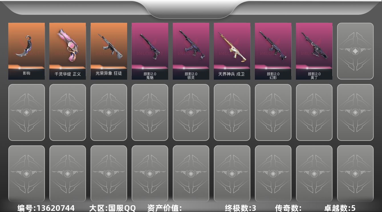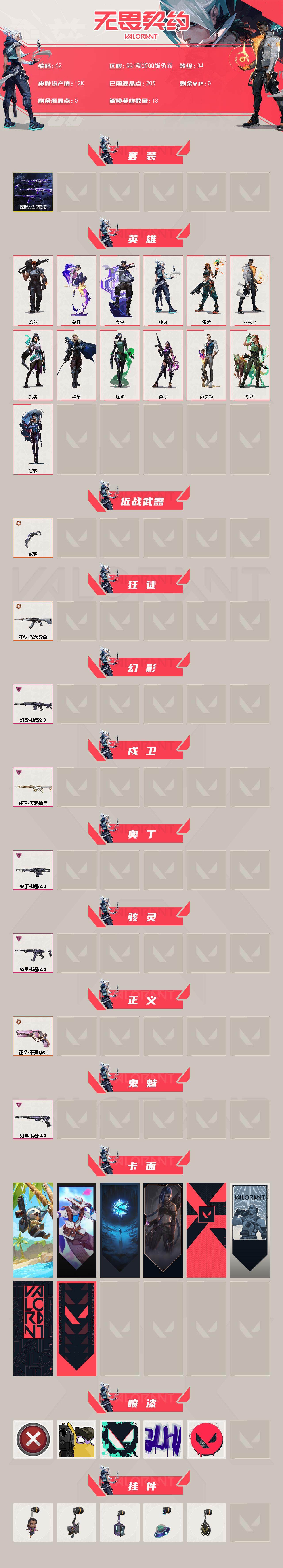 [13620744]【套装】:掠影//2.0套装 【英雄】:炼狱,暮蝶,壹决,捷风,雷兹,不死鸟,贤者,猎枭,蝰蛇,芮娜,尚勃勒,斯凯,黑梦 【近战 武器】:近战武器-影钩 【狂徒】:狂徒-光荣异象 【幻影】:幻影-掠影//2.0 【戍卫】:戍卫-天界神兵 【奥丁】:奥丁-掠影//2.0 【骇灵】:骇灵-掠影//2.0 【正义】:正义-千灵华绽 【鬼魅】:鬼魅-掠影//2.0 【卡面】:树懒大作战 卡面,无畏契约GO!第一卷:零 卡面,无垠星环 卡面,《双城之战》金克丝 卡面,代号红色 卡面,新兵报到 卡面,V契约 卡面,无畏契约 卡面 【喷漆】:买装还是存钱 喷漆,放下武器 喷漆,胜利属于无畏契约 喷漆,GLHF 喷漆,无畏契约 喷漆 【挂饰】:无畏契约GO!第一卷 芮娜 挂饰,鱼骨头 挂饰,动力机箱 挂饰,天外飞客 挂饰,无畏契约 纪念币 挂饰