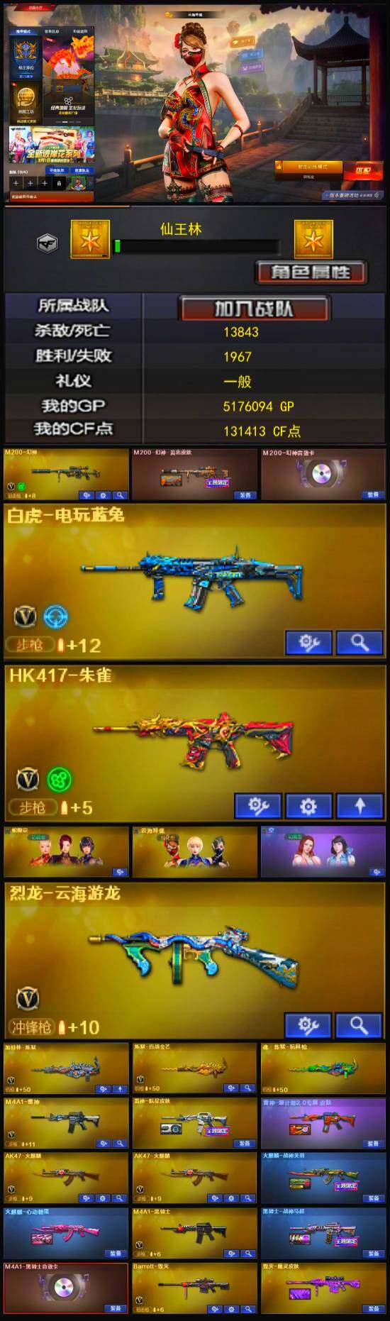 【英雄级武器】:M4A1-千变*2,AK47-火麒麟*2,M4A1-雷神,M4A1-黑骑士,AK47-黑武士,AK12-天启,AK47-机械迷城,HK417-朱雀,金色蔷薇-古蛇迷踪,AK-47-猩红传说*6,白虎-电玩蓝兔,Barrett-毁灭,M200-幻神,加特林-炼狱,沙鹰-修罗,修罗-古蛇迷踪,擎天-云海游龙,屠龙-云海游龙