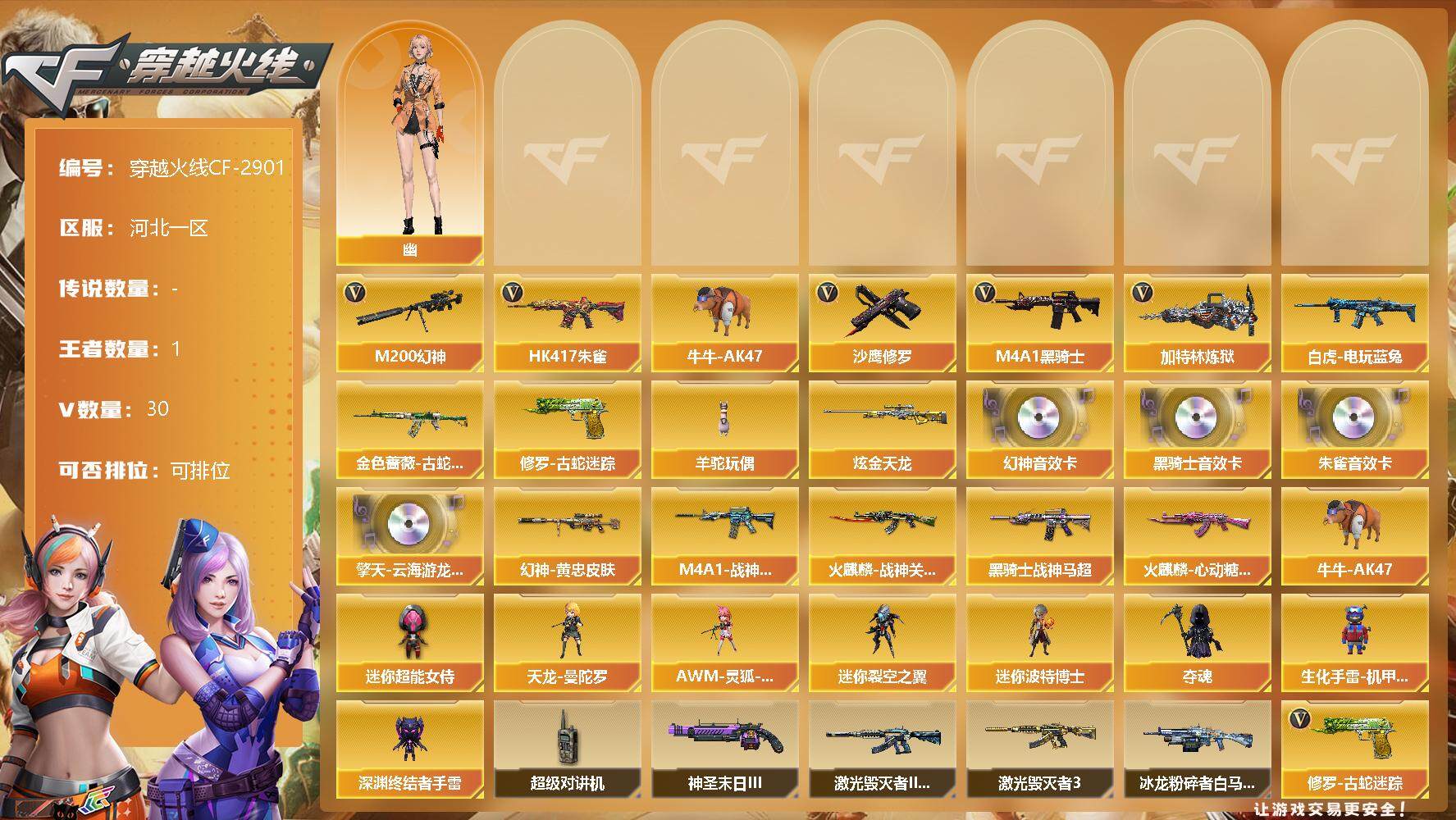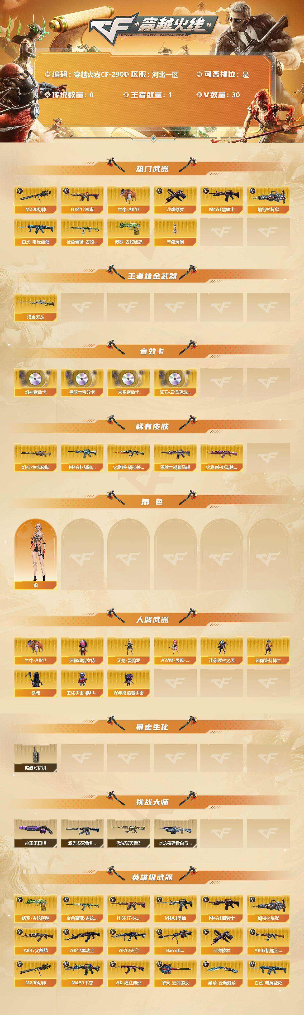 [13515316]河北一区-30V-1王者-1炫金 【热门武器】:HK417-朱雀,M200-幻神,金色蔷薇-古蛇迷踪,修罗-古蛇迷踪,白虎-电玩蓝兔,牛牛-AK47,M4A1-黑骑士,加特林-炼狱,羊驼玩偶,沙鹰-修罗 【王者炫金武器】:炫金天龙 【音效卡】:擎天-云海游龙音效卡,M200-幻神音效卡,M4A1-黑骑士音效卡,HK417-朱雀音效卡 【皮肤】:M200-幻神-黄忠皮肤,M4A1-战神赵云,雷神-航星皮肤,雷神-源计划2.0专属 皮肤,M4A1-再燃火线,火麒麟-战神关羽,火麒麟-心动糖果,毁灭-魔灵皮肤,黑骑士-战神马超 【角色】:幽 【人偶武器】:天龙-曼陀罗,AWM-灵狐-15周年嘉年华,牛牛-AK47,迷你超能女侍,迷你裂空之翼,迷你波特博士,夺魂*3,生化手雷-机甲核心*2,深渊终结者手雷*2 【暴走生化】:超级对讲机 【挑战大师】:冰龙粉碎者-白马银枪*2,激光毁灭者III-白马银枪,激光毁灭者III*2,神圣爆裂者-末日III 【英雄级武器】:M4A1-千变*2,AK47-火麒麟*2,M4A1-雷神,M4A1-黑骑士,AK47-黑武士,AK12-天启,AK47-机械迷城,HK417-朱雀,金色蔷薇-古蛇迷踪,AK-47-猩红传说*6,白虎-电玩蓝兔,Barrett-毁灭,M200-幻神,加特林-炼狱,沙鹰-修罗,修罗-古蛇迷踪,擎天-云海游龙,屠龙-云海游龙 【特殊枪械】:1黑骑士,1炼狱