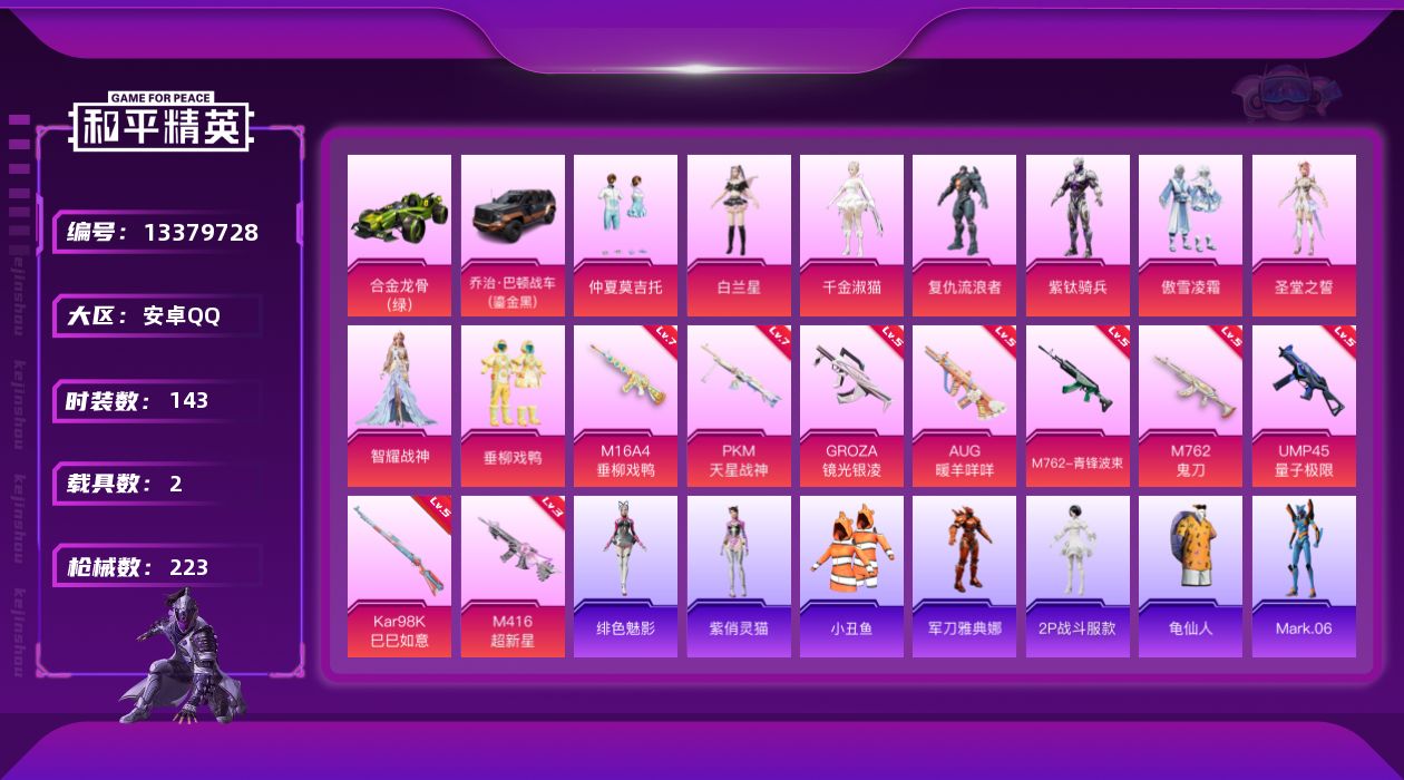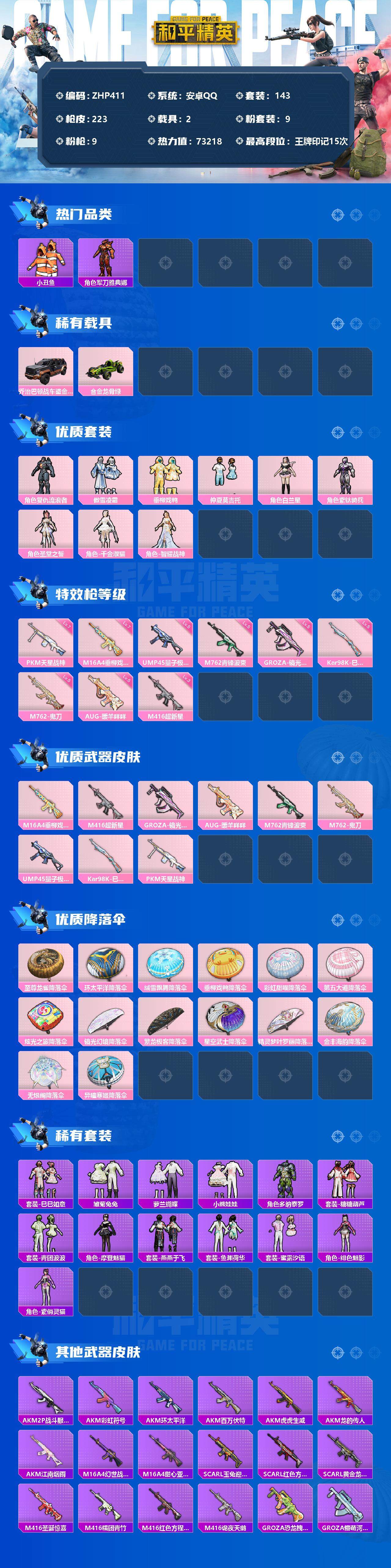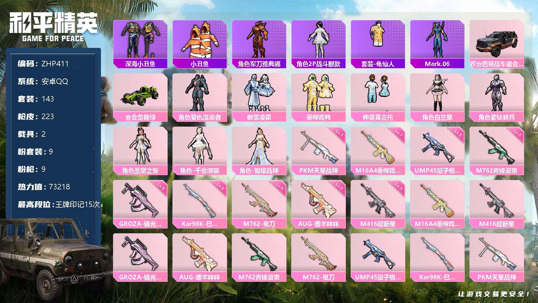 [13379728]【店主推荐捡漏号!可直接换绑】素材身法号/绝世印记3/地铁满天赋 安卓 手Q-9粉装-9特效枪-2载具-1粉色飞行器-7.3w热力值-15王牌印记-143套装-223枪皮【热门品类】:套装-深海小丑鱼,套装-小丑鱼,角色-军刀雅典娜,角色-2P战斗服款,套装-龟仙人,角色-Mark.06【粉色载具】:乔治巴顿战车(鎏金黑),合金龙骨(绿)【粉色套装】:角色-复仇流浪者,粉装-傲雪凌霜,粉装-垂柳戏鸭,粉装-仲夏莫吉托,角色-白兰星,角色-紫钛骑兵,角色-圣堂之誓,角色-千金淑猫,角色-智耀战神【粉色枪皮等级】:M16A4-垂柳戏鸭(七级),M416-超新星(三级),GROZA-镜光银凌(五级),AUG-暖羊咩咩(五级),M762-青锋波束(五级),M762-鬼刀(五级),UMP45-量子极限(五级),Kar98K-巳巳如意(五级),PKM-天星战神(七级)