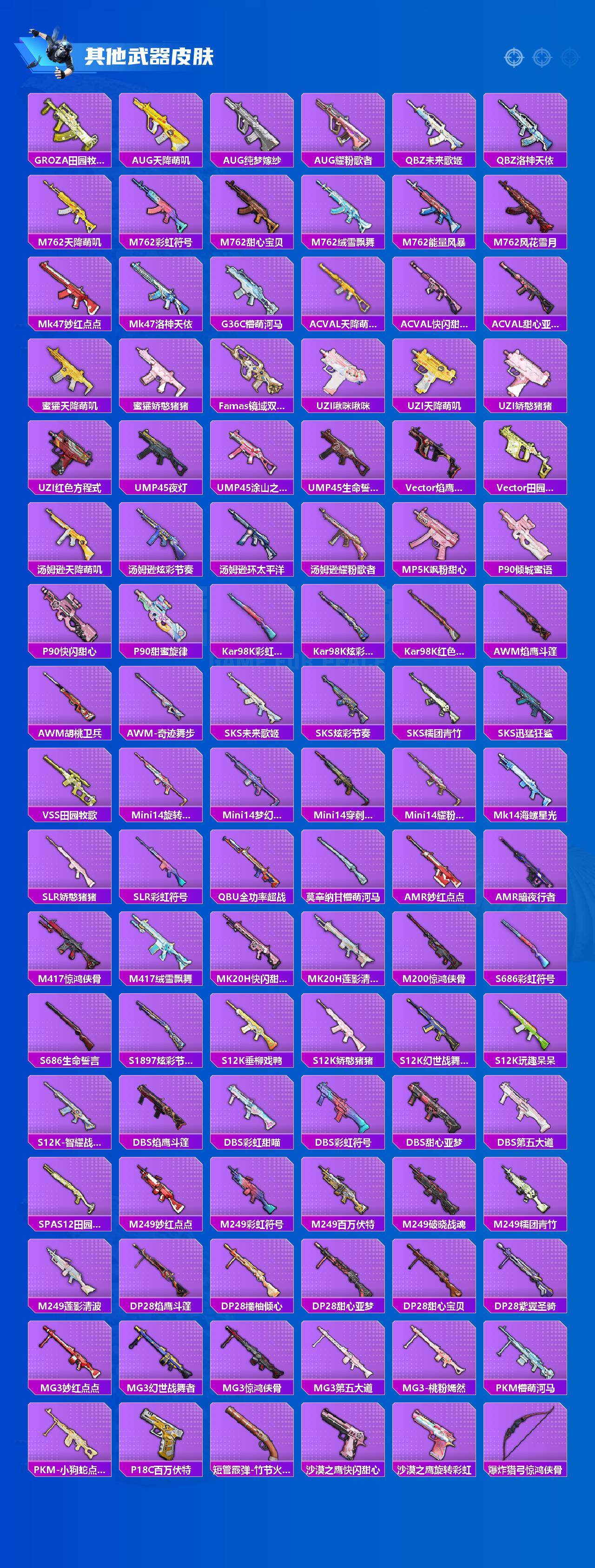 M16A4-垂柳戏鸭,M416-超新星,GROZA-镜光银凌,AUG-暖羊咩咩,M762-青锋波束,M762-鬼刀,UMP45-量子极限,Kar98K-巳巳如意,PKM-天星战神