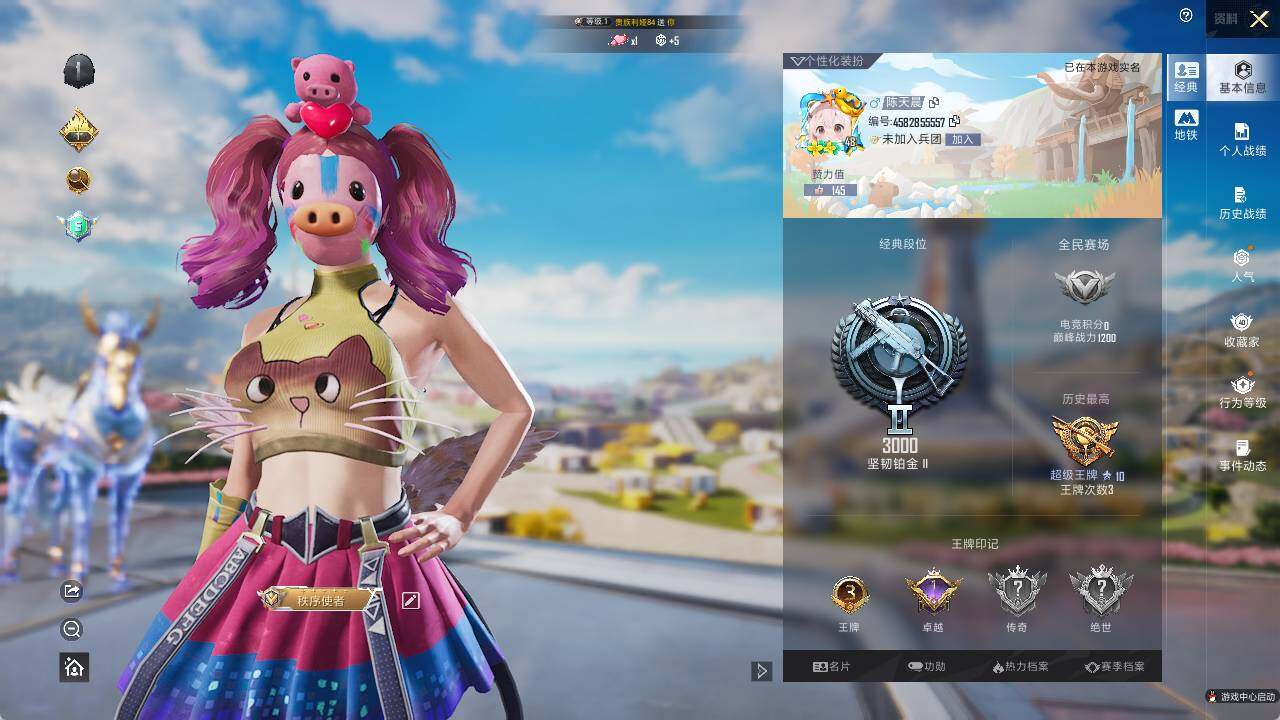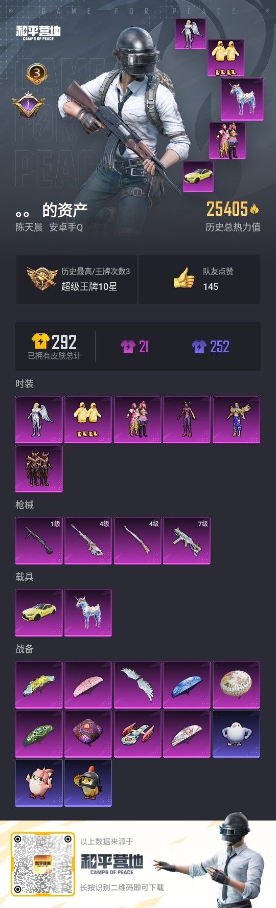- [10046147]实名: 可修改 时装数: 294 载具数: 2 枪械数: 119 战备数: 69 热门装扮: 奇异狩猎者,深海曼妙,向日葵,极致幻想 载具: 阿斯顿·马丁DBS(绿),合金龙骨(绿) 稀有枪皮: AKM炫紫旋律,M416心之恋语