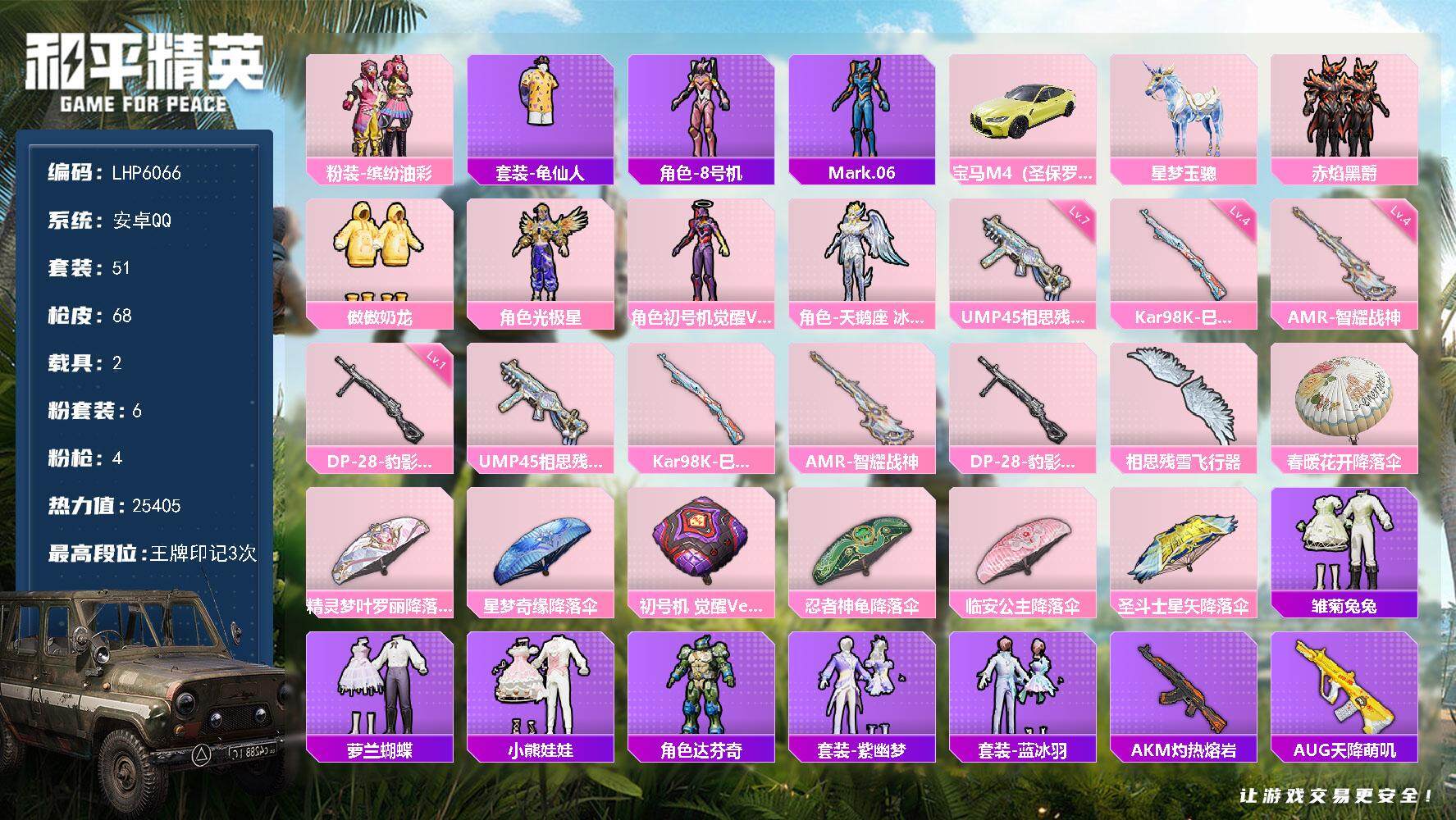 [13622684]【店主推荐捡漏号!可直接换绑】/素材身法号/地铁满天赋 安卓 手Q-6粉装-4特效枪-2载具-2粉色飞行器-2.5w热力值-3王牌印记-51套装-68枪皮【热门品类】:粉装-缤纷油彩,套装-龟仙人,角色-8号机,角色-Mark.06【粉色载具】:宝马M4(圣保罗黄),星梦玉骢【粉色套装】:粉装-缤纷油彩,粉装-赤焰黑爵,粉装-傲傲奶龙,角色-光极星,角色-初号机 觉醒Ver.,角色-天鹅座 冰河【粉色枪皮等级】:UMP45-相思残雪(七级),Kar98K-巳巳如意(四级),AMR-智耀战神(四级),DP-28-豹影疾电(一级)【粉色飞行器】:相思残雪飞行器