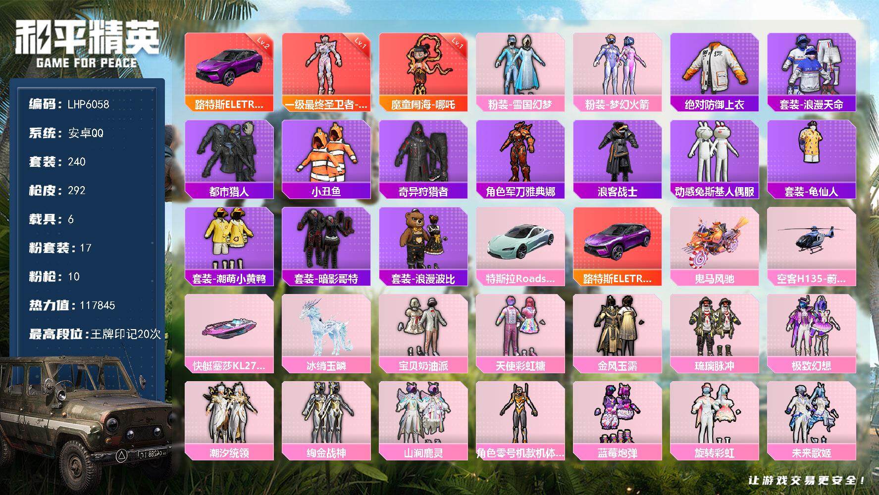 [13622824]【店主推荐捡漏号!可直接换绑】/素材身法号 安卓 手Q-2神装-17粉装-10特效枪-6载具-9粉色飞行器-11.7w热力值-20王牌印记-240套装-292枪皮【红色载具】:路特斯ELETRE(电光紫)(二级)【红色神装等级】:魔童闹海-哪吒(一级),最终圣卫者-帕修斯(一级)【热门品类】:粉装-雪国幻梦,粉装-梦幻火箭,绝对防御上衣,套装-浪漫天命,套装-都市猎人,套装-小丑鱼,套装-奇异狩猎者,角色-军刀雅典娜,套装-浪客战士,套装-动感兔斯基人偶服,套装-龟仙人,套装-潮萌小黄鸭,套装-暗影哥特,套装-浪漫波比【粉色载具】:特斯拉Roadster(水滴蓝),路特斯ELETRE(电光紫),鬼马风驰,空客H135-蔚蓝之翼,快艇-塞莎KL27(霓虹粉),冰绡玉鳞【粉色套装】:粉装-宝贝奶油派,粉装-天使彩虹糖,粉装-雪国幻梦,粉装-梦幻火箭,粉装-金风玉露,粉装-琉璃脉冲,粉装-极致幻想,粉装-潮汐统领,粉装-绚金战神,粉装-山涧鹿灵,角色-零号机款机体服,粉装-蓝莓炮弹,粉装-旋转彩虹,粉装-未来歌姬,角色-女娲灵识,粉装-星穹咏叹调,角色-异瞳寒姬【粉色枪皮等级】:AKM-梦之光华(五级),SCAR-L-魔童闹海 哪吒(三级),M416-五爪金龙(七级),AUG-星之彼岸(三级),M762-甜蜜誓约(六级),Vector-最终圣卫者(三级),Kar98K-创世·救赎(四级),Kar98K-巳巳如意(五级),DP-28-豹影疾电(五级),平底锅-林间仙鹿(六级)【粉色飞行器】:梦幻火箭飞行器,潮汐统领飞行器,暗翼战神飞行器,星之彼岸飞行器,太空嘟嘟飞行器,终晖之翼飞行器,飞天猪飞行器,灵珠游龙飞行器