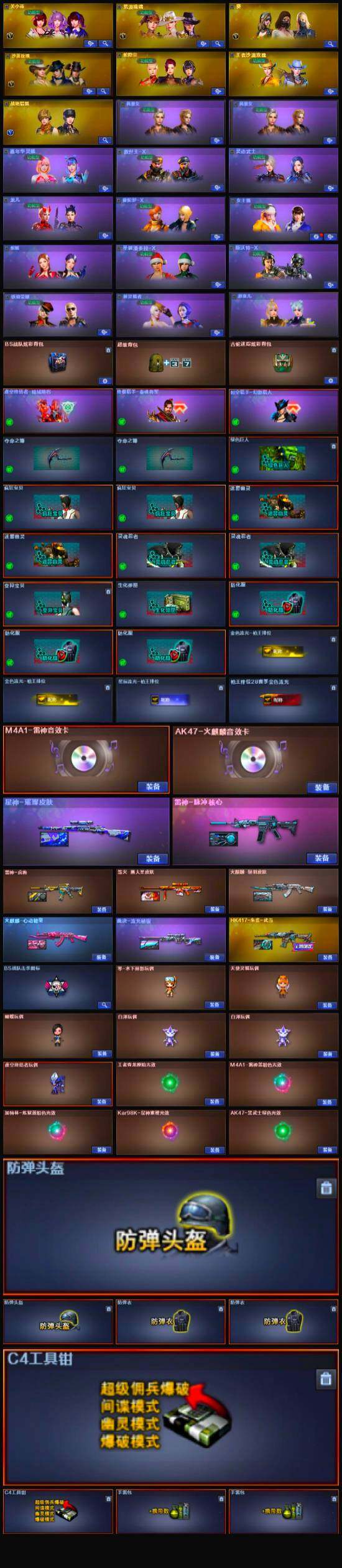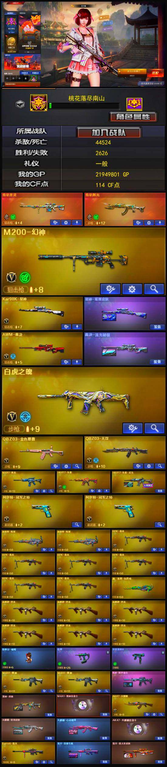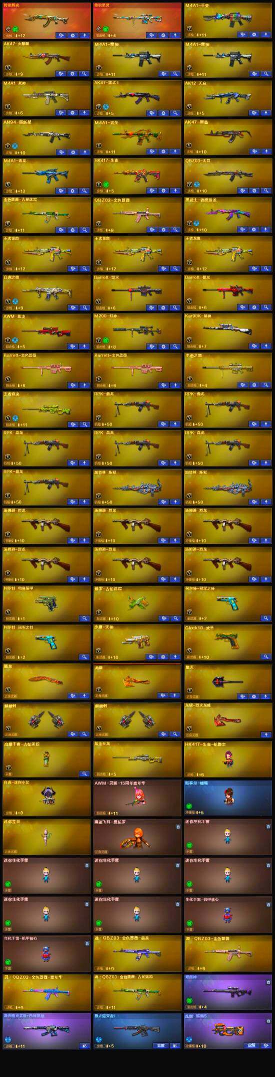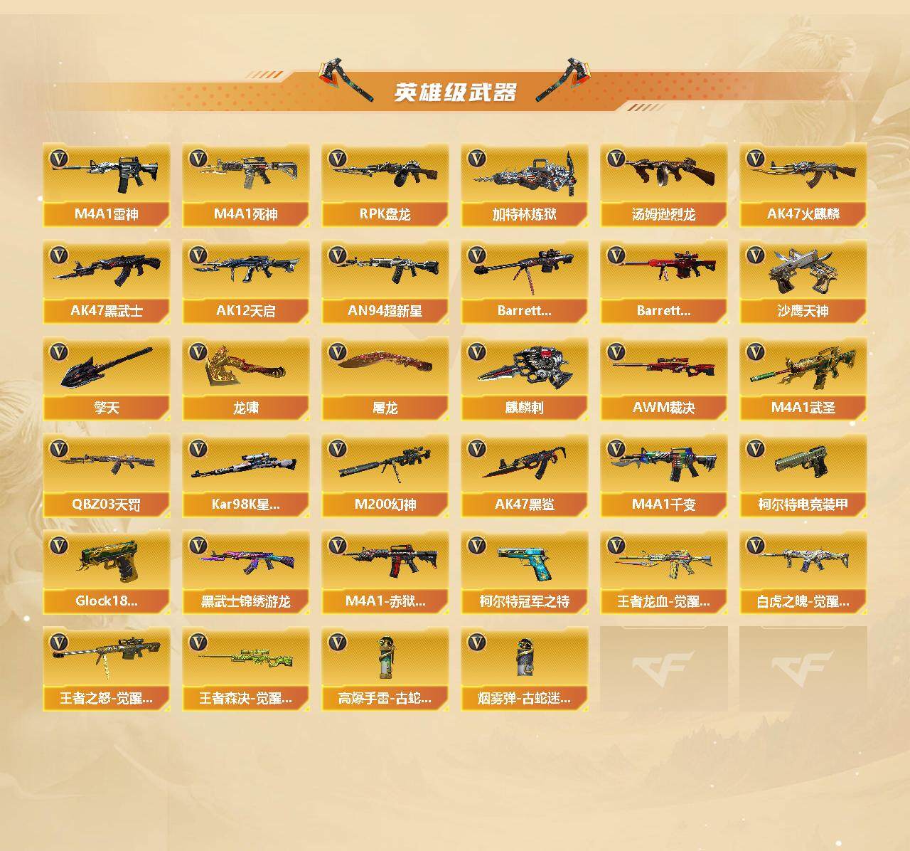 【英雄级武器】:M4A1-千变,AK47-火麒麟,M4A1-雷神*2,M4A1-死神,AK47-黑武士,AK12-天启,AN94-超新星,M4A1-武圣,AK47-黑鲨,M4A1-青龙,HK417-朱雀,QBZ03-天罚,黑武士-锦绣游龙,金色蔷薇-古蛇迷踪,QBZ03-金色蔷薇,王者龙血-觉醒版*3,白虎之魄-觉醒版,Barrett-毁灭,Barrett-极光,AWM-裁决,M200-幻神,Kar98K-星神,Barrett-金色蔷薇*2,王者之怒-觉醒版,王者森决-觉醒版,RPK-盘龙*6,加特林-炼狱*2,汤姆逊-烈龙*6,沙鹰-天神,柯尔特-冠军之特*2,柯尔特-电竞装甲,Glock18-武圣,修罗-古蛇迷踪,屠龙,龙啸,擎天,麒麟刺*2,高爆手雷-古蛇迷踪,烟雾弹-古蛇迷踪,M4A1-赤狱骑士