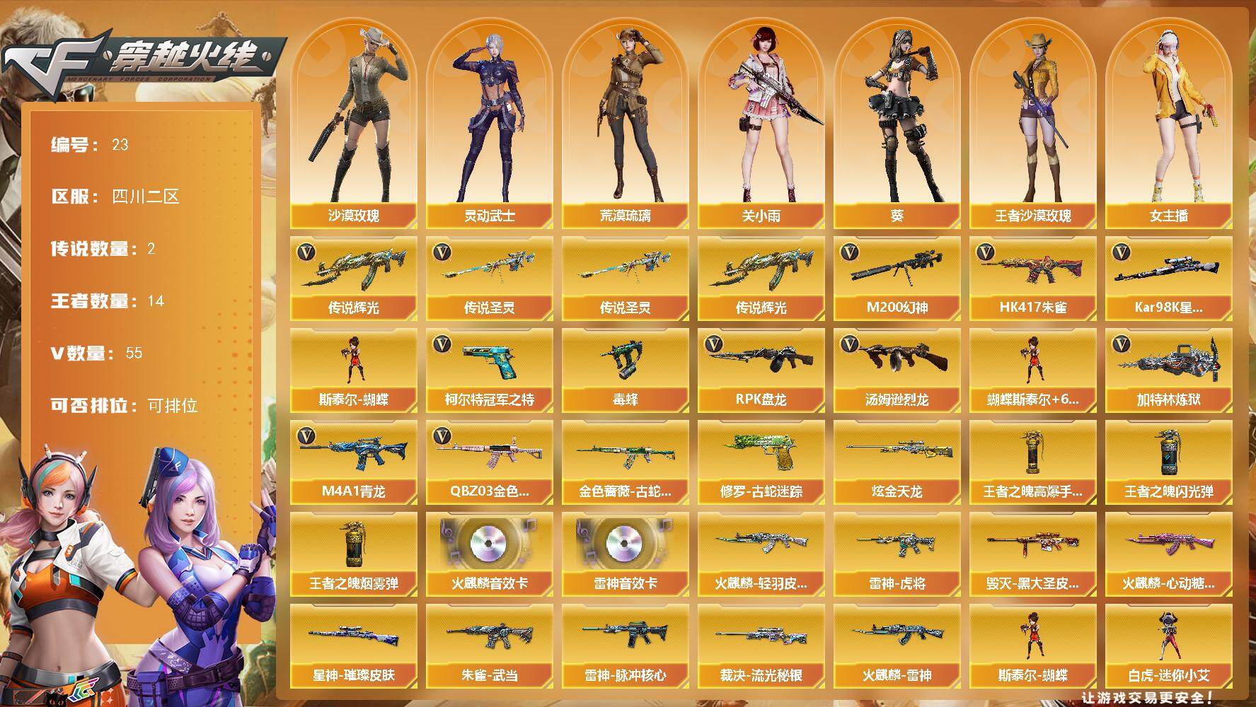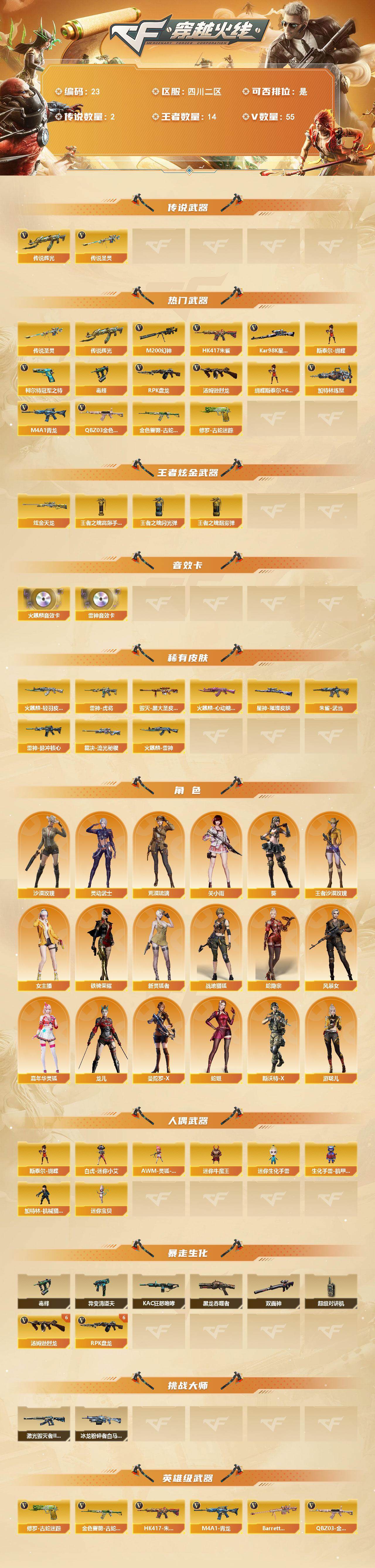 [13623374]四川二区-55V-14王者-1炫金 【传说武器】:传说辉光,传说圣灵 【热门武器】:传说圣灵,传说辉光,QBZ03-金色蔷薇,HK417-朱雀,M4A1-青龙,M200-幻神,金色蔷薇-古蛇迷踪,修罗-古蛇迷踪,柯尔特-冠军之特*2,Kar98K-星神,毒蜂,汤姆逊-烈龙*6,RPK-盘龙*6,加特林-炼狱*2,斯泰尔-蝴蝶 【王者炫金武器】:炫金天龙,王者之魄高爆手雷*2,王者之魄闪光弹*3,王者之魄烟雾弹*2 【音效卡】:AK47-火麒麟音效卡,M4A1-雷神音效卡 【皮肤】:裁决-流光秘银,星神-璀璨皮肤,雷神-虎将,雷神-脉冲核心,火麒麟-雷神,火麒麟-轻羽皮肤,火麒麟-心动糖果,毁灭-黑大圣皮肤,HK417-朱雀-武当 【角色】:葵,沙漠玫瑰,荒漠琉璃,关小雨,战地猎狐,王者沙漠玫瑰,蛇隐宗,风暴女*2,嘉年华灵狐,灵动武士,龙儿,曼陀罗-X,女主播,蛇姬,斯沃特-X,铁骑荣耀,新灵狐者,游珑儿 【人偶武器】:白虎-迷你小艾,迷你宝贝,斯泰尔-蝴蝶,加特林-机械猎手,AWM-灵狐-15周年嘉年华,迷你牛魔王,迷你生化手雷*6,生化手雷-机甲核心*2 【暴走生化】:毒蜂,异变清道夫,KAC-狂怒咆哮,黑龙吞噬者,双面神,超级对讲机 【挑战大师】:冰龙粉碎者-白马银枪,激光毁灭者III-白马银枪 【英雄级武器】:M4A1-千变,AK47-火麒麟,M4A1-雷神*2,M4A1-死神,AK47-黑武士,AK12-天启,AN94-超新星,M4A1-武圣,AK47-黑鲨,M4A1-青龙,HK417-朱雀,QBZ03-天罚,黑武士-锦绣游龙,金色蔷薇-古蛇迷踪,QBZ03-金色蔷薇,王者龙血-觉醒版*3,白虎之魄-觉醒版,Barrett-毁灭,Barrett-极光,AWM-裁决,M200-幻神,Kar98K-星神,Barrett-金色蔷薇*2,王者之怒-觉醒版,王者森决-觉醒版,RPK-盘龙*6,加特林-炼狱*2,汤姆逊-烈龙*6,沙鹰-天神,柯尔特-冠军之特*2,柯尔特-电竞装甲,Glock18-武圣,修罗-古蛇迷踪,屠龙,龙啸,擎天,麒麟刺*2,高爆手雷-古蛇迷踪,烟雾弹-古蛇迷踪,M4A1-赤狱骑士 【道具】:BS战队炫彩背包,云海游龙炫彩背包,古蛇迷踪炫彩背包,超级背包,终极猎手-秦魂将军,虚空终结者-暗域熔岩,救世主-黑桃战神,绿色巨人,灵魂忍者*2,变异宝