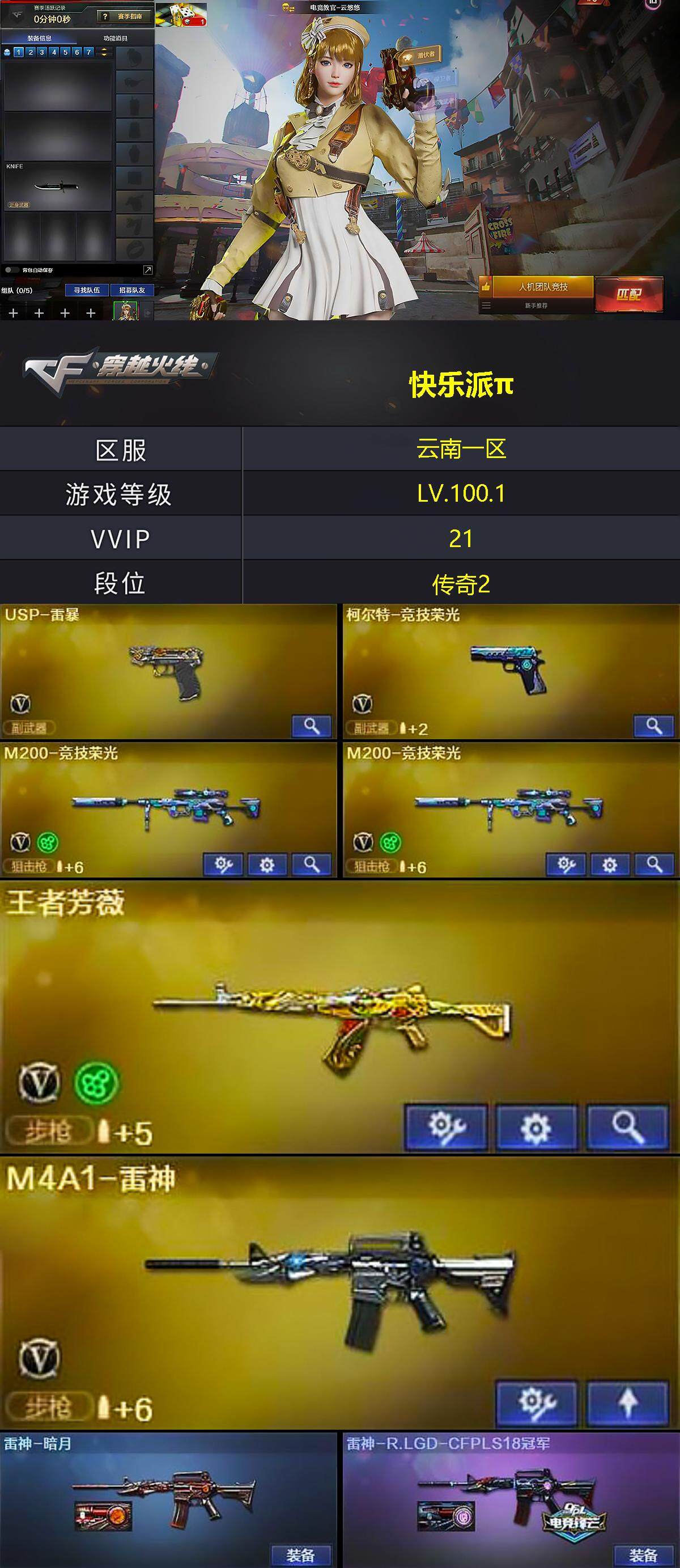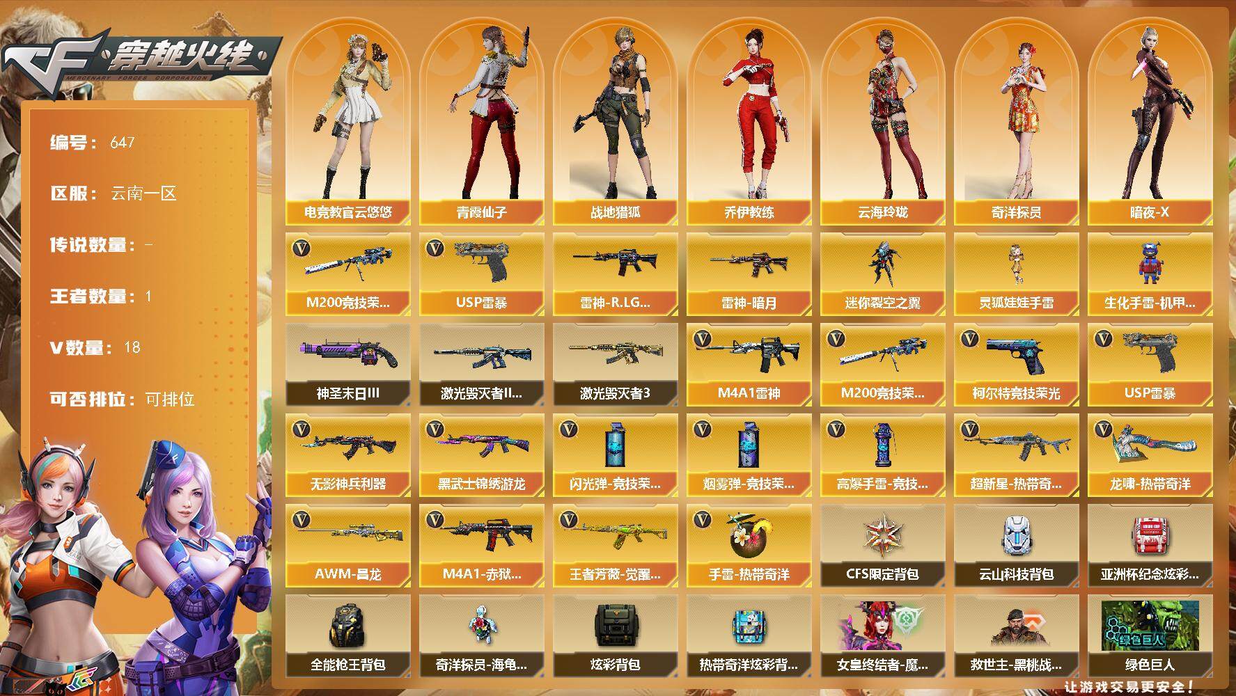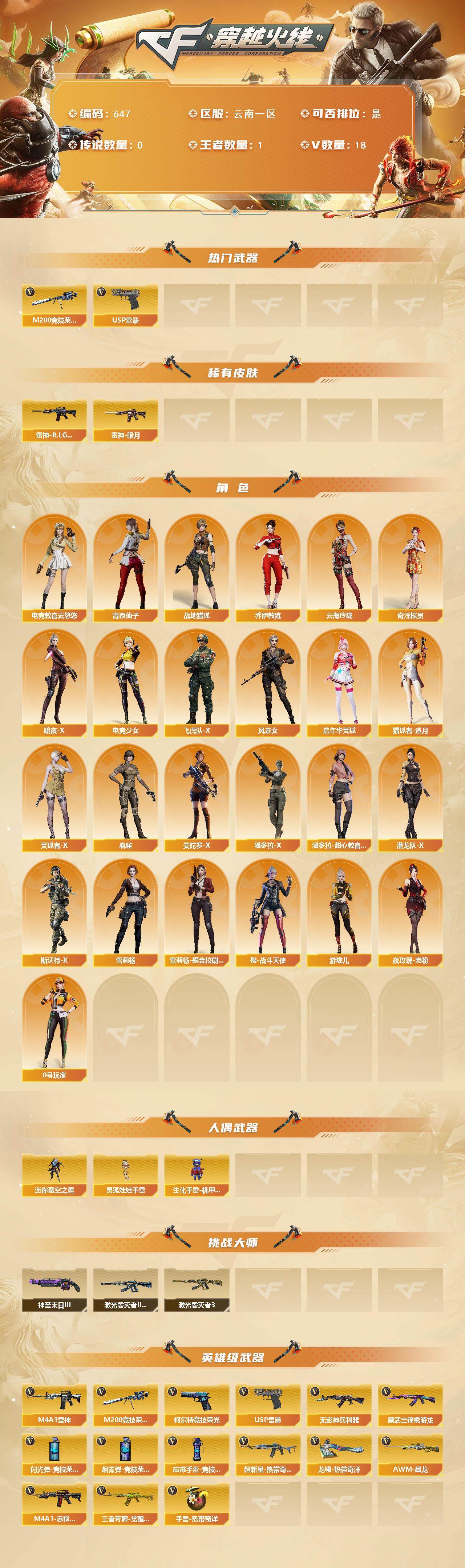 [13654914]云南一区-18V-1王者-0炫金 【热门武器】:M200-竞技荣光*2,USP-雷暴 【皮肤】:雷神-暗月,雷神-R.LGD-CFPLS18冠军 【角色】:电竞教官-云悠悠,战地猎狐,奇洋探员,乔伊教练,云海玲珑,暗夜-X,电竞少女,飞虎队-X,风暴女,嘉年华灵狐,猎狐者-追月,0号玩家,灵狐者-X,麻雀,曼陀罗-X,潘多拉-X,潘多拉-甜心教官,潜龙队-X,青霞仙子,斯沃特-X,雪莉杨,雪莉杨-摸金校尉,夜玫瑰-宠粉,樱-战斗天使,游珑儿 【人偶武器】:迷你裂空之翼,生化手雷-机甲核心*6,灵狐娃娃手雷 【挑战大师】:激光毁灭者III-白马银枪*2,激光毁灭者III,神圣爆裂者-末日III 【英雄级武器】:M4A1-雷神,无影-神兵利器,黑武士-锦绣游龙,超新星-热带奇洋,王者芳薇-觉醒版,M200-竞技荣光*2,USP-雷暴,柯尔特-竞技荣光,龙啸-热带奇洋,高爆手雷-竞技荣光*3,手雷-热带奇洋,闪光弹-竞技荣光*2,烟雾弹-竞技荣光*3,M4A1-赤狱骑士,AWM-昌龙 【道具】:CFS限定背包,云山科技背包,亚洲杯纪念炫彩背包,全能枪王背包,奇洋探员-海龟背包,炫彩背包,热带奇洋炫彩背包,女皇终结者-魔龙之吻,救世主-黑桃战神,黄金生化钩,绿色巨人,灵魂忍者*2,迷雾幽灵,夺命之镰,防化服*3,金色流光-枪王排位*2,星辰流光-枪王排位,巅峰赛先锋-金色流光,流光-再燃火线,枪王排位28赛季金色流光,枪王排位29赛季金色流光,热带奇洋表情,EP战队名片,EP战队喷图,EP战队击杀图标,C4-再燃火线,防弹头盔*3,防弹衣*3,C4工具钳*3,手雷包*3 【特殊枪械】: