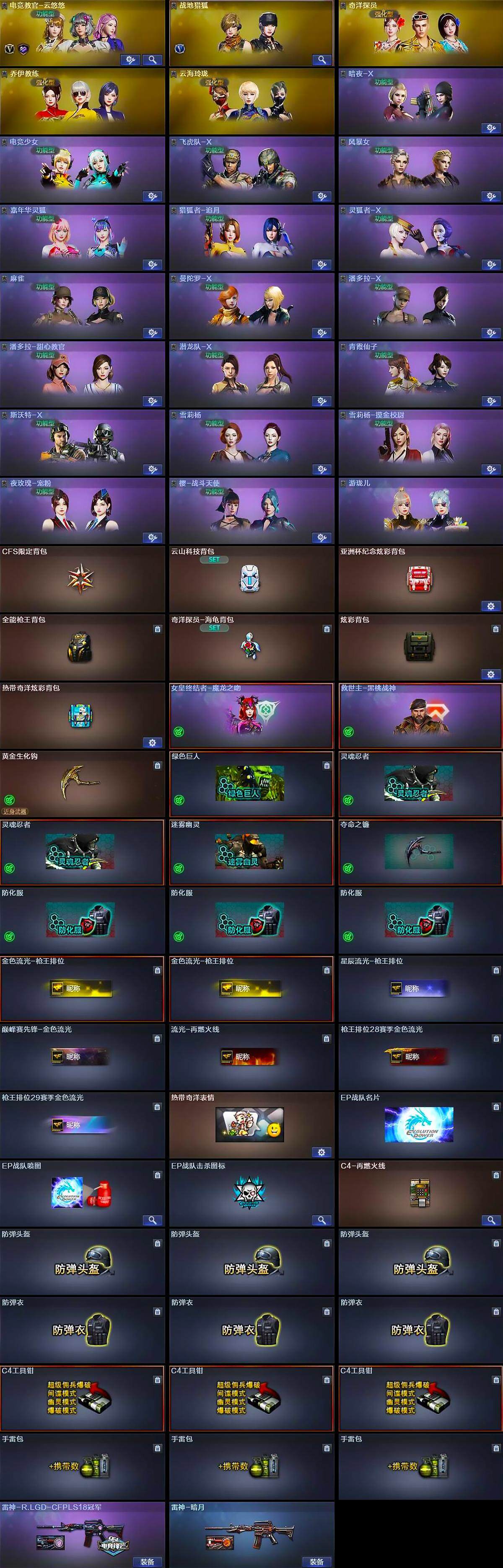 【道具】:CFS限定背包,云山科技背包,亚洲杯纪念炫彩背包,全能枪王背包,奇洋探员-海龟背包,炫彩背包,热带奇洋炫彩背包,女皇终结者-魔龙之吻,救世主-黑桃战神,黄金生化钩,绿色巨人,灵魂忍者*2,迷雾幽灵,夺命之镰,防化服*3,金色流光-枪王排位*2,星辰流光-枪王排位,巅峰赛先锋-金色流光,流光-再燃火线,枪王排位28赛季金色流光,枪王排位29赛季金色流光,热带奇洋表情,EP战队名片,EP战队喷图,EP战队击杀图标,C4-再燃火线,防弹头盔*3,防弹衣*3,C4工具钳*3,手雷包*3